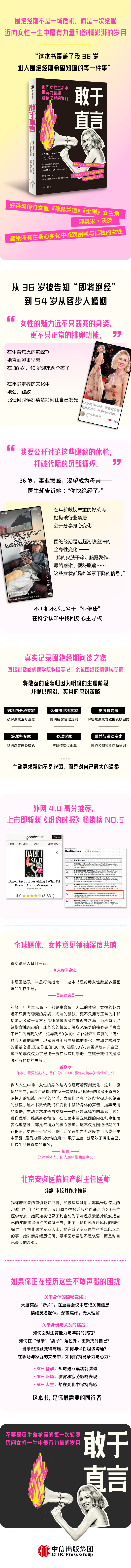 我们完全可以重新定义这段人生,这也将是女性一生中有力量和激情澎湃的岁月。这本书曾是娜奥米在诊室外惊恐无助时渴望拥有的指南,如今,它是献给每一位女性的勇气与陪伴之书。每个年龄阶段的女性都能恣意而真实地生活。