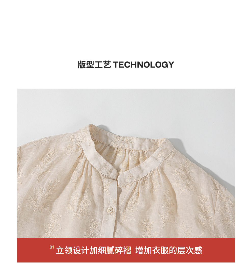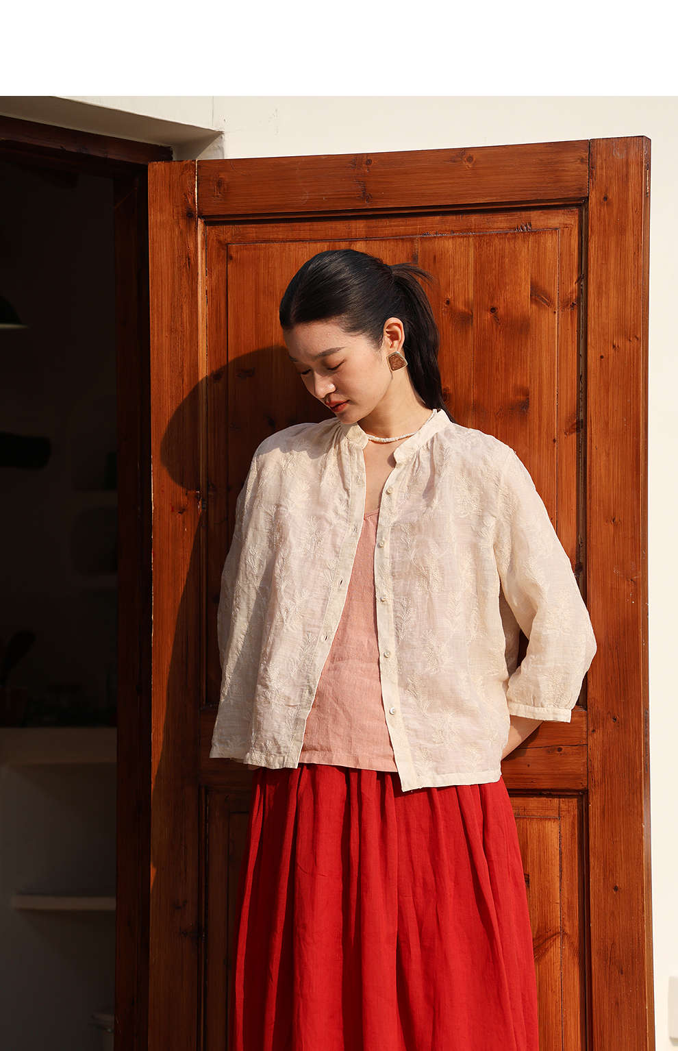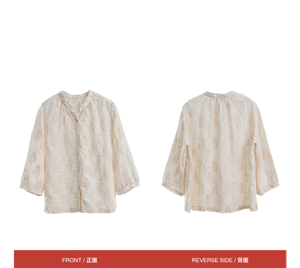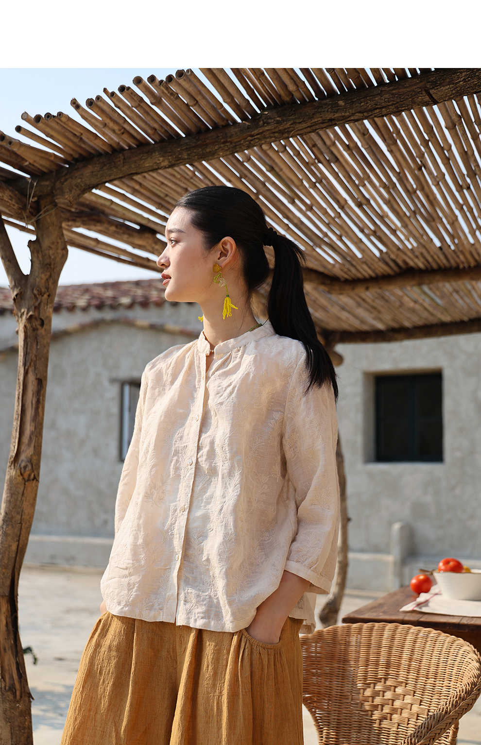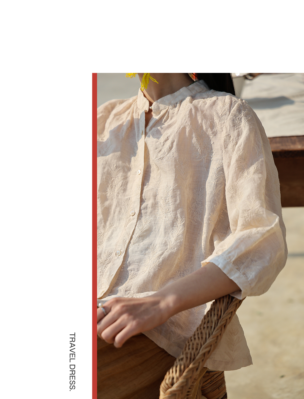 绽放旅行女装268朵/苎麻底绣花立领开襟七分袖衬衫温柔百搭开衫女