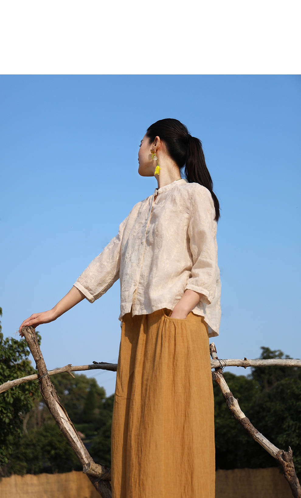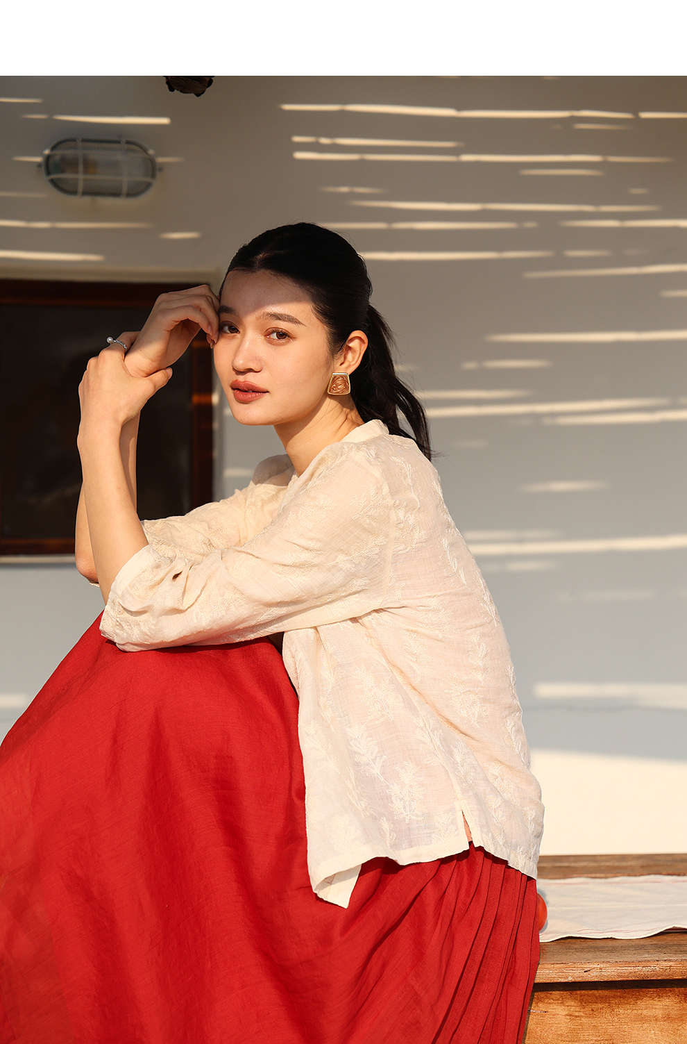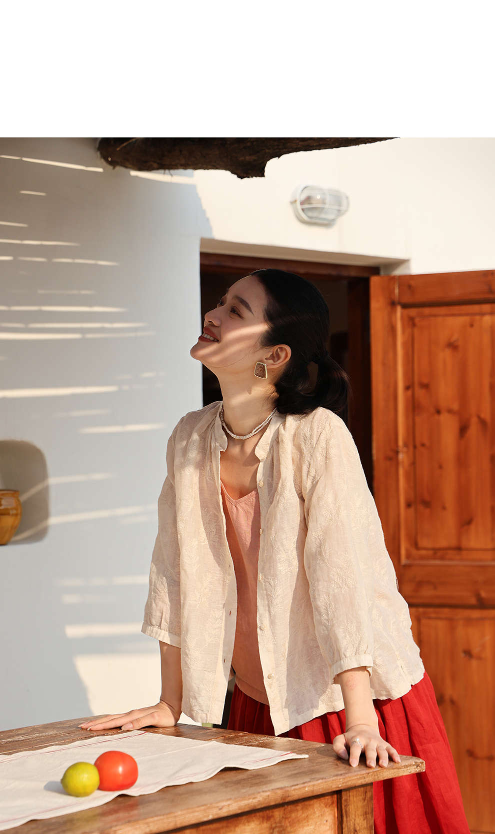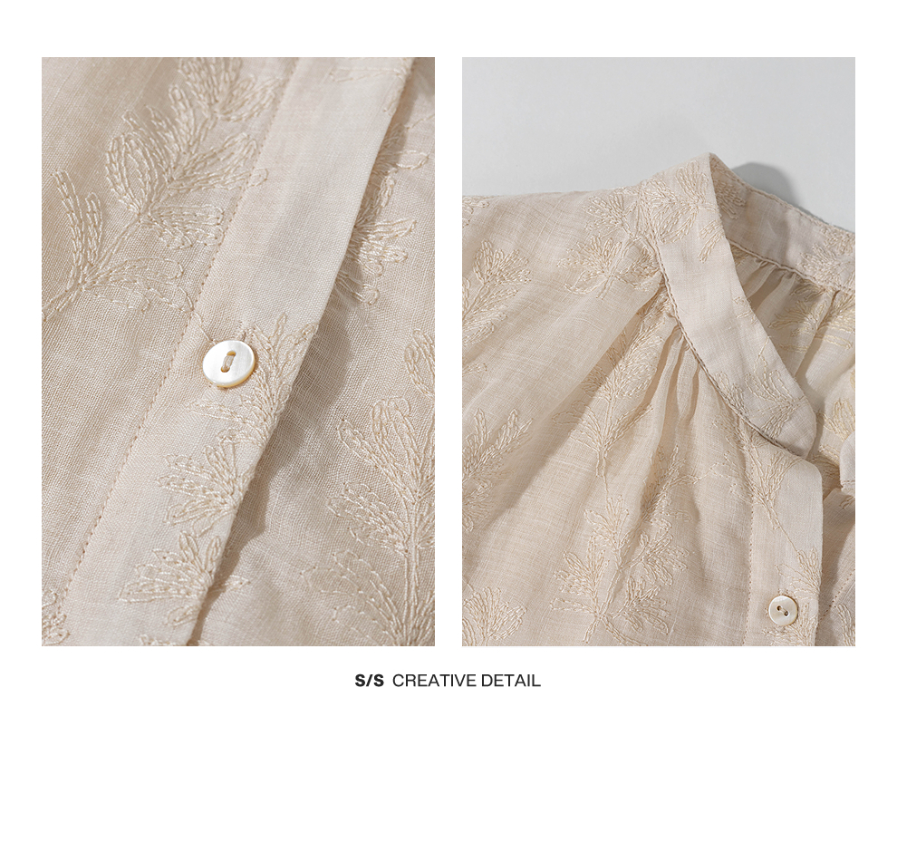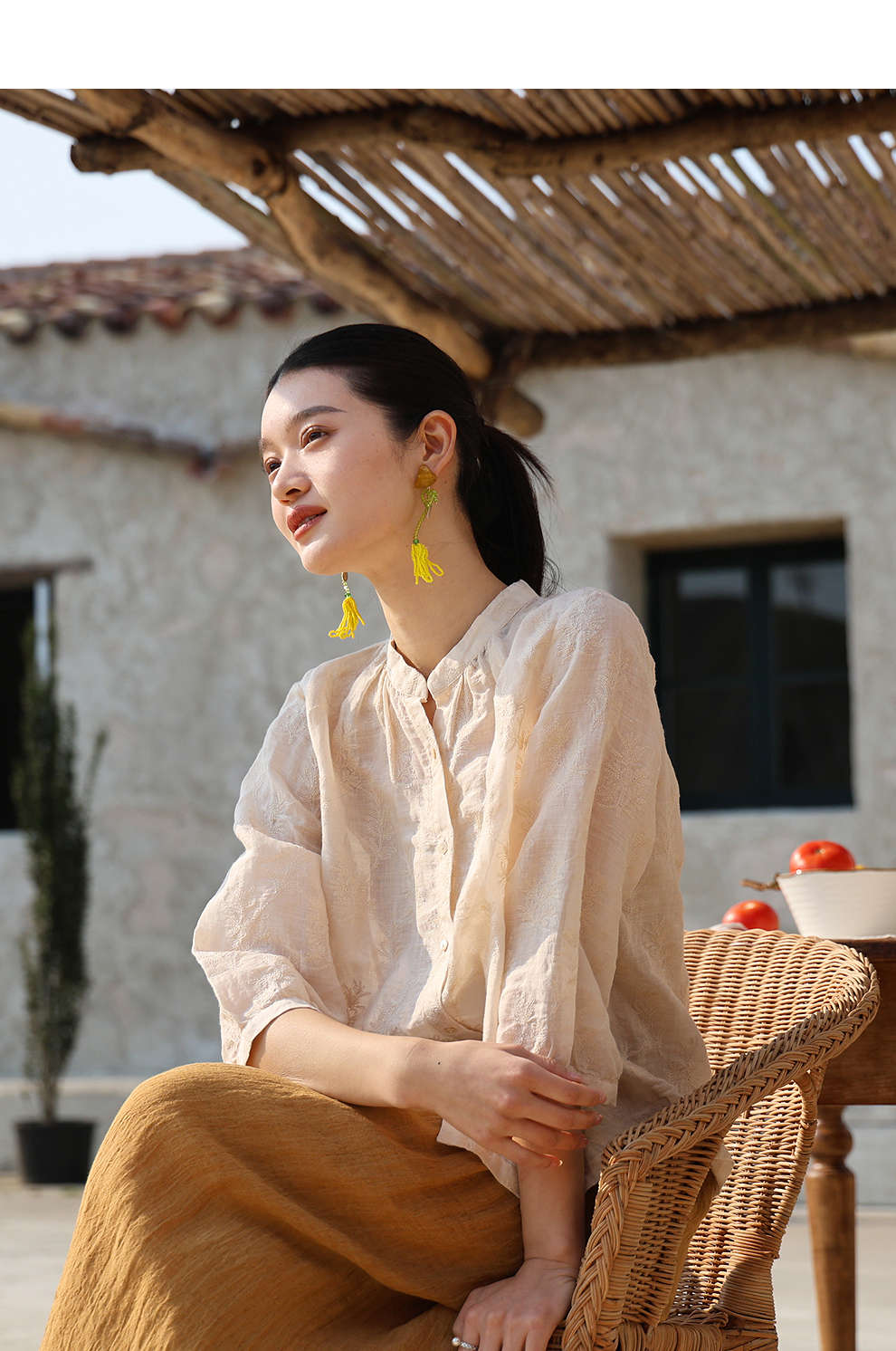 绽放旅行女装268朵/苎麻底绣花立领开襟七分袖衬衫温柔百搭开衫女