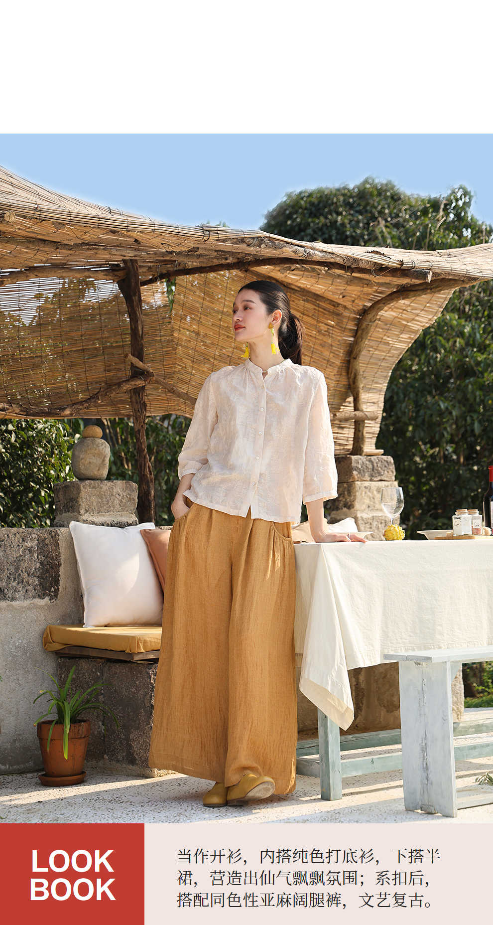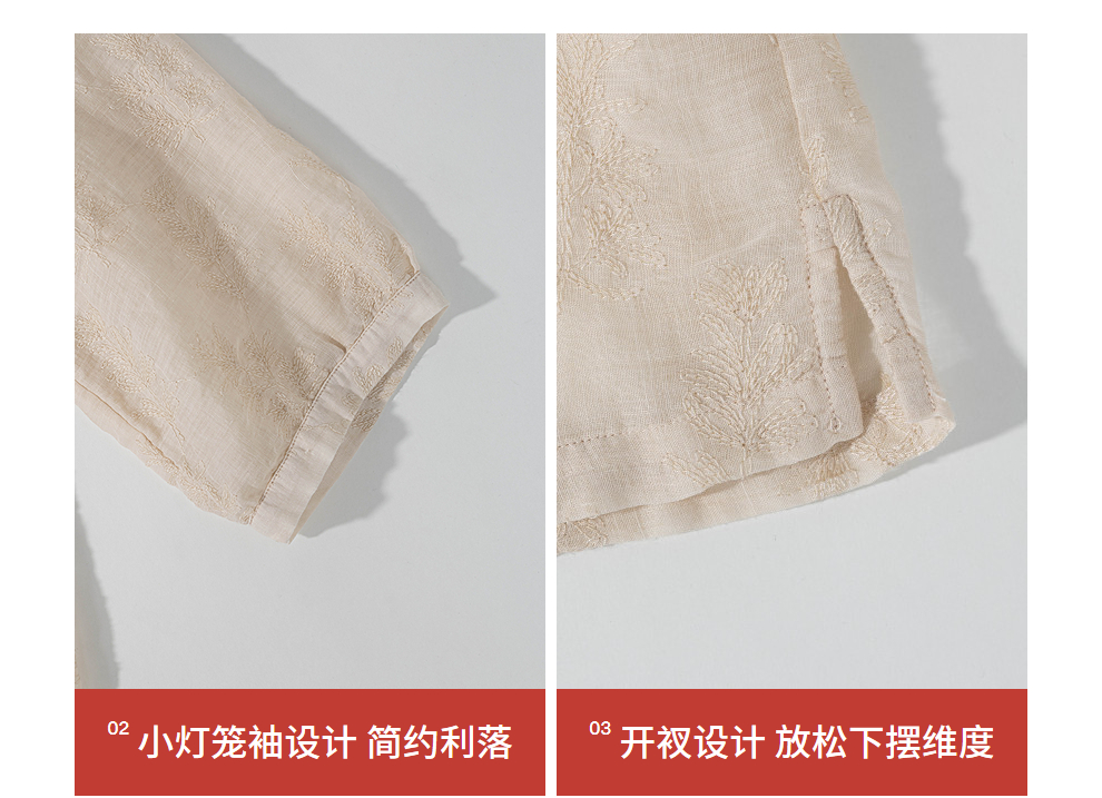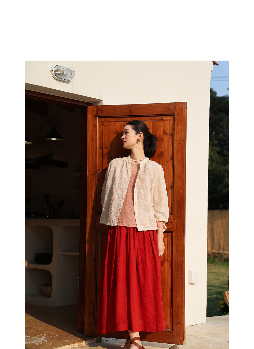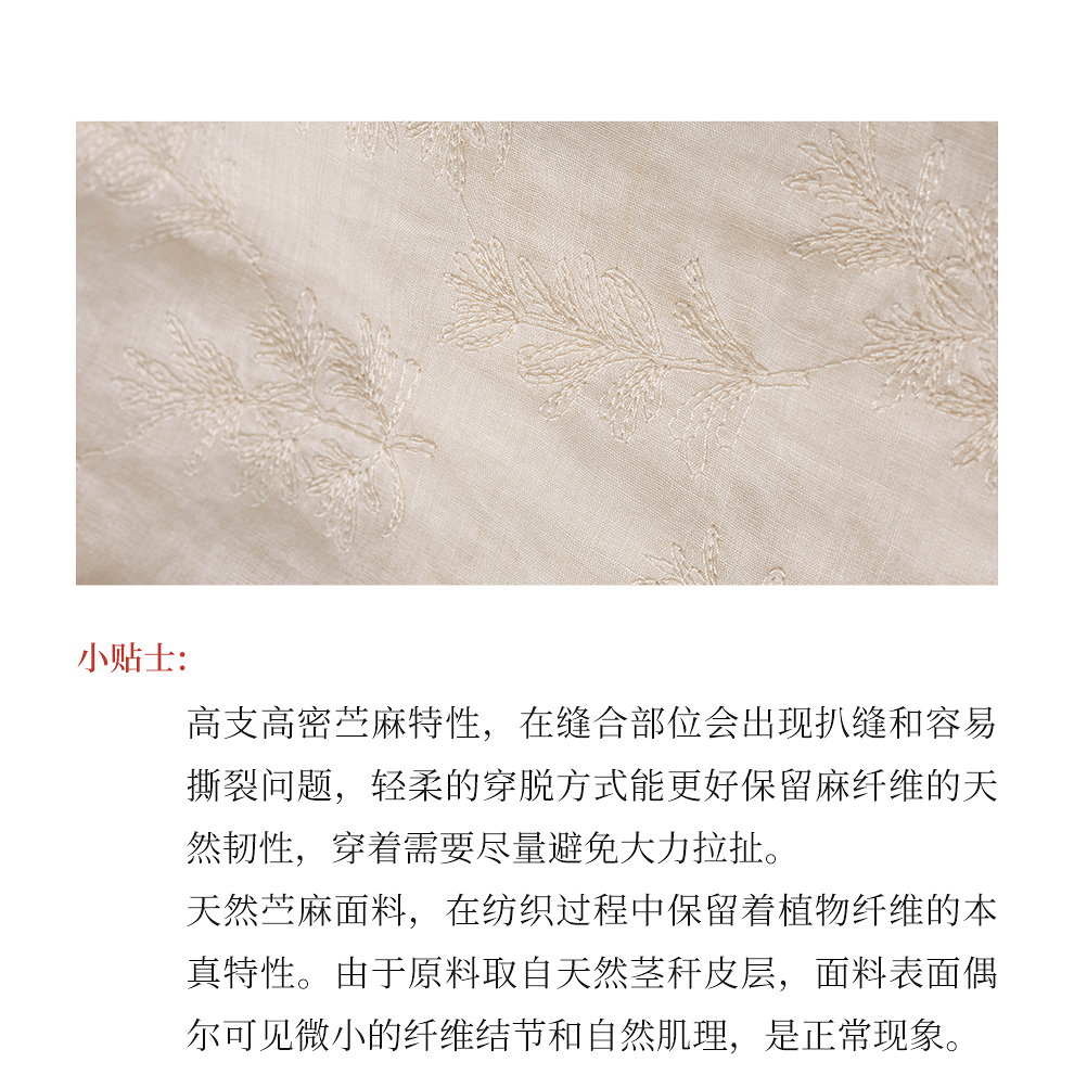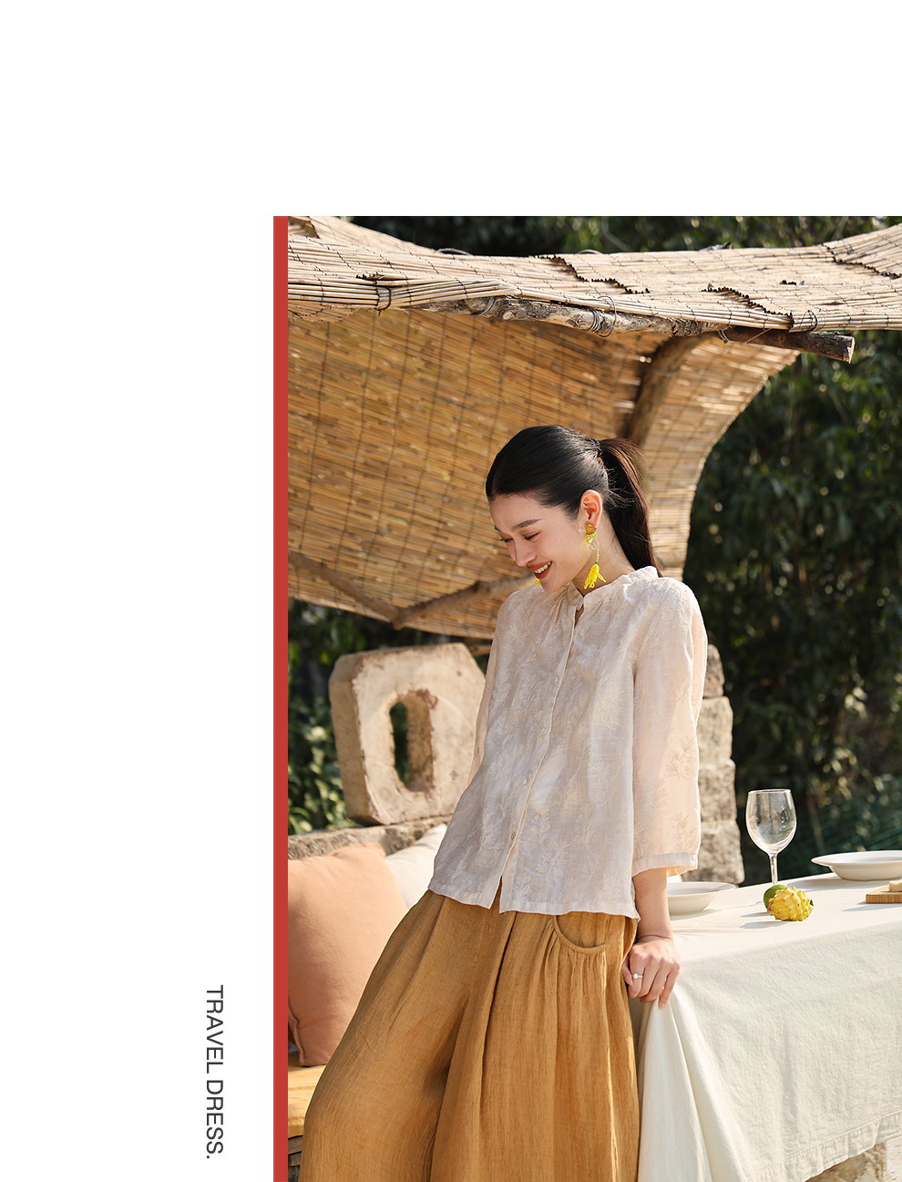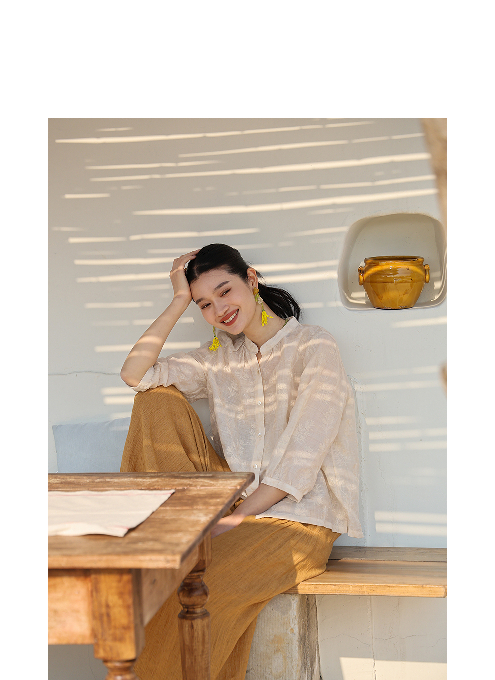 绽放旅行女装268朵/苎麻底绣花立领开襟七分袖衬衫温柔百搭开衫女