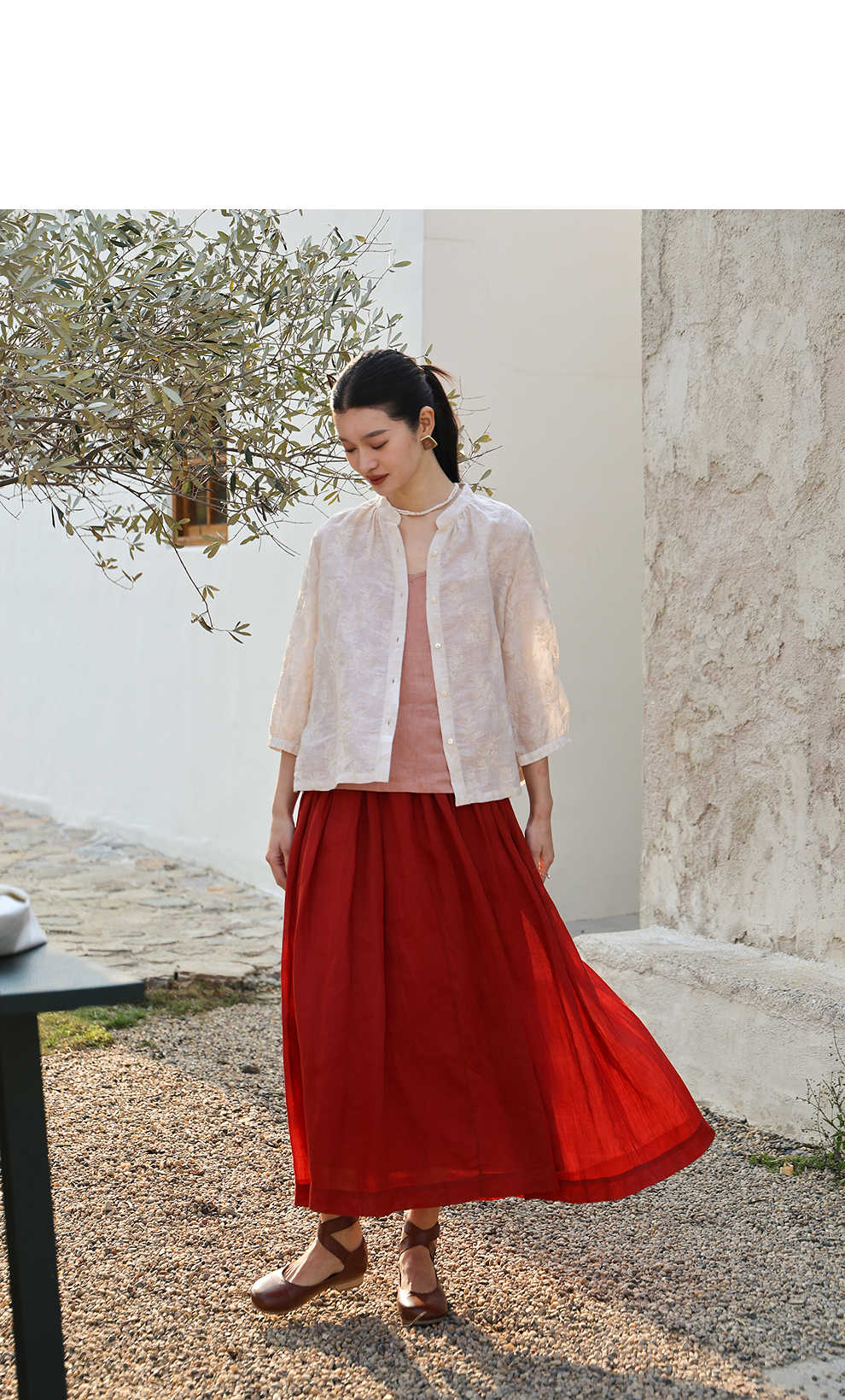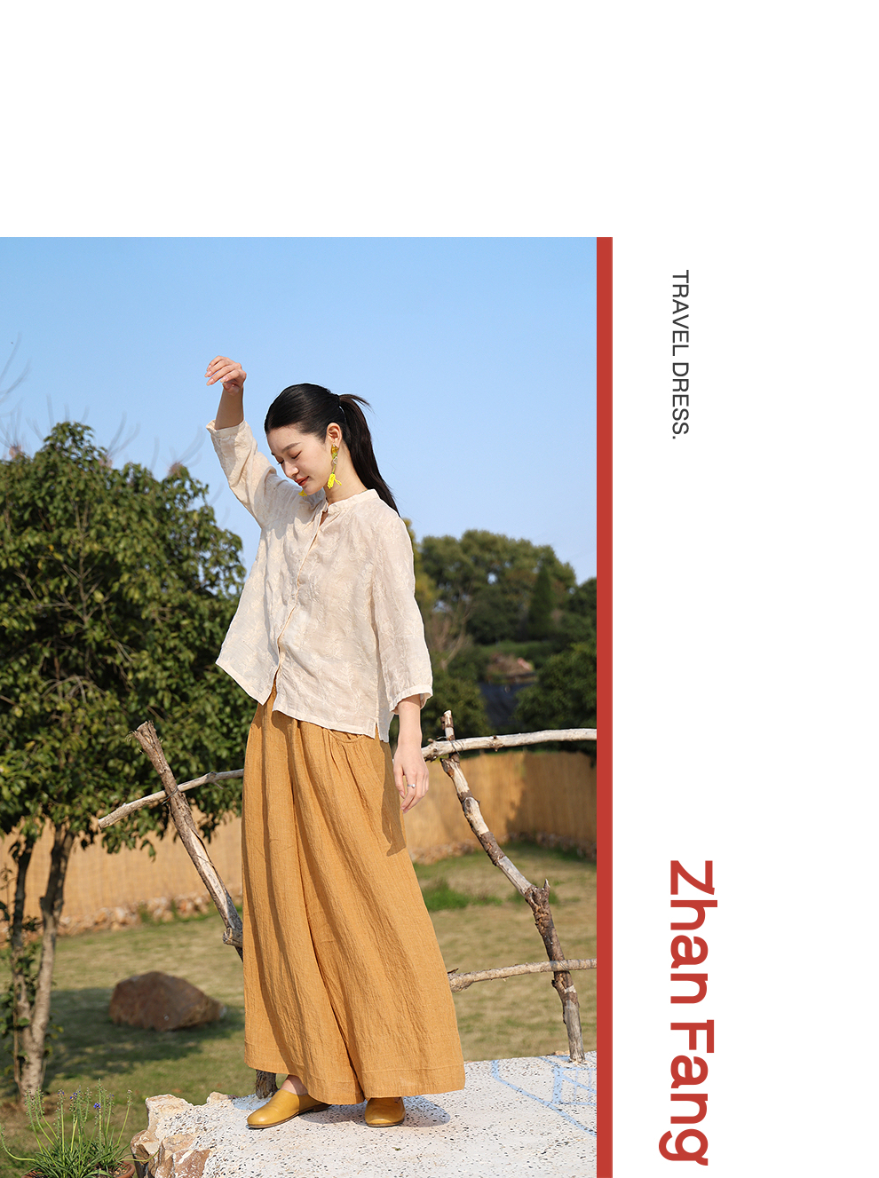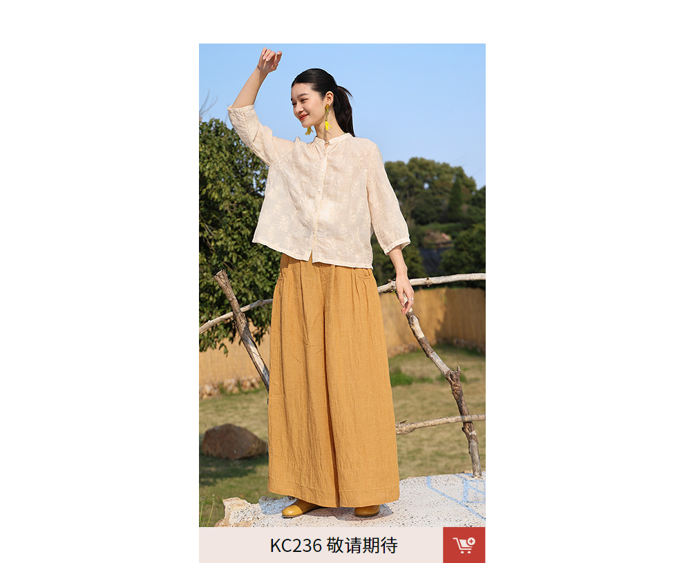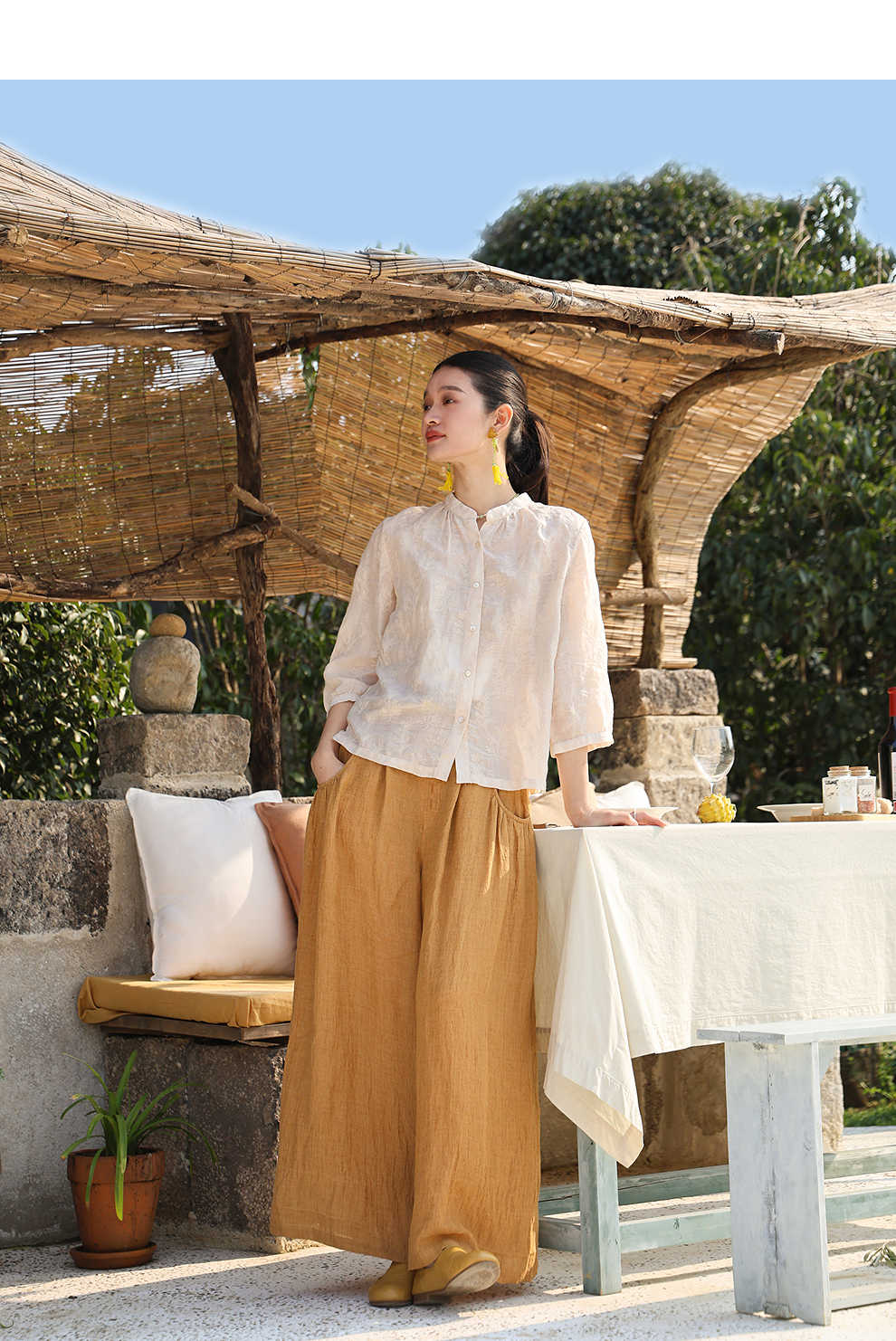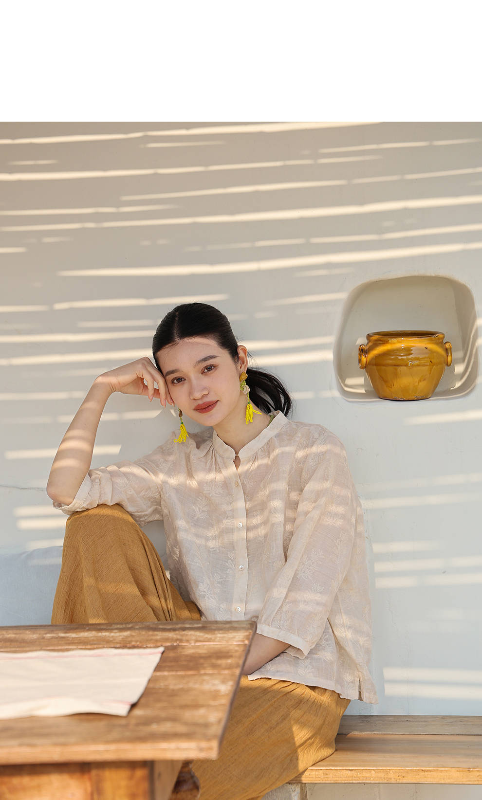 绽放旅行女装268朵/苎麻底绣花立领开襟七分袖衬衫温柔百搭开衫女