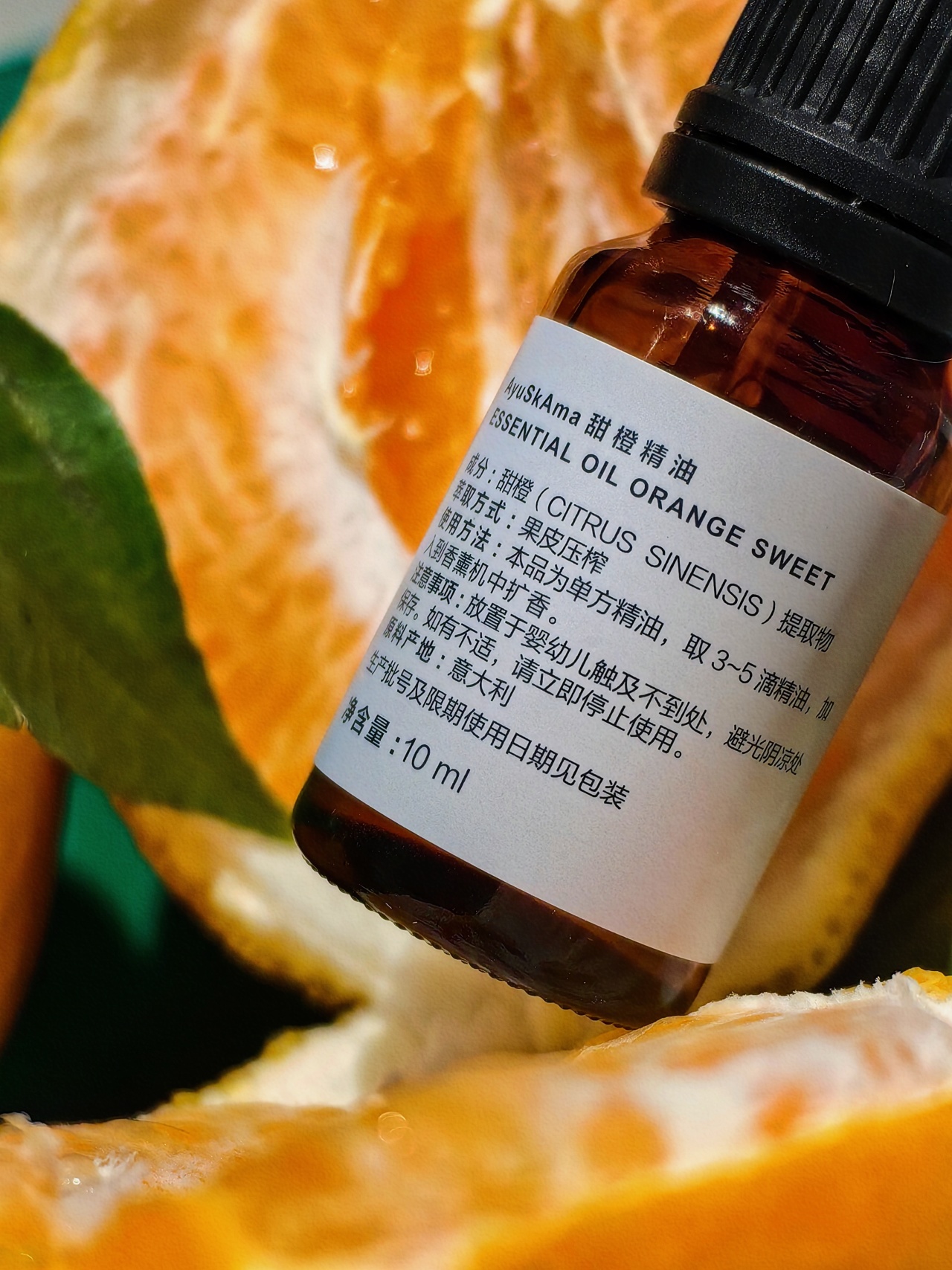苦橙的气味,兼有橙花的轻盈、苦橙叶的苦涩,比起单纯的甜橙多了一些细微的层次。但甜橙气味更为甜美,让人感觉圆润温暖,充满了阳光的气息。自古即深获众人喜爱,很适合与肉桂、丁香花苞等香料类精油调合,在寒冬中带来暖意,去秽纳喜。