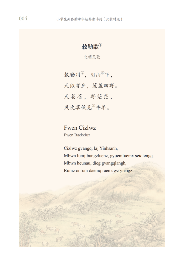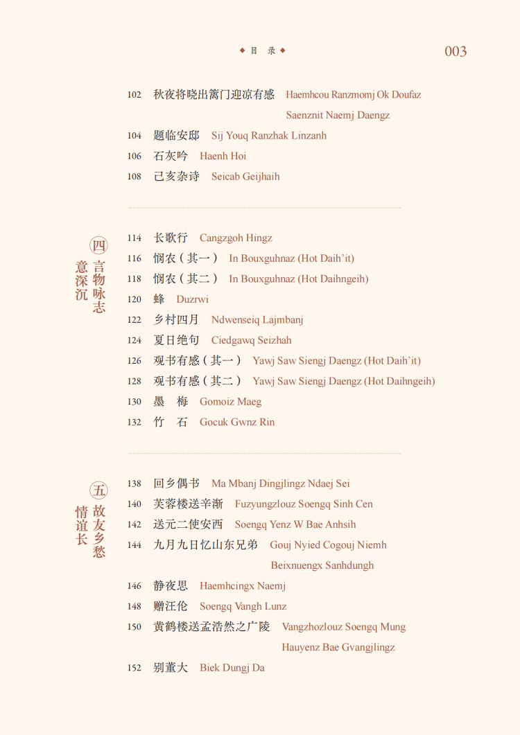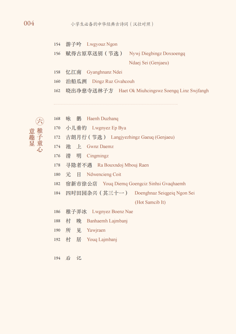 《义务教育语文课程标准》最新要求,以小学课本内收录的诗词为主体,精选能够反映各族人民共同缔造伟大祖国的历史进程、展现各民族交往交流交融生动事实、被儿童喜爱的中华经典诗词,按;山川壮美映诗篇;天地万象画卷美;拳拳爱国赤子心;言物咏志意深沉;故友乡愁情谊长;稚子童心意趣显等主题分辑,按汉壮双语对照编排,配全书汉壮双语音频。