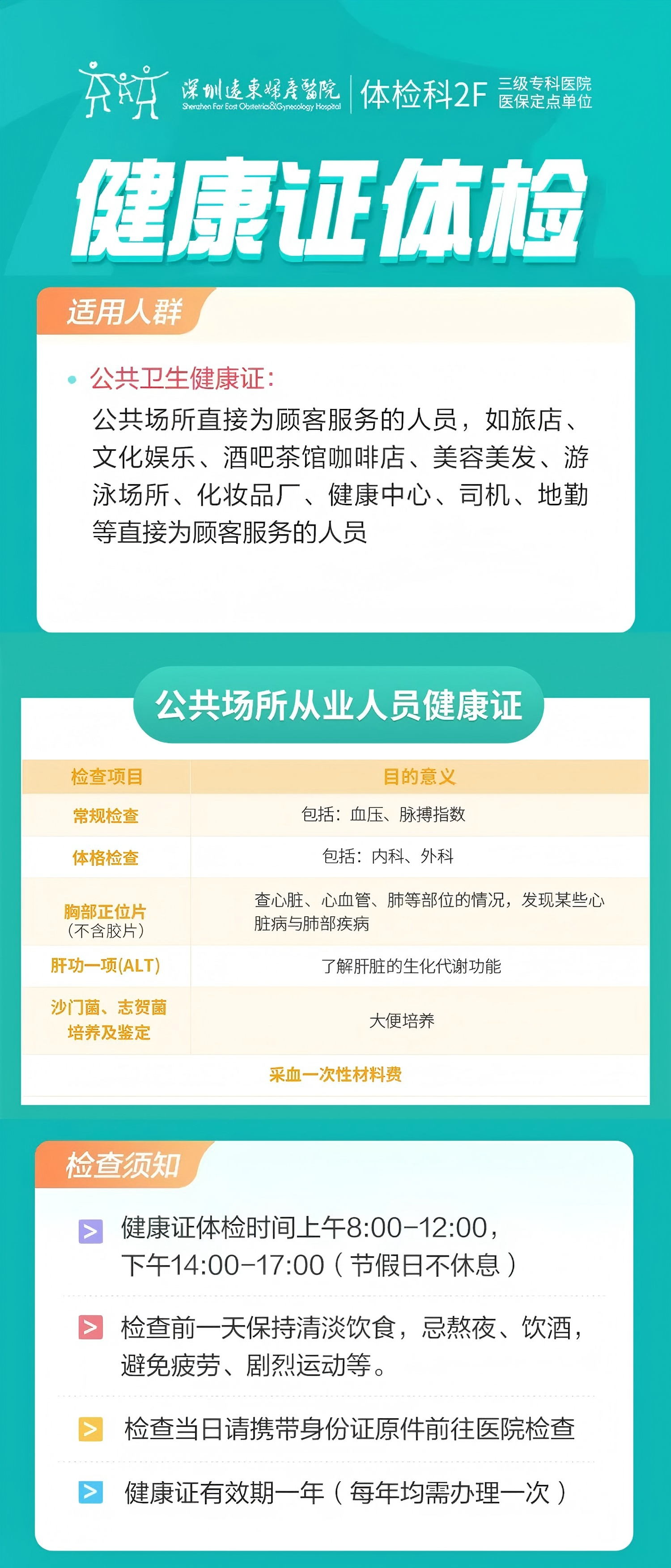 公共场所从业人员健康证 --远东罗湖院区-体检科-(带身份证原价即可,不用带照片)