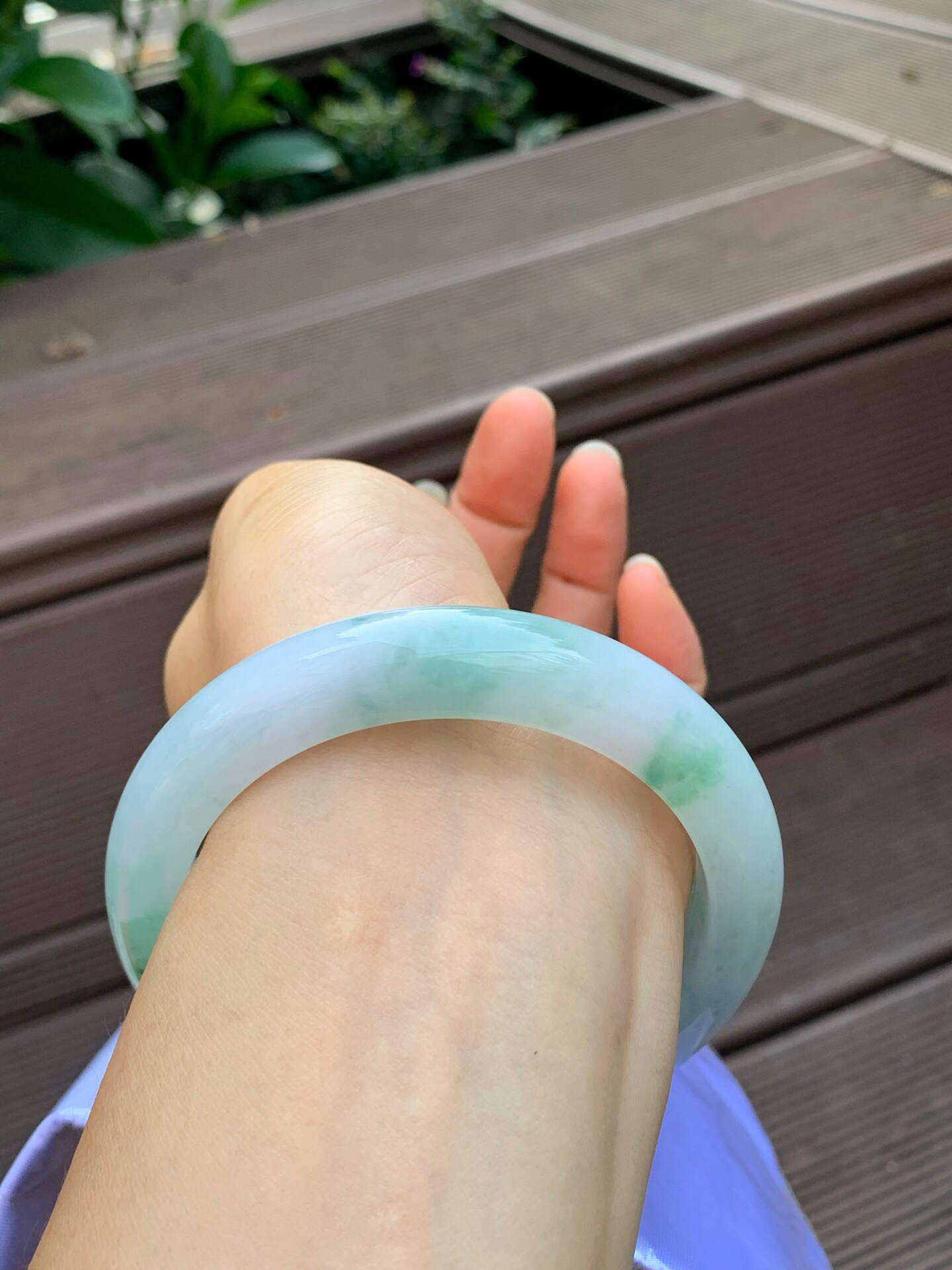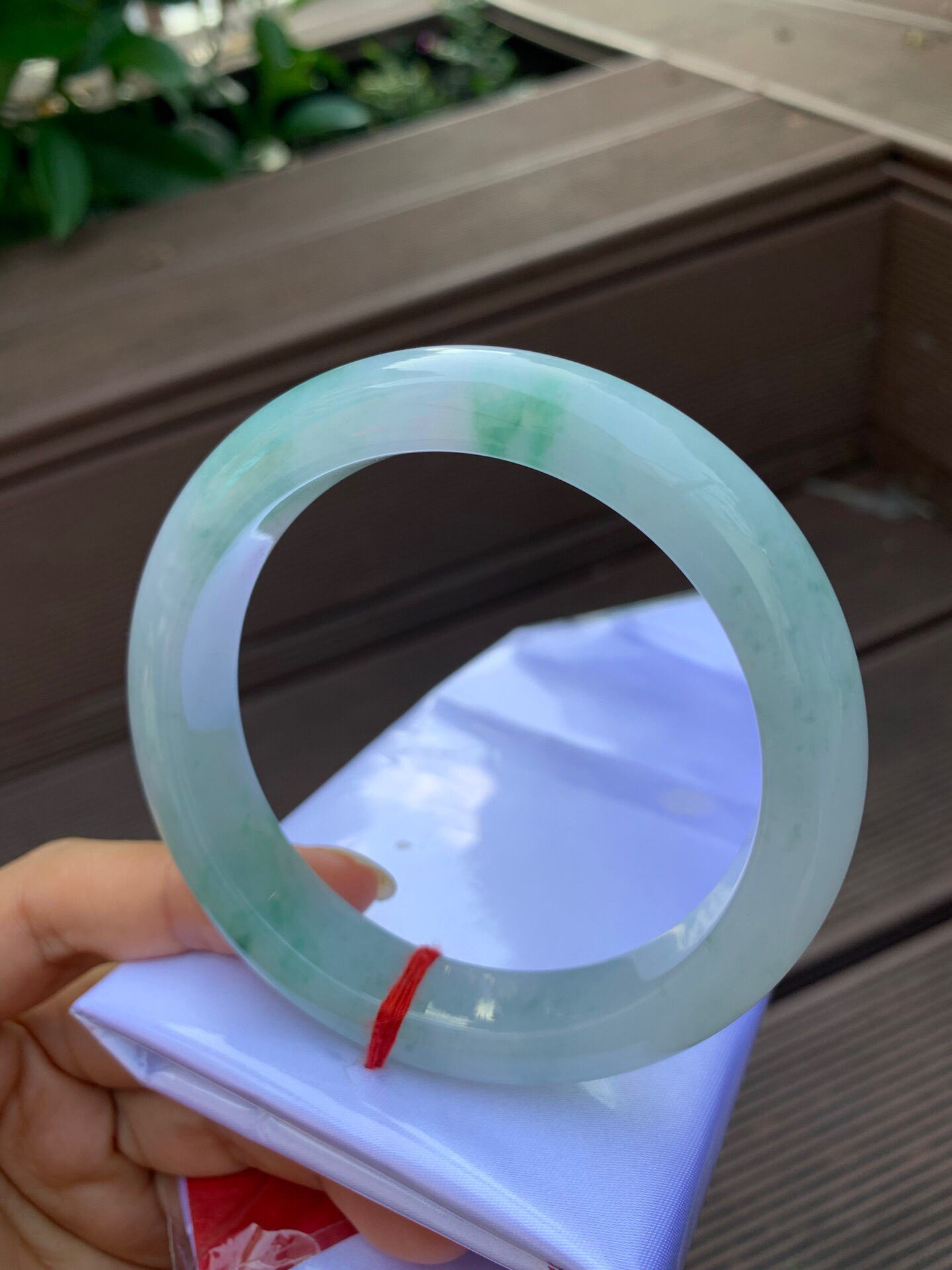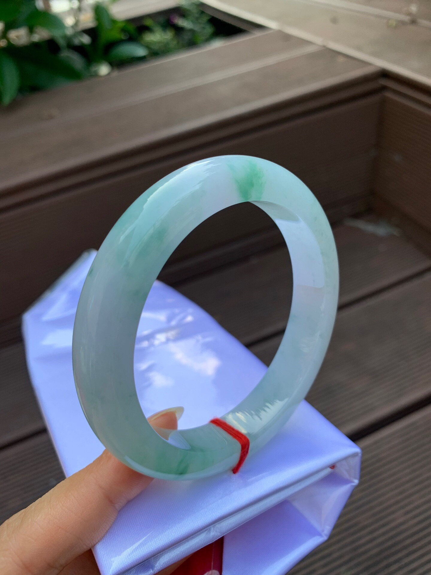 620518,61.5圈口,糯化飘花正圈平安镯,淡底色飘绿花,种老水足,尺寸:61.5-13-9.7,超值价💰31500 #优石客珠宝#香玉荟萃