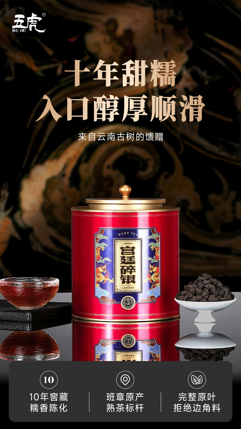 五虎茶叶 碎银号子 普洱茶 熟茶 茶叶 糯香云南 茶化石 茶饮 250g(买1送1共500g,配手提袋)