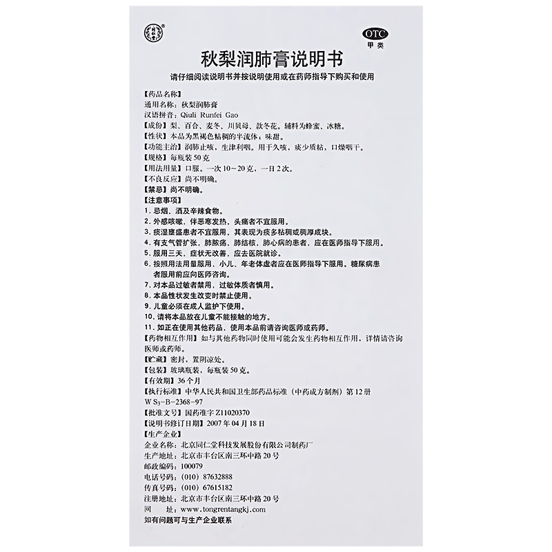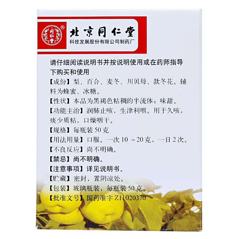 同仁堂秋梨润肺膏50g润肺止咳生津清肺化痰利咽咽干口燥咽干咳药