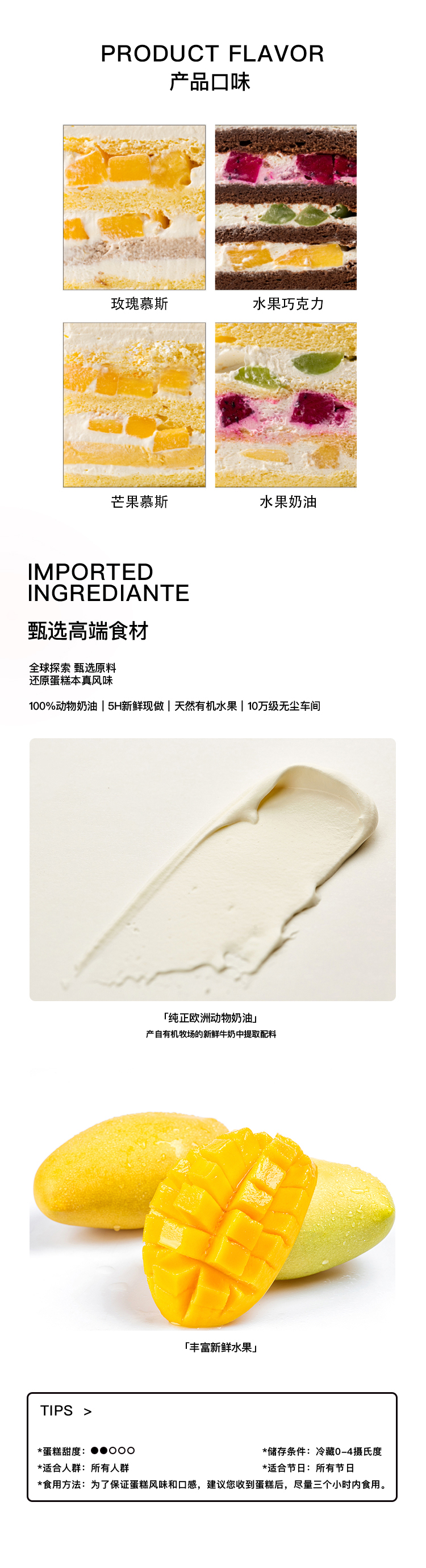 慕斯版夹心水果为:芒果,芒果奶油慕斯为百香果慕斯