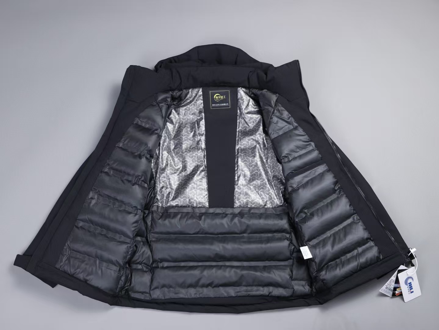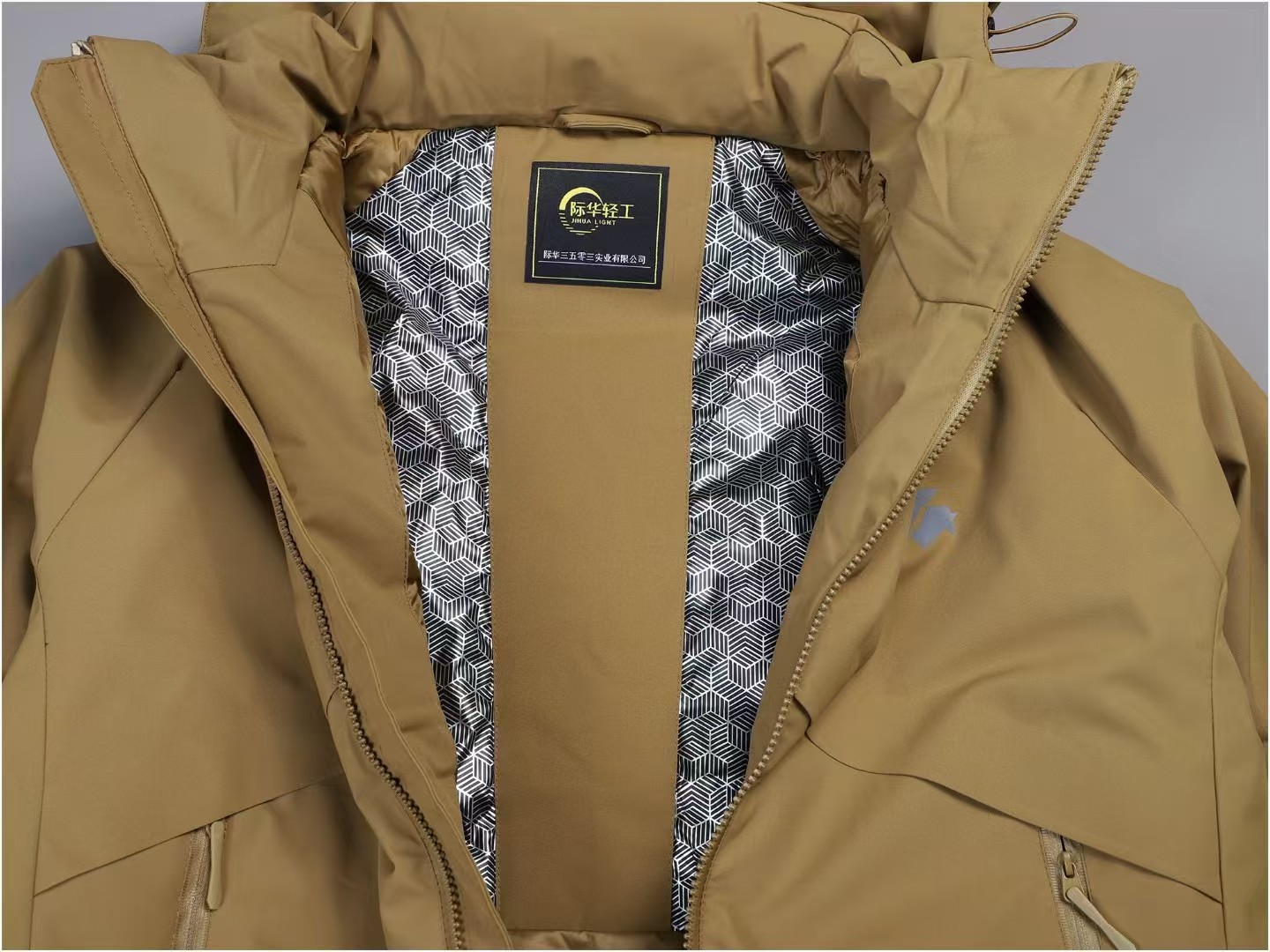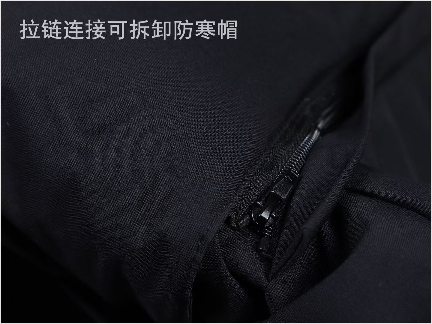 帽子可拆卸,面料采用三防科技面料,防风防水防污渍。填充物采用聚酰亚胺科技棉,源自宇航服核心材料,抗寒能力更加出色。里料采用石墨烯面料,双重锁温抗寒。带有正规质检报告,专利授权,商标资质。