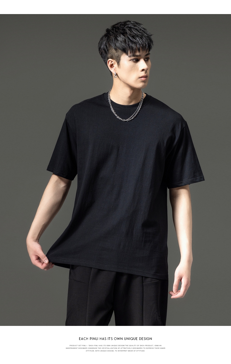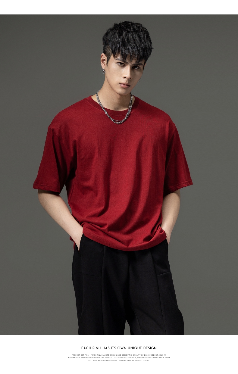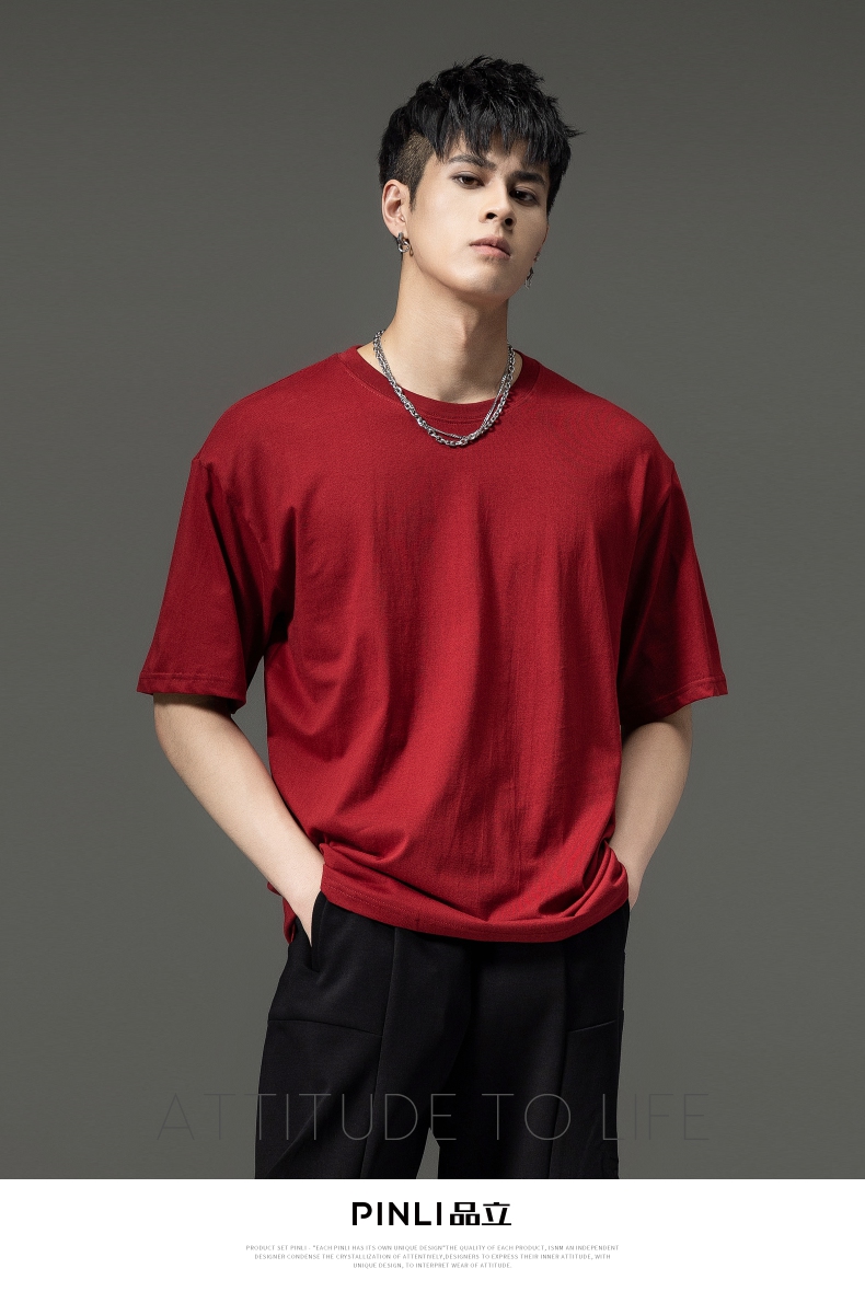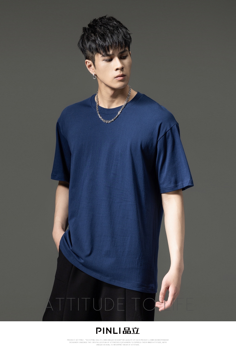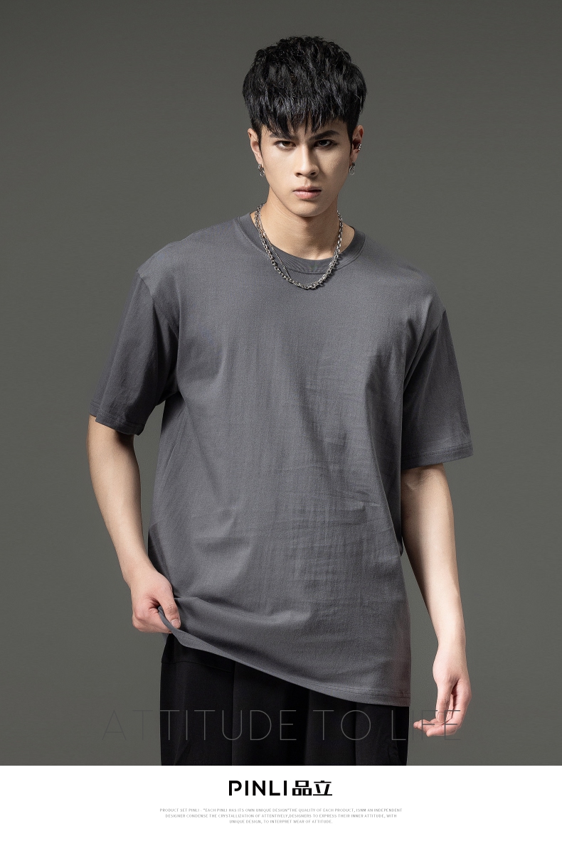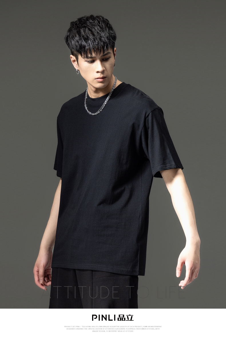 PINLI品立夏季新款男士圆领落肩纯色短袖T恤上衣GD232111322