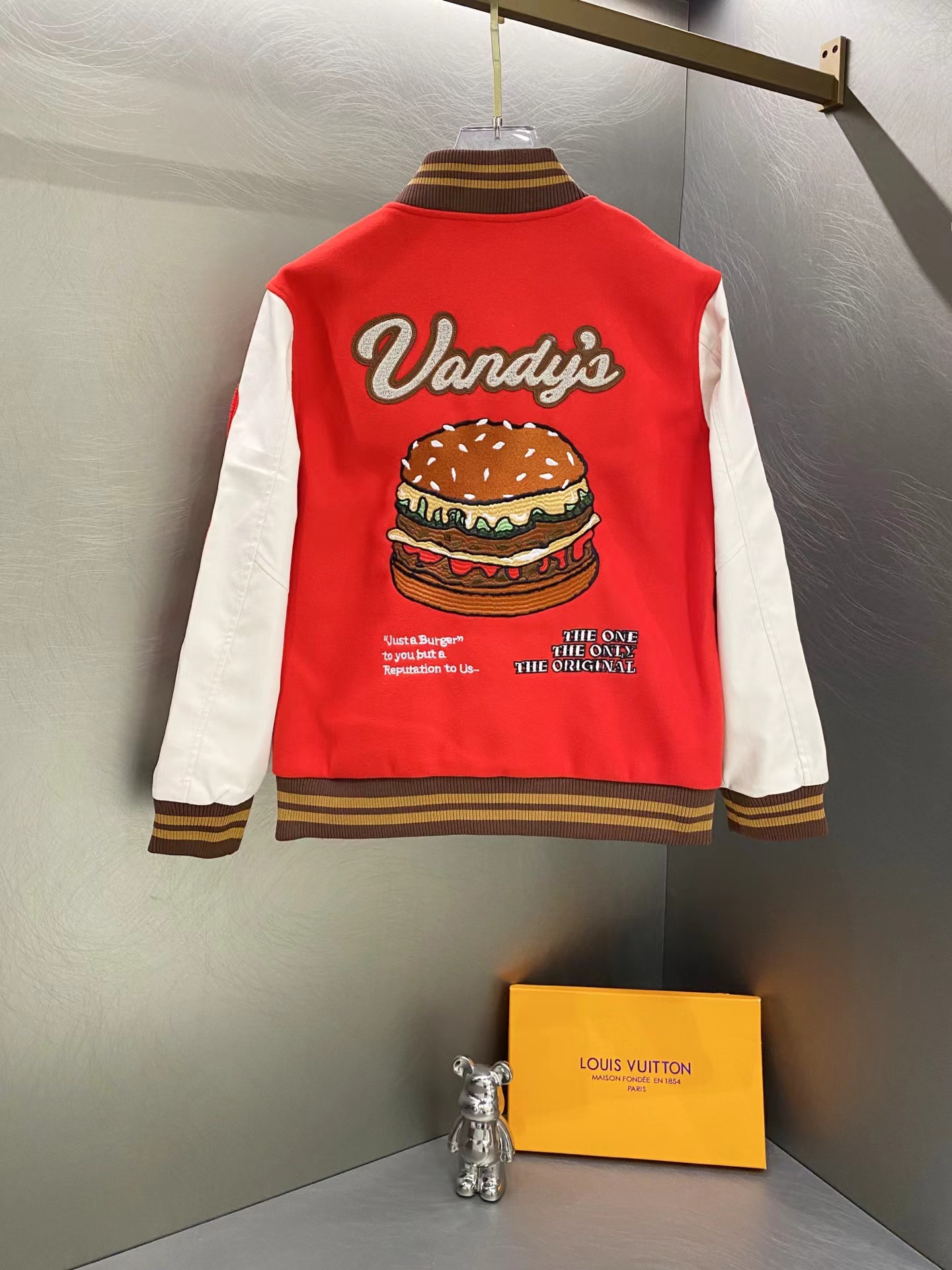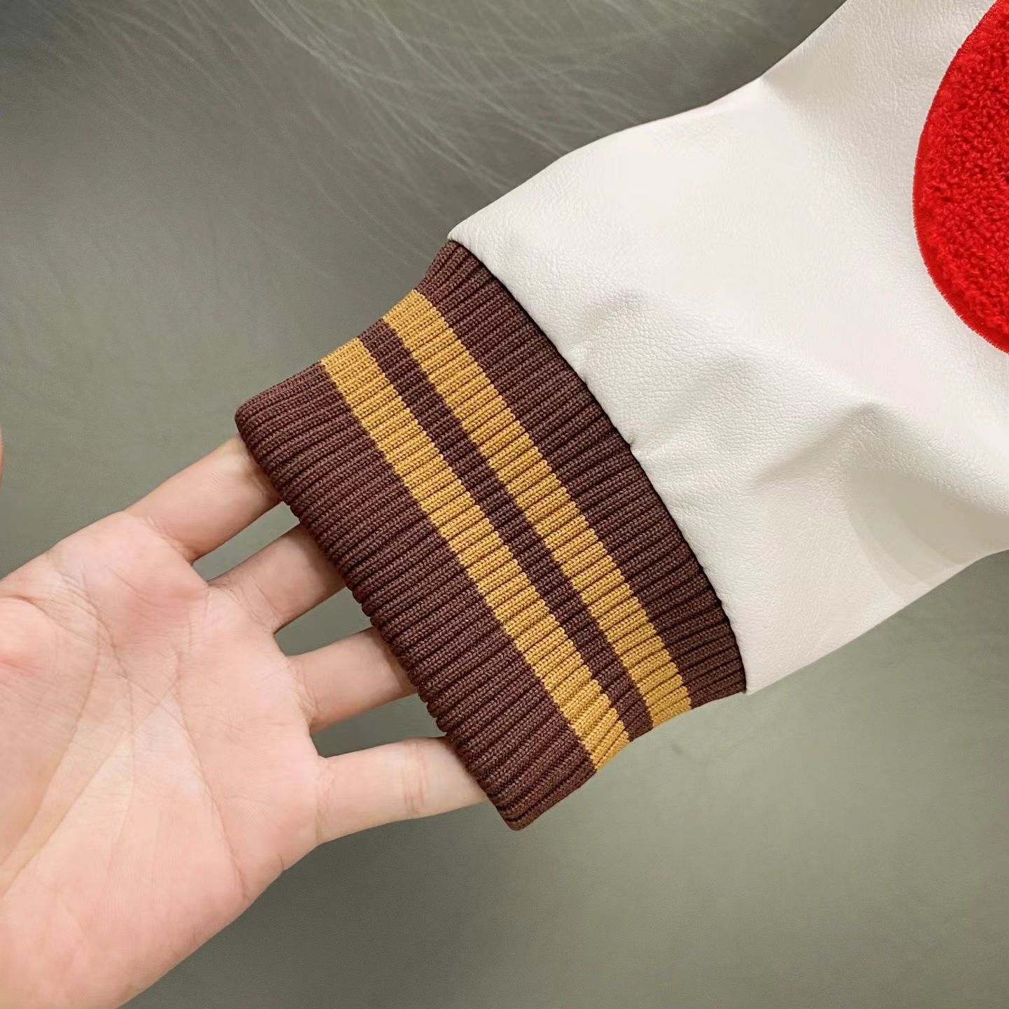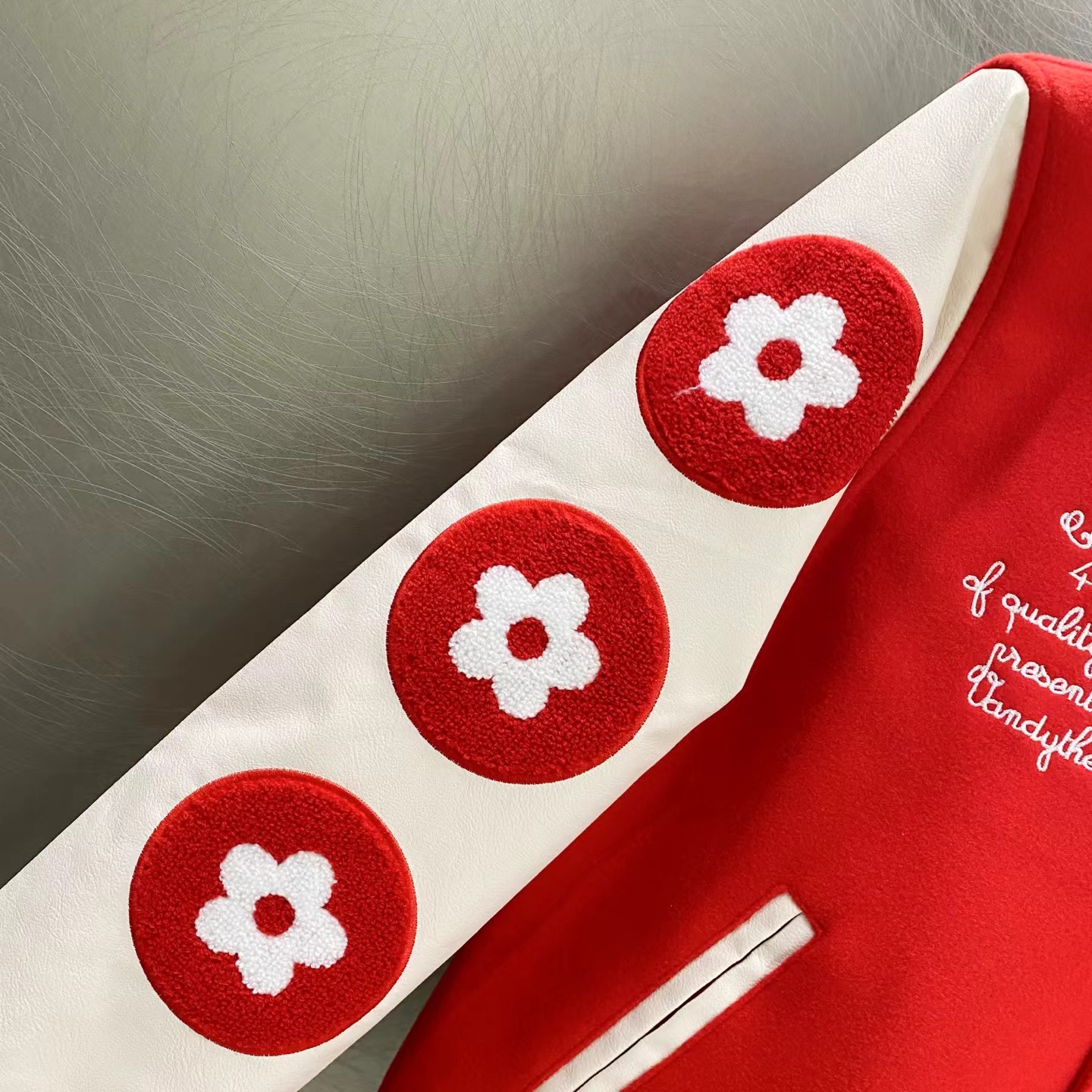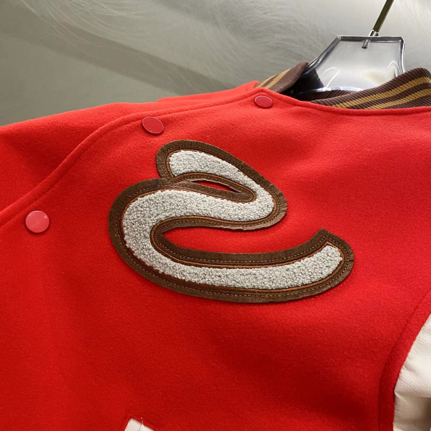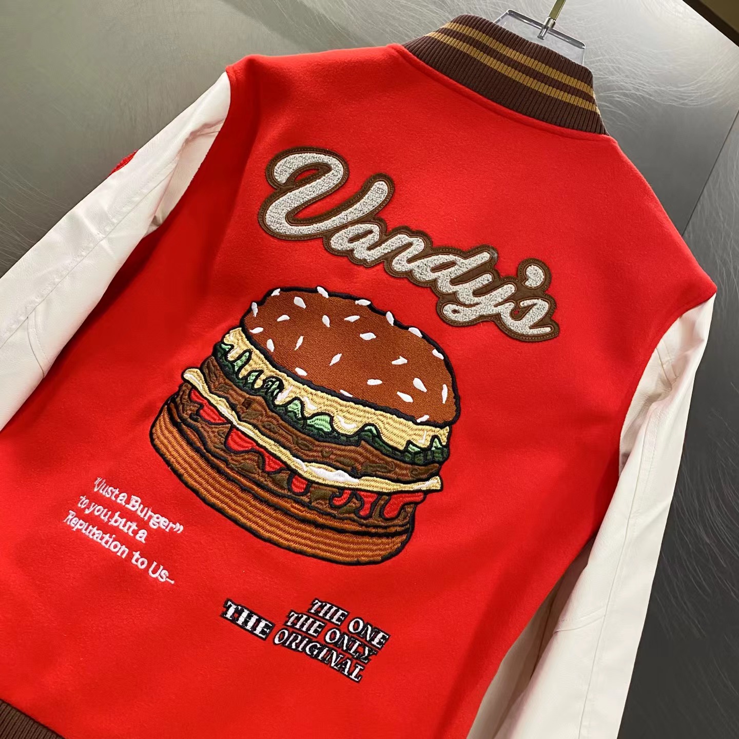 趣味字母汉堡图案刺绣拼接棒球服, 大体面料定做700G毛呢面料,行线里布也选用高密的。市面拿到手容易崩线,我们这个扯不烂,走线缜密细致 。这款的皮袖为PU皮并非真皮,但是舒适感增加非常多,有过蜡质感,纹路细腻且柔软。全套日产纽扣客供,钢印LOGO,非常有质感~五金质感没话说,前后刺绣LOGO,非常精细