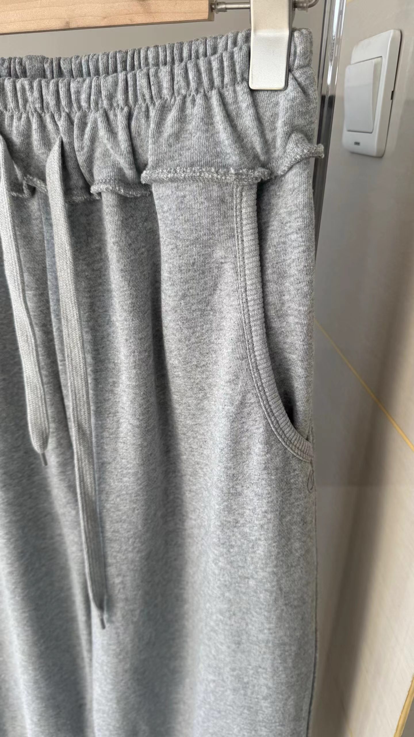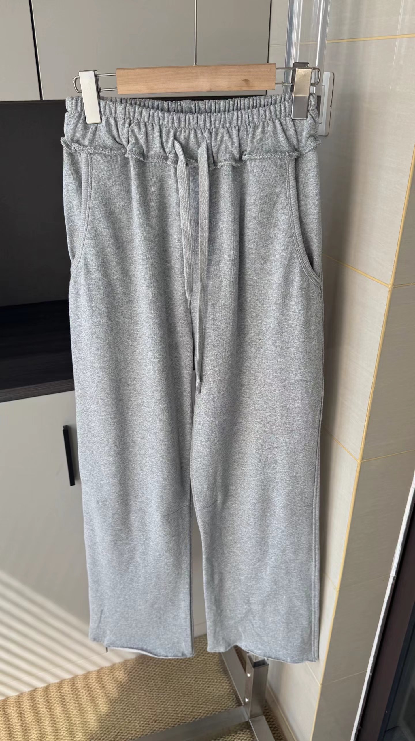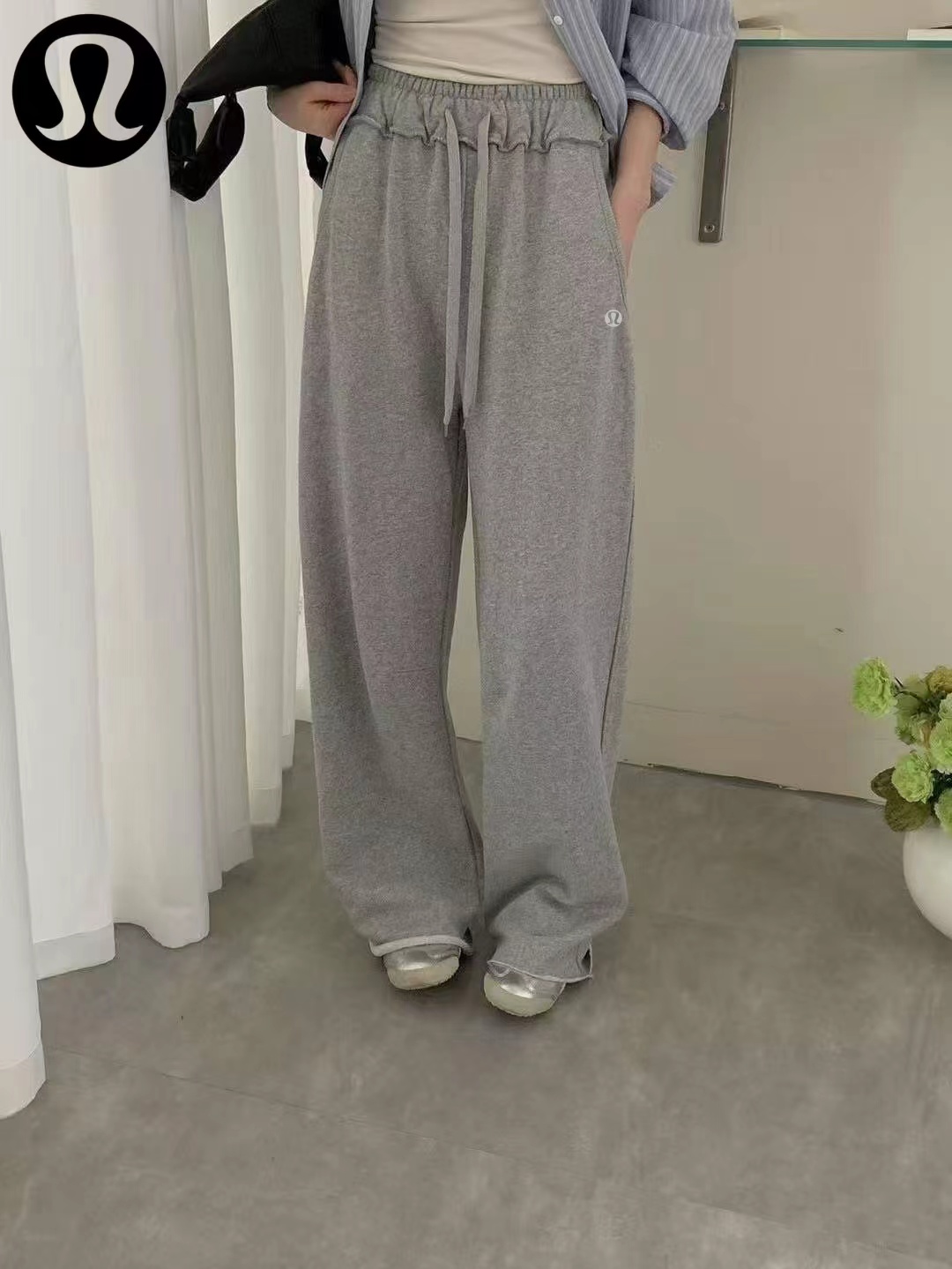 水洗毛圈拖地阔腿裤裤子宽松阔腿直筒版型。裤腿线条流畅,整体呈现松弛慵懒的“松弛感”风格,不贴腿,对臀宽、大腿粗等梨形身材问题有ji佳的修饰效果长款拖地/堆堆裤。裤长及地,搭配休闲鞋可自然堆叠,自带随性氛围感,适合拉高身材比例。松紧腰+抽绳设计。采用高弹力松紧腰,搭配同色系抽绳,既能自由调节腰围,又能提升舒适度,避免勒腰。舒适针织卫裤面料。从图中质感看,应为柔软的棉混纺针织材质,垂坠感好,不易起皱,兼具透气性与亲肤感。整体设计简洁干净,无过多繁杂装饰,主打极简gao级感。麻灰色。属于基础色,耐脏且质感gao级,不挑肤色。内搭纯色T恤/背心,外叠穿条纹衬衫,休闲随性。