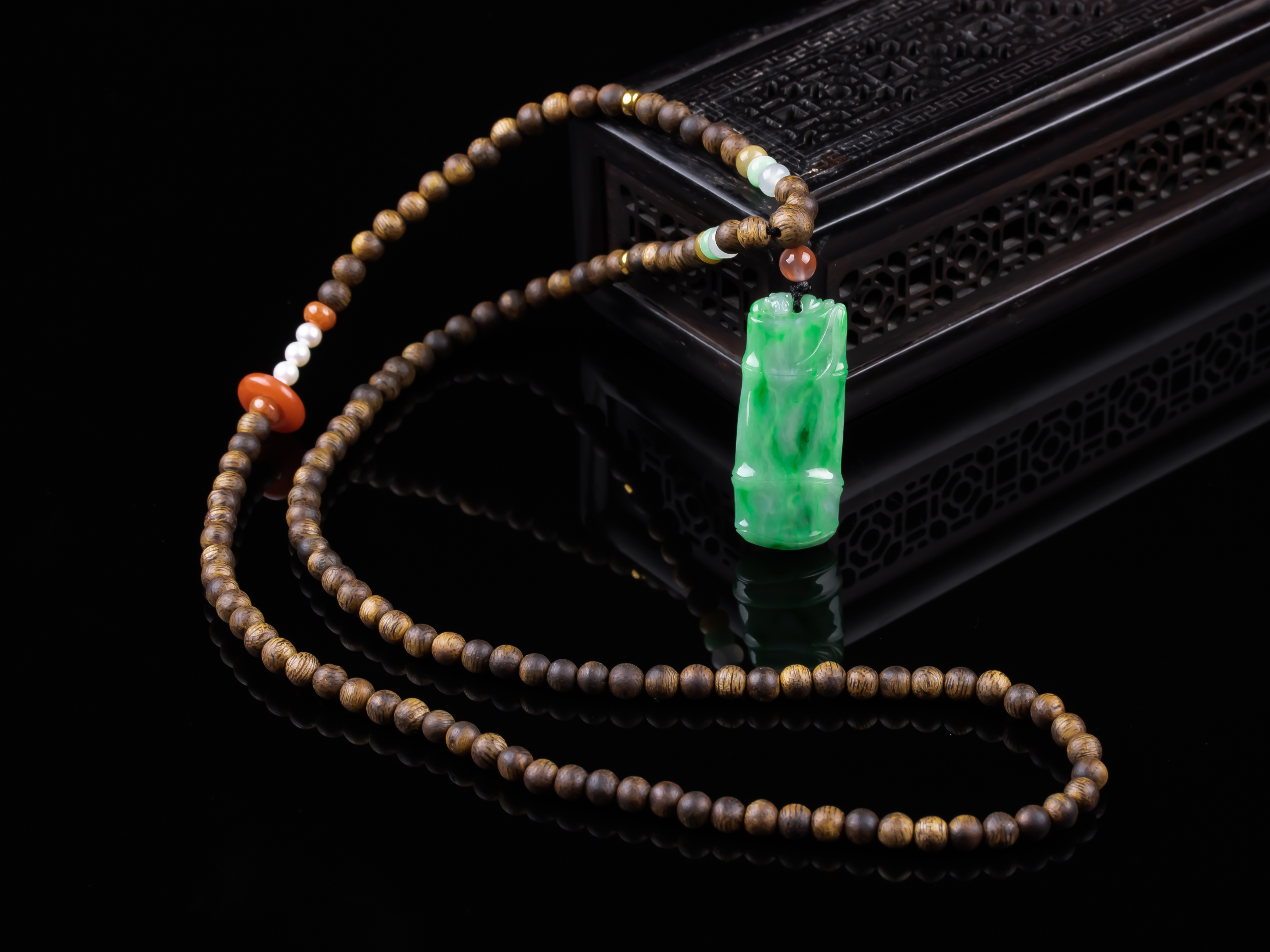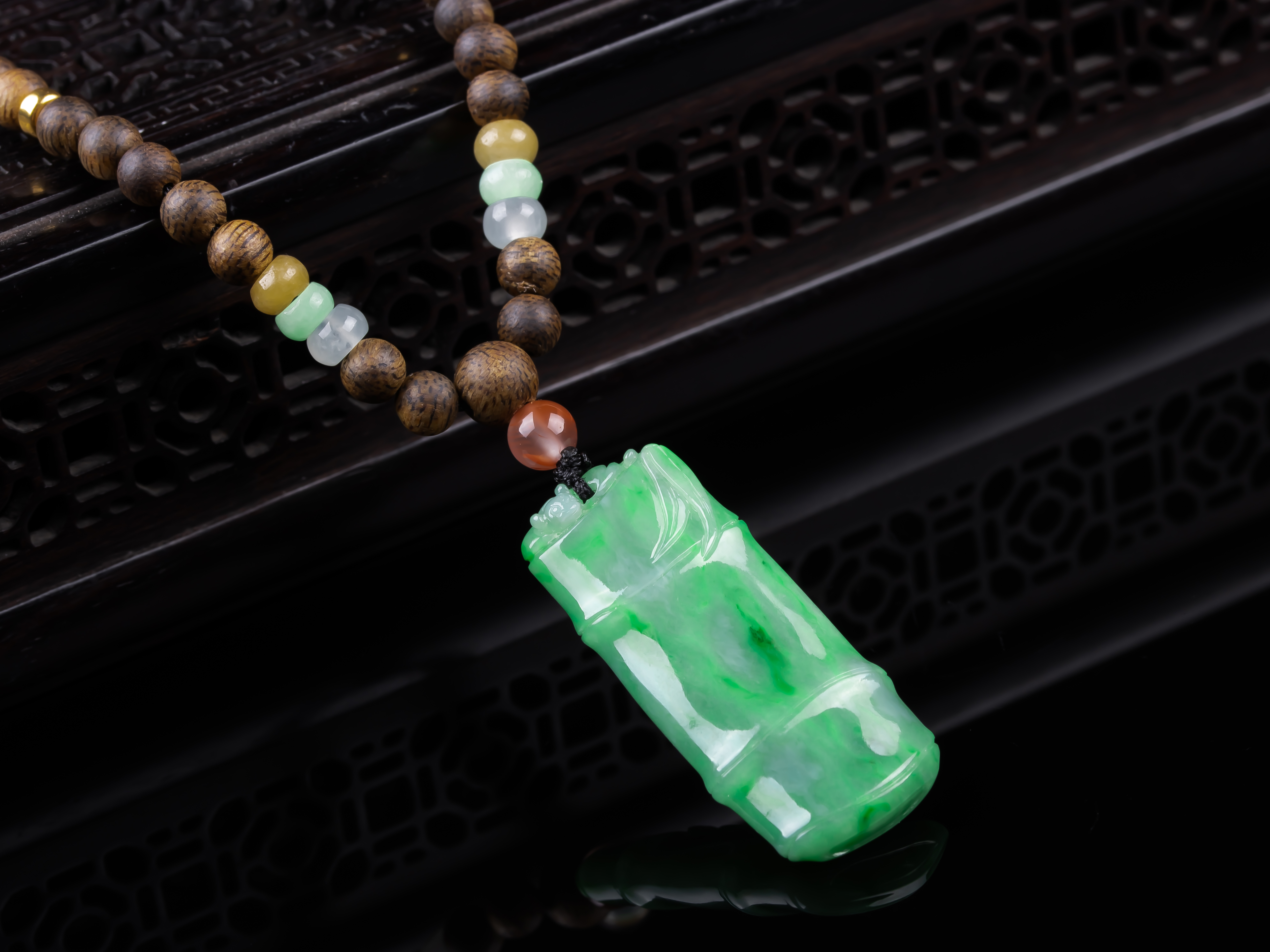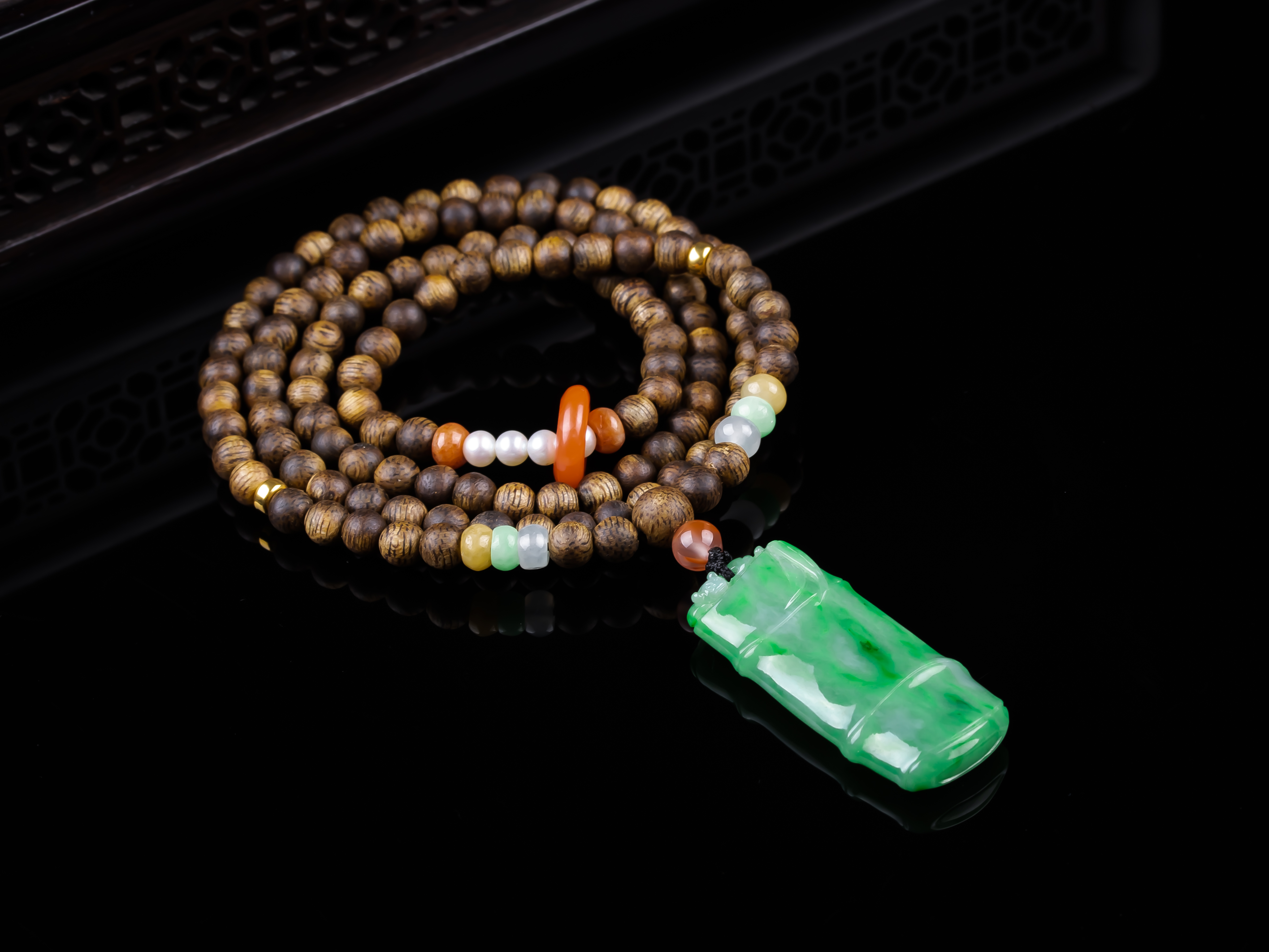 XY0261沉香+翡翠满色竹节挂件,天然沉香,原色原味,香味自然清甜,立体雕刻的满果绿色的翡翠大竹节,配件:翡翠、南红、珍珠、银。竹子四君子之一,谦虚、正直,同时也是代表吉祥、福气,竹报三多:多福多寿多子。