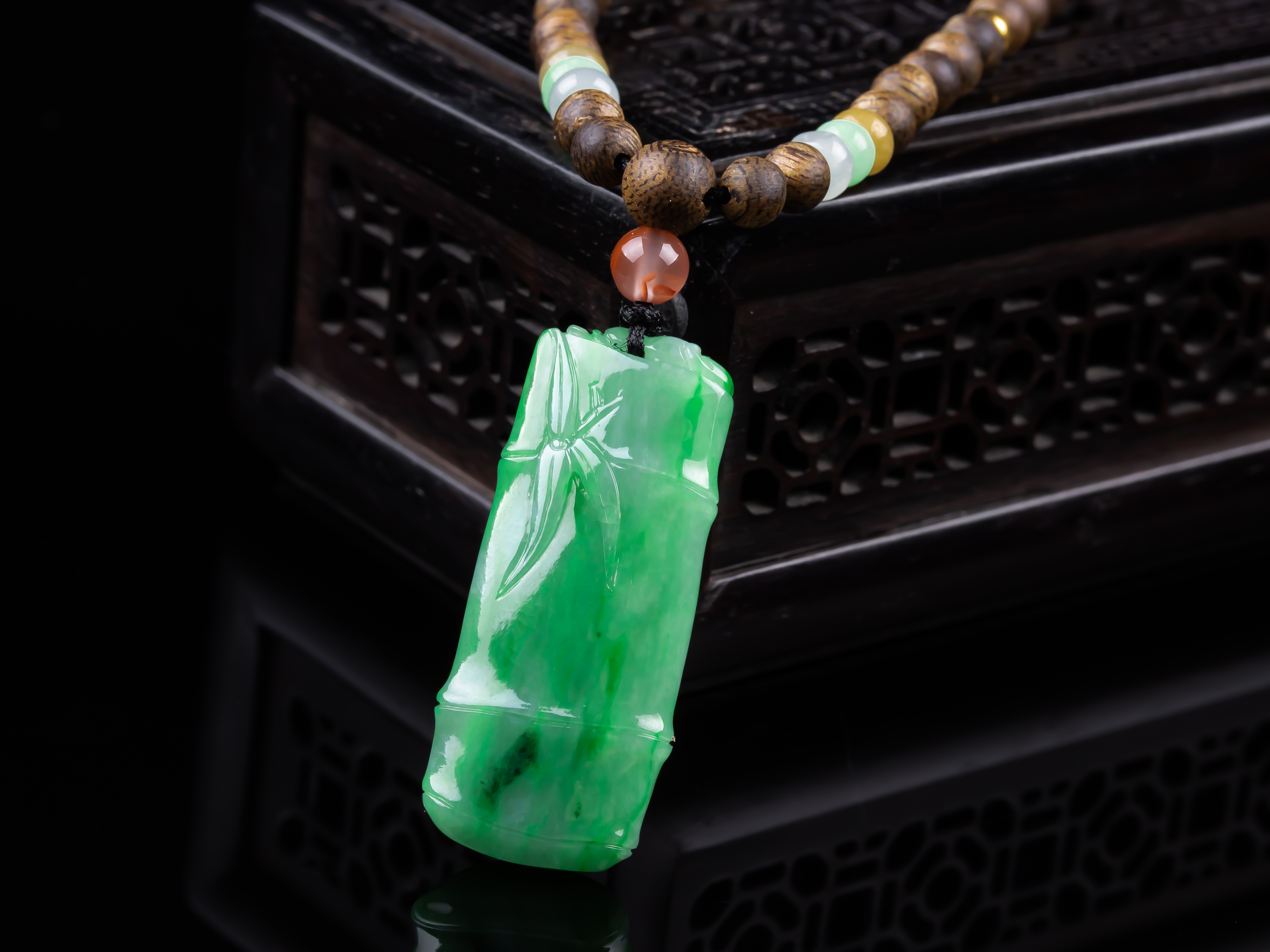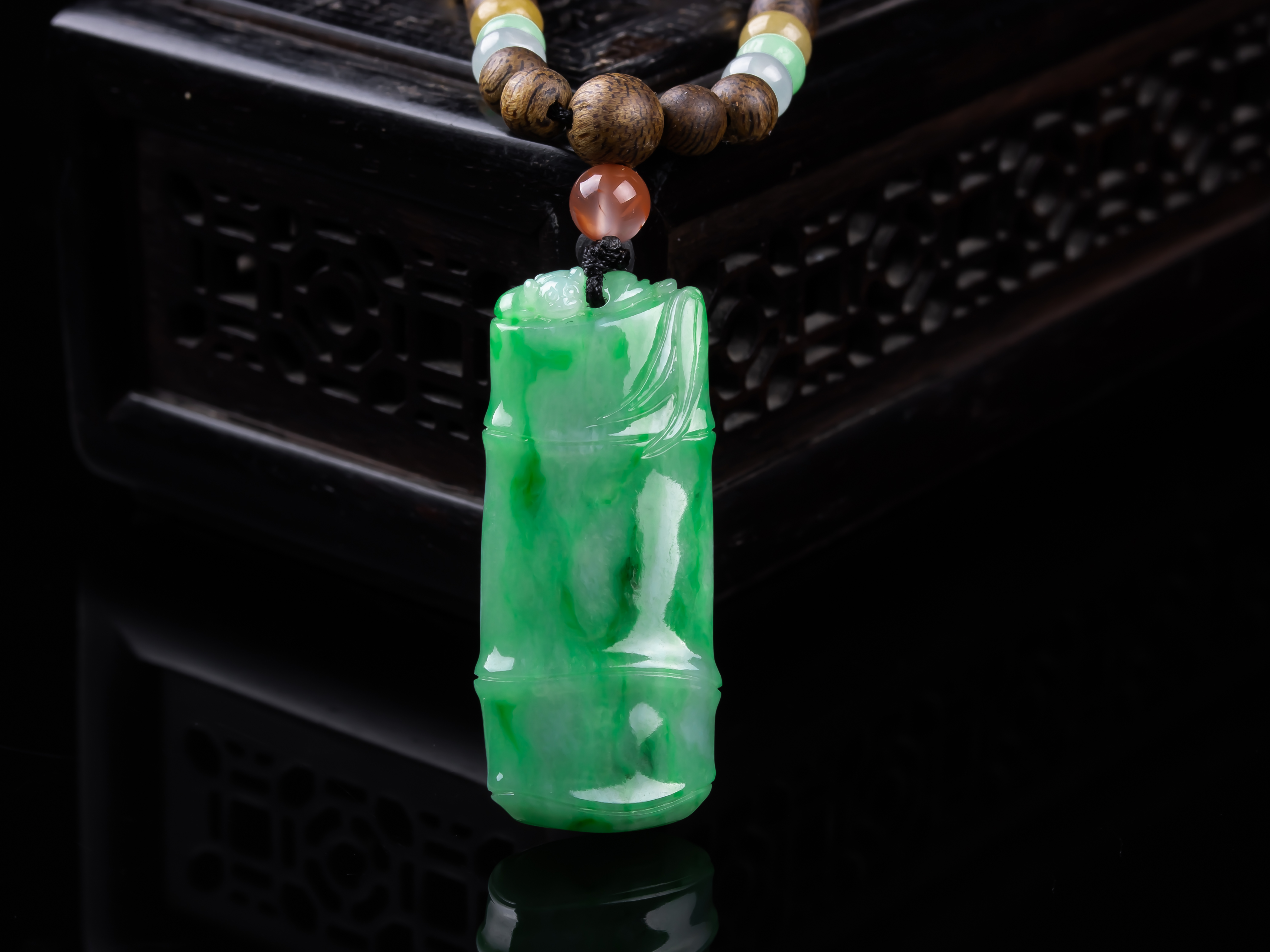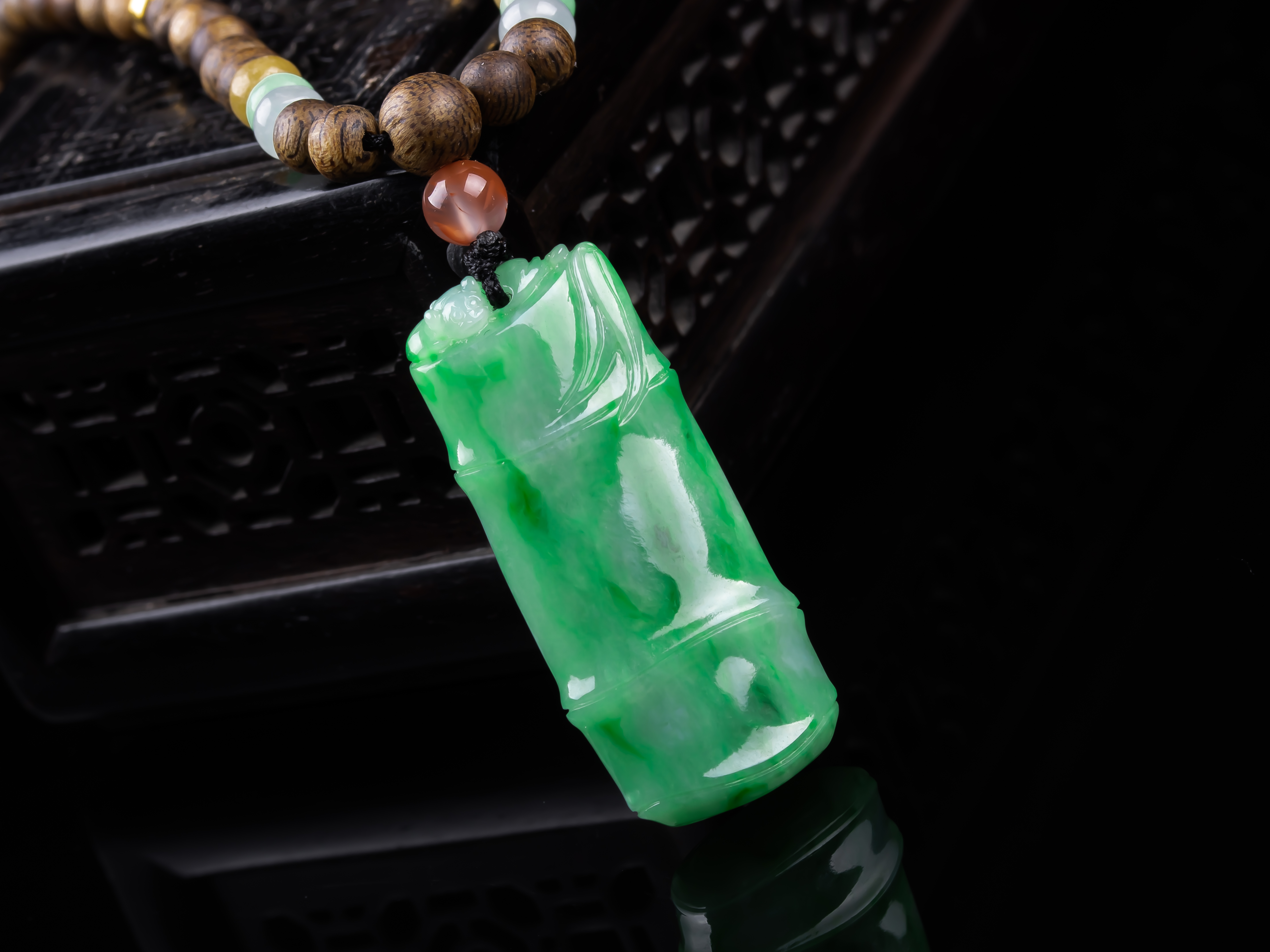 XY0261沉香+翡翠满色竹节挂件,天然沉香,原色原味,香味自然清甜,立体雕刻的满果绿色的翡翠大竹节,配件:翡翠、南红、珍珠、银。竹子四君子之一,谦虚、正直,同时也是代表吉祥、福气,竹报三多:多福多寿多子。