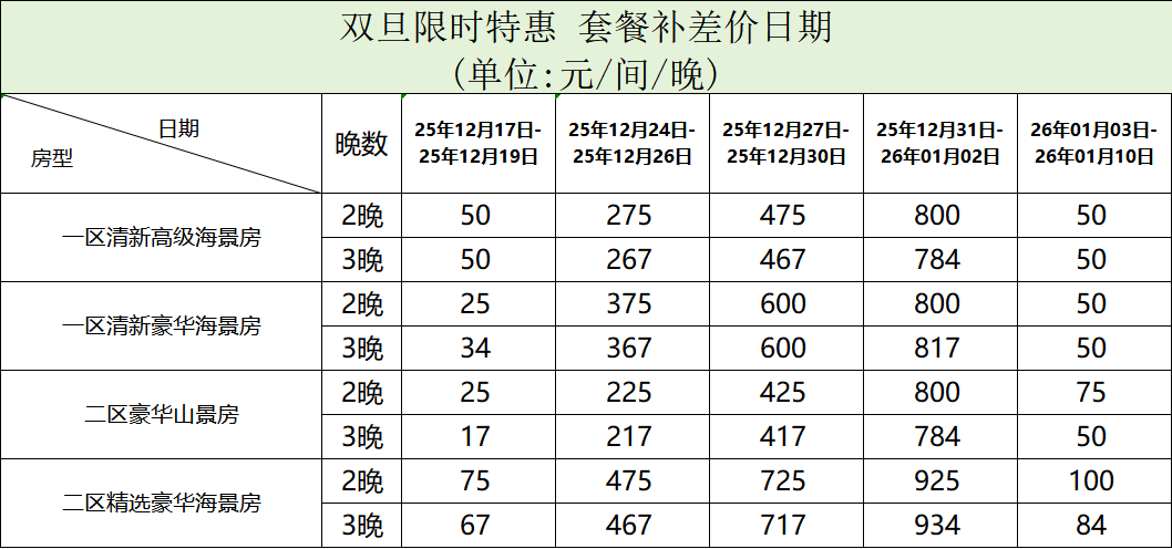 1、本套餐预约期至2025年12月28日前(含12月28日当天),入住可约日期至2026年01月10日。部分日期已约满,套餐库存有限,外网有房不代表套餐可以预约,具体库存以预约时与在线管家确认为准,建议尽早预约避免无房问题。点击预约