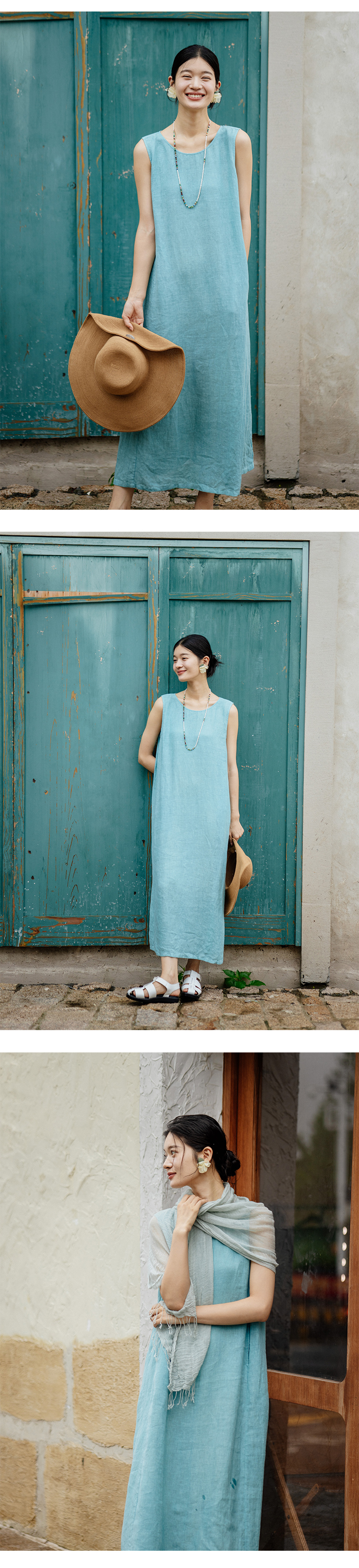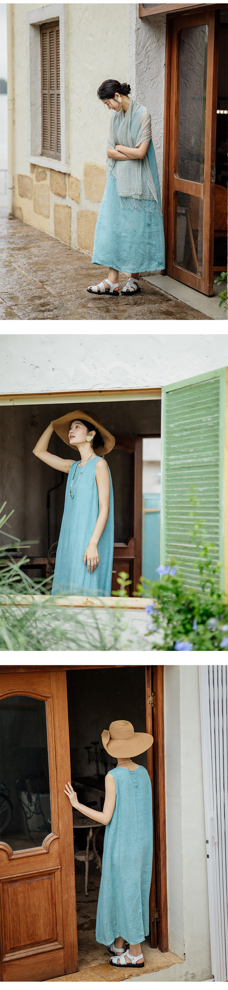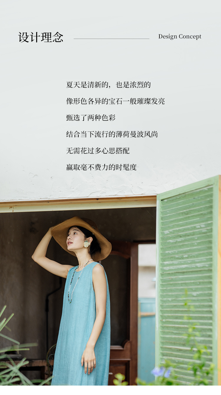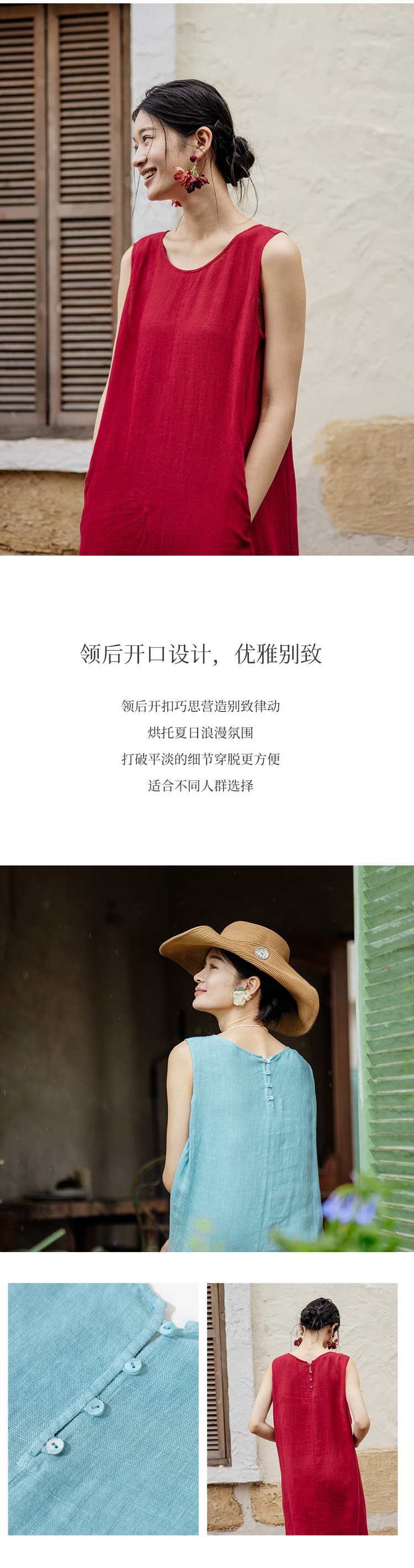 绽放旅行女装414朵/高支加捻亚麻领后开扣设计别致海边度假背心裙
