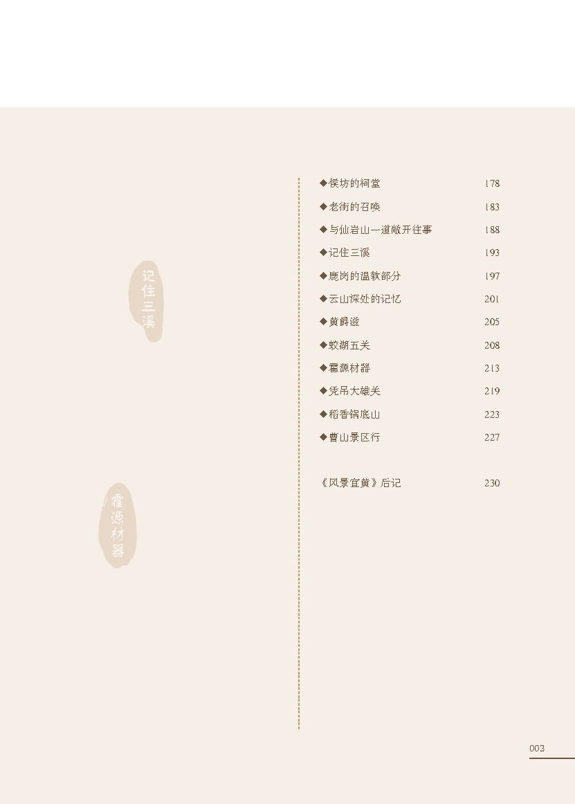 《风景宜黄》分“山水画卷”“家园厚土”“往事可追”三个篇章,以散文的形式描绘了宜黄如画的青山绿水,记录了宜黄厚重的古村人文,回溯了宜黄贤士名人的流金岁月,立体多维呈现了宜黄县的自然风光、风土人情、红色文化、禅文化和戏文化。