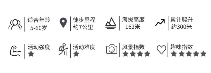 7KM长度,土路与石板道结合,坡度平缓,萌娃也能轻松挑战!