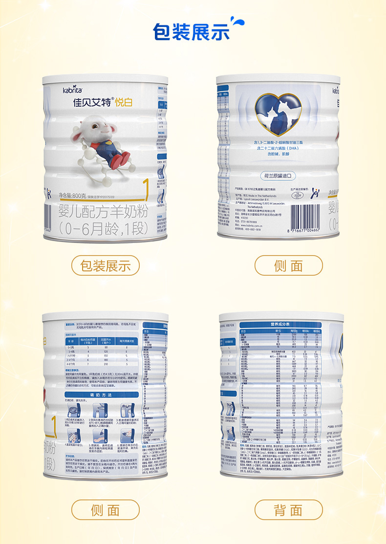 荷兰进口佳贝艾特幼儿配方婴儿羊奶粉悦白1段0-6个月800g