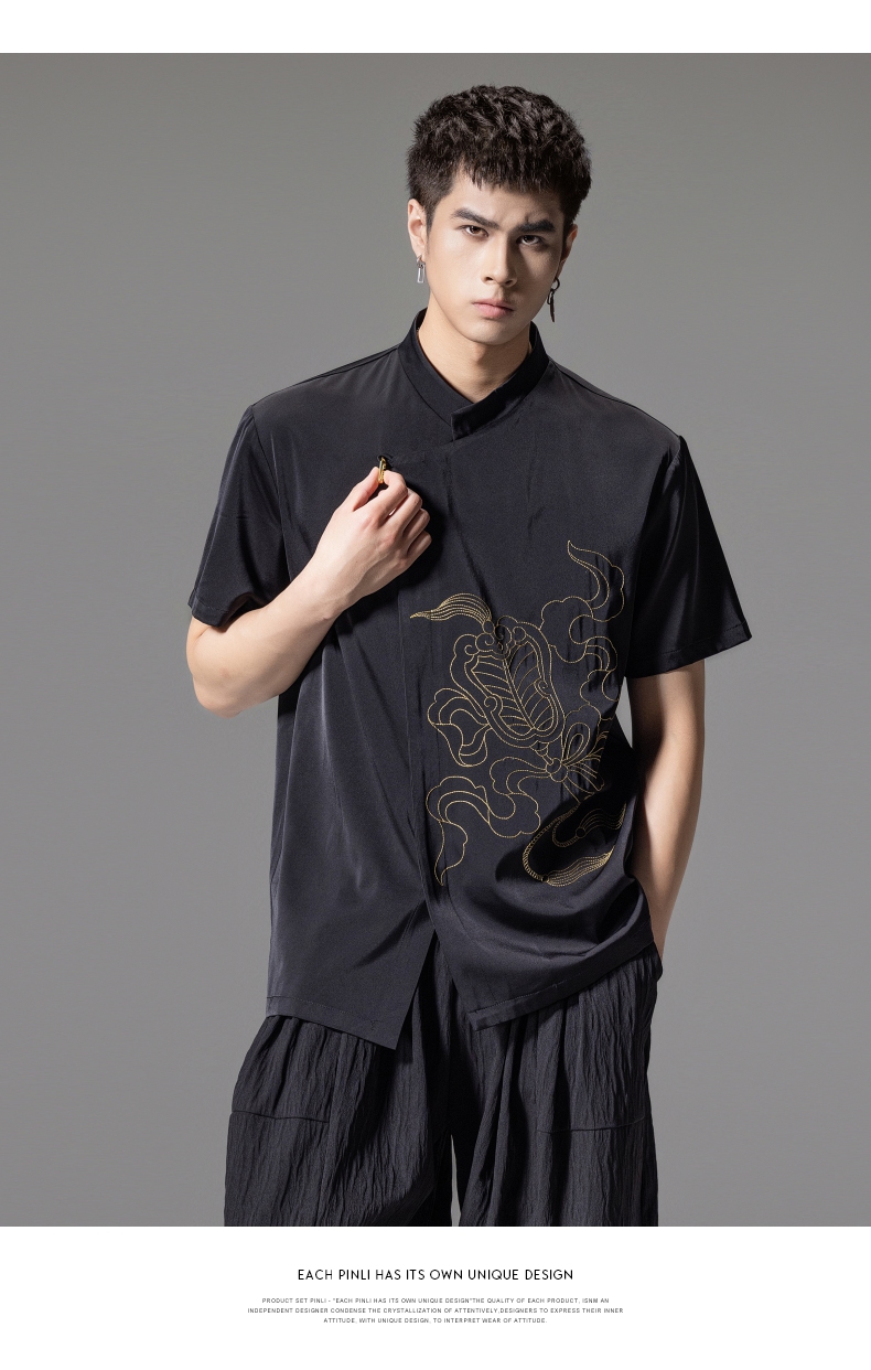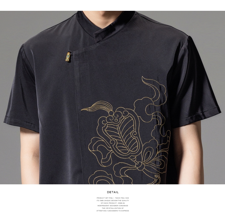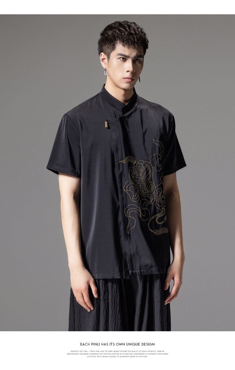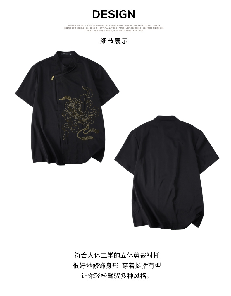 PINLI品立夏季新款新中式刺绣立领衬衫男士国潮斜襟短袖衬衣B242113130