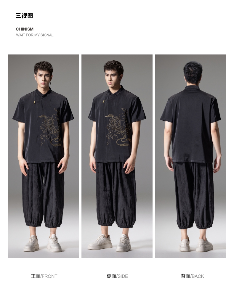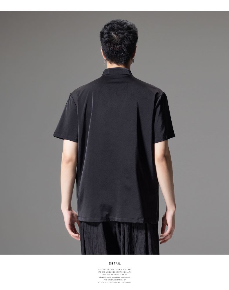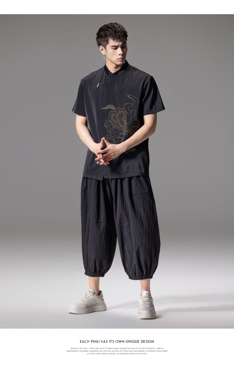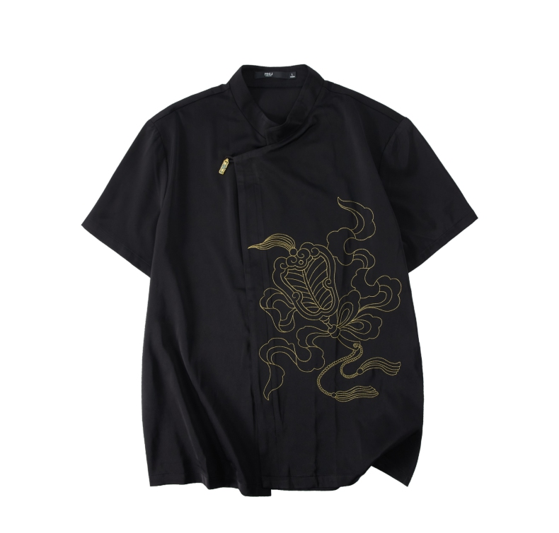 PINLI品立夏季新款新中式刺绣立领衬衫男士国潮斜襟短袖衬衣B242113130