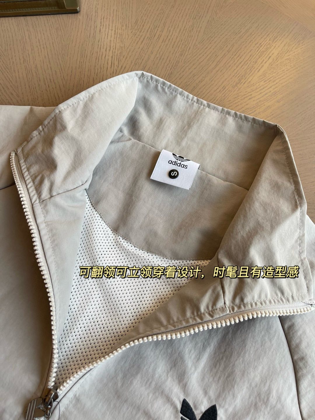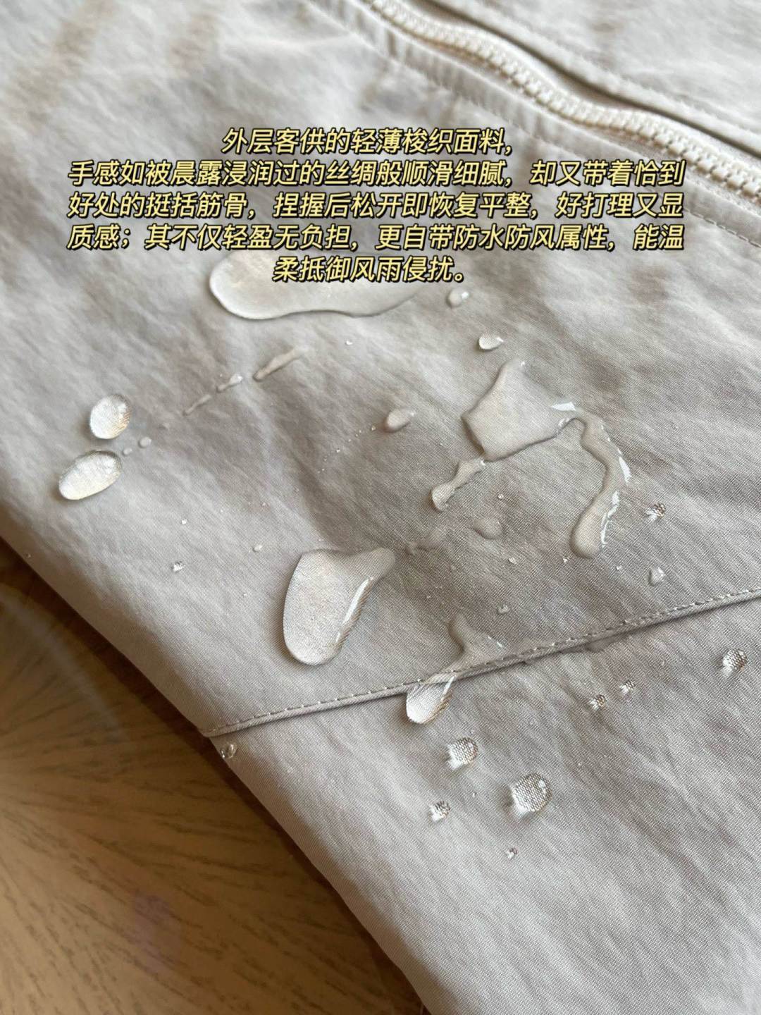 外层客供的轻薄梭织面料,手感如被晨露浸润过的丝绸般顺滑细腻,却又带着恰到好处的挺括筋骨,捏握后松开即恢复平整,好打理又显质感;其不仅轻盈无负担,更自带防水防风属性,能温柔抵御风雨侵扰。