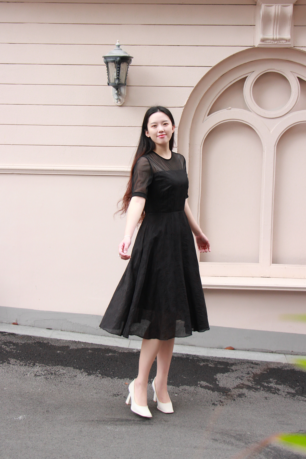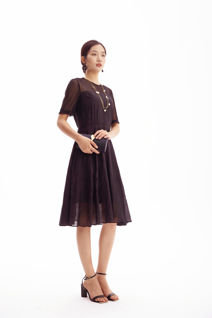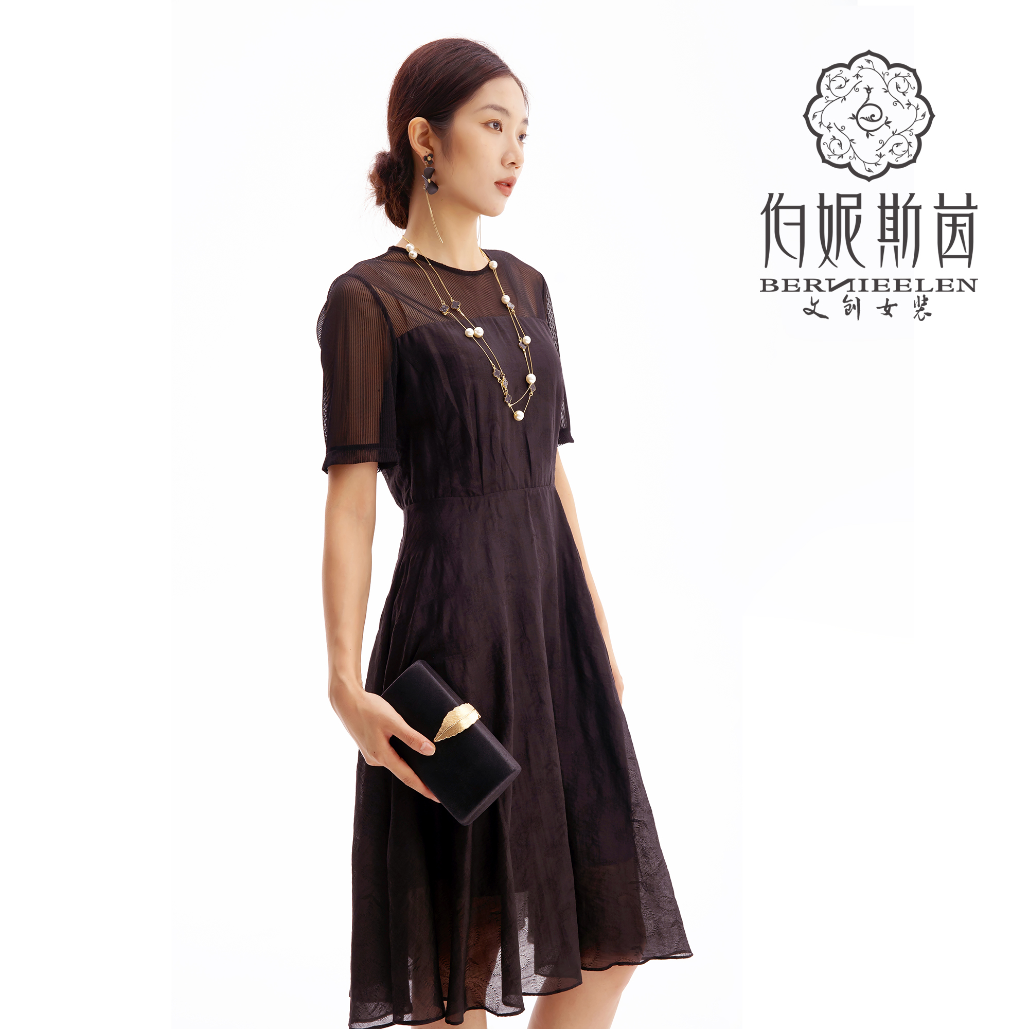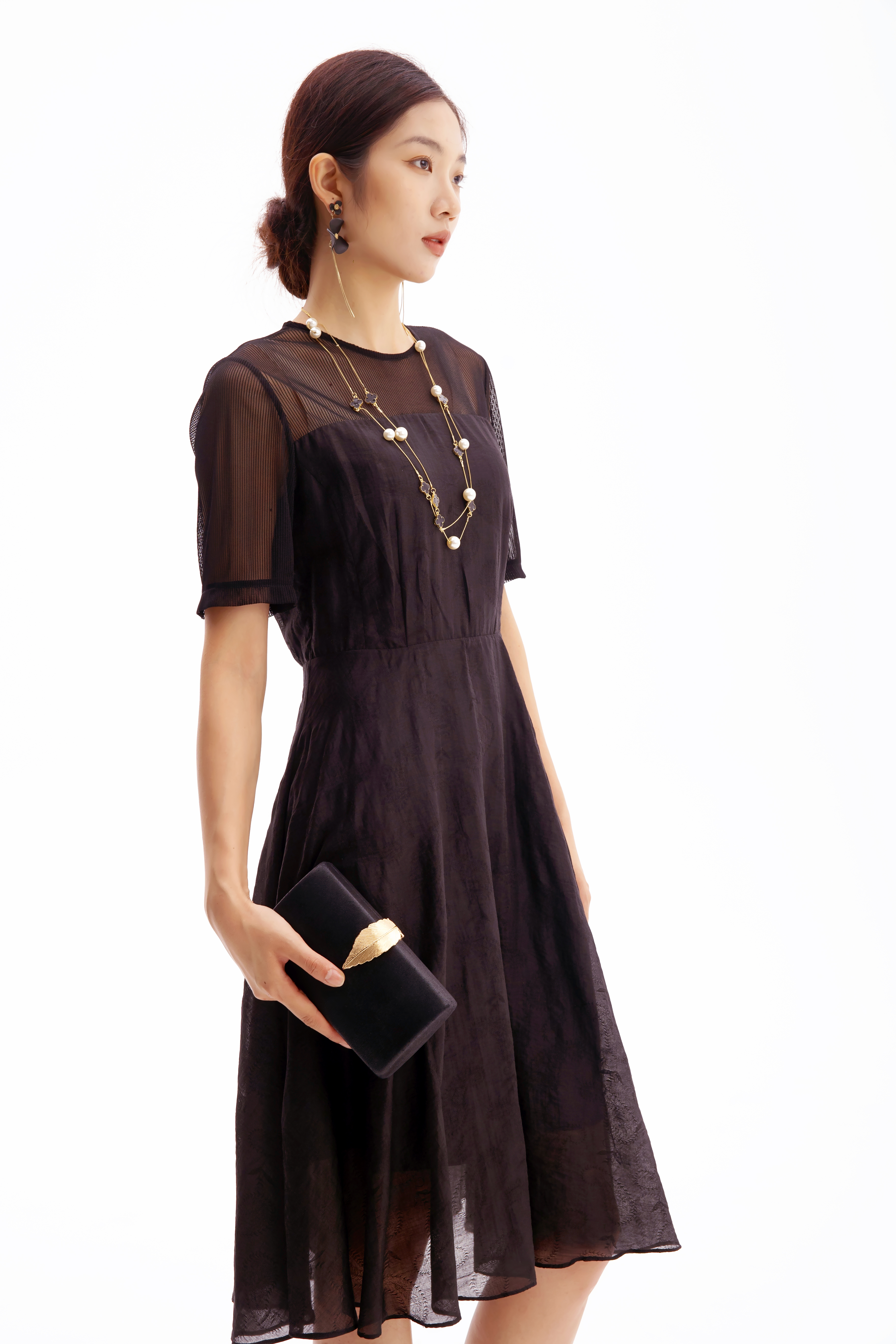 HJ2S19_漆黑色_连衣裙_春夏_复古网纱透视拼接收腰显瘦通勤气质连衣裙_高级女装_BERNIEELEN 伯妮斯茵