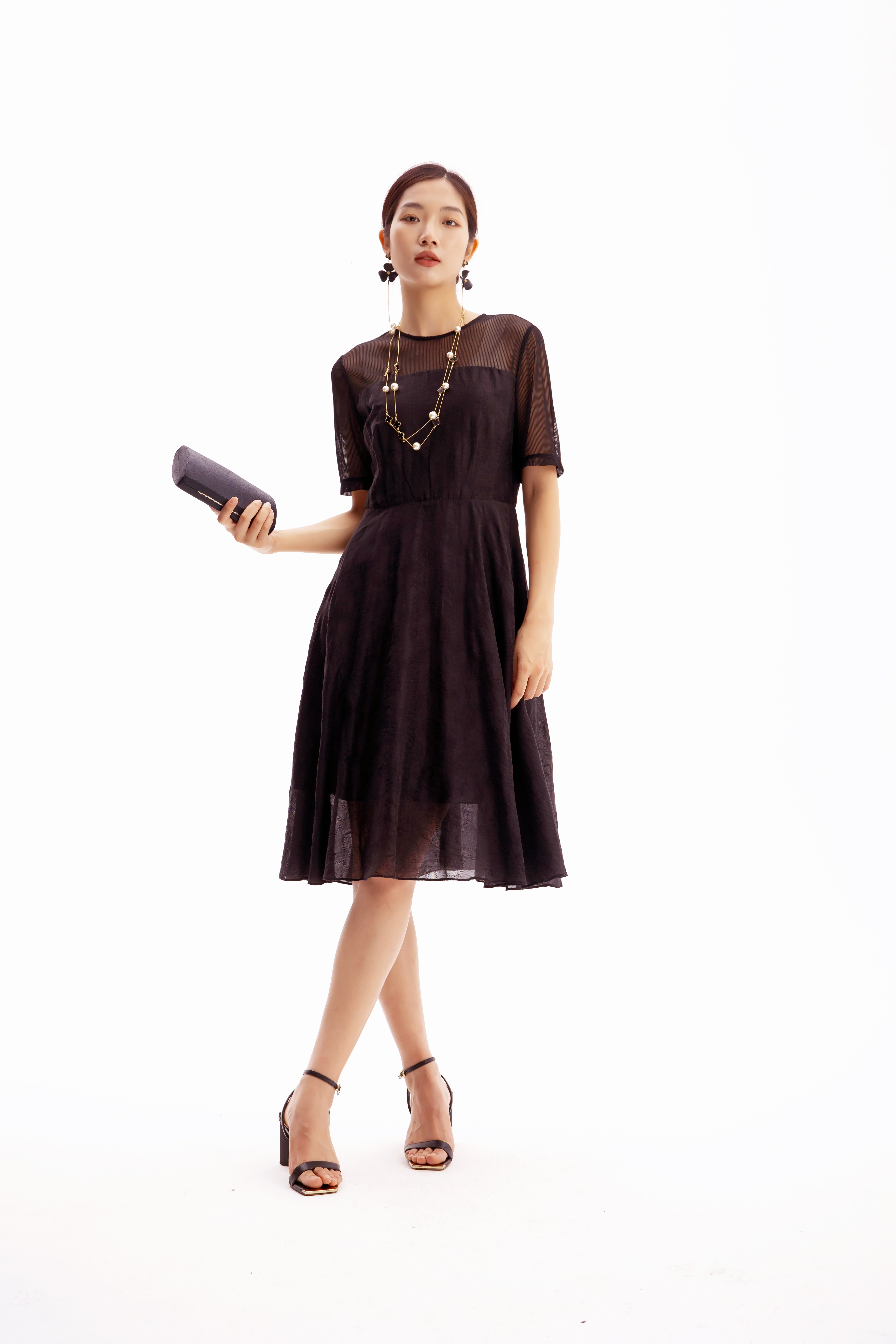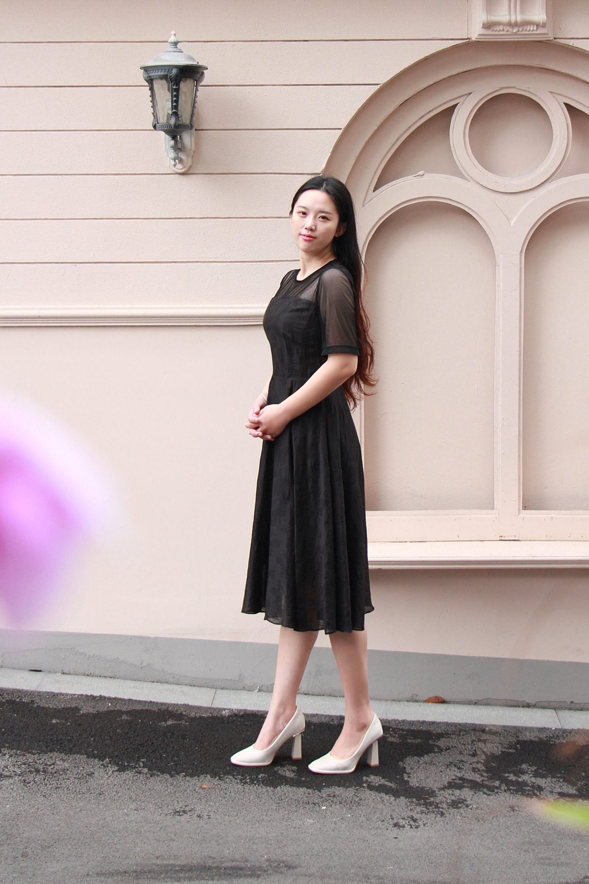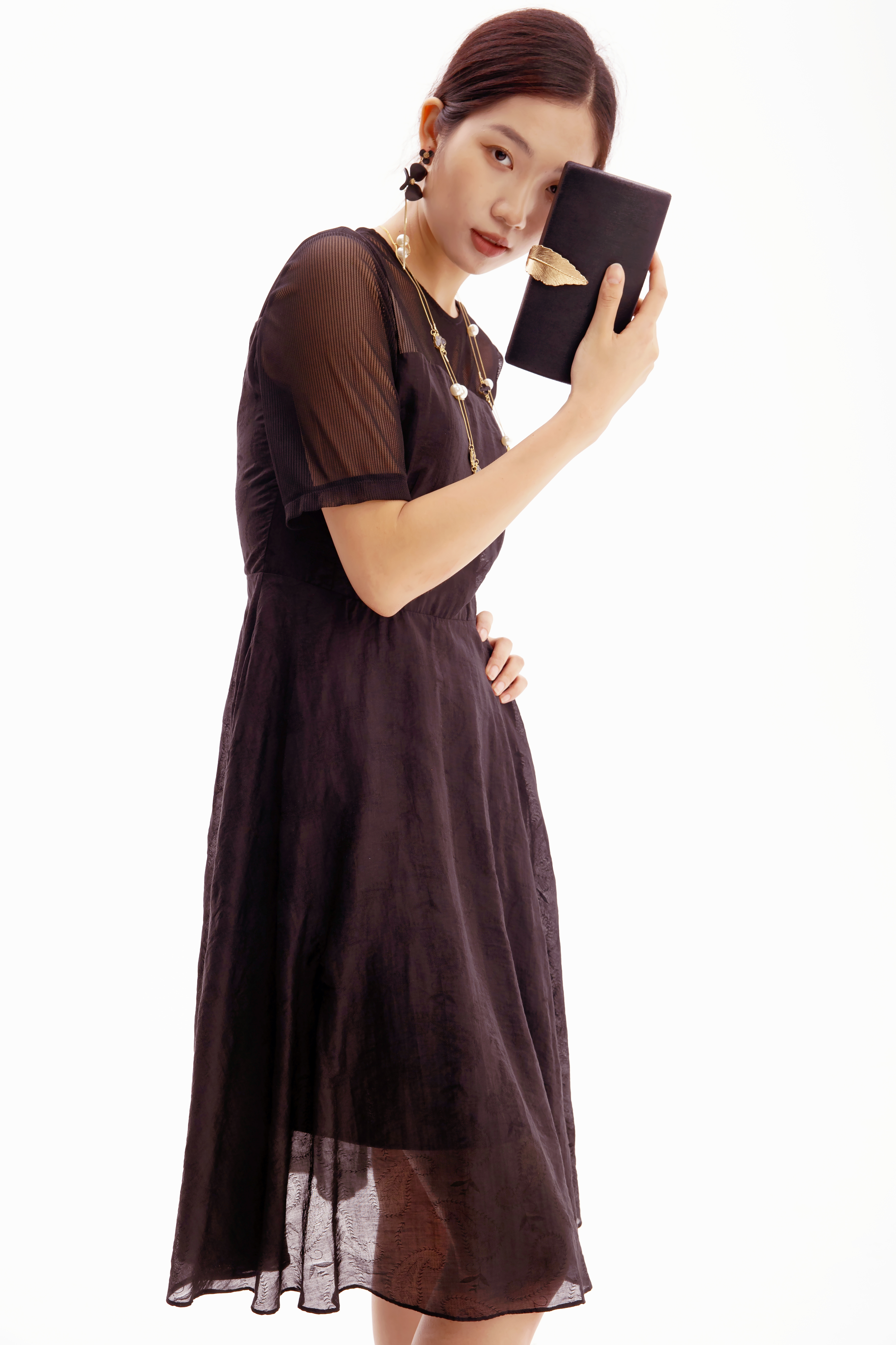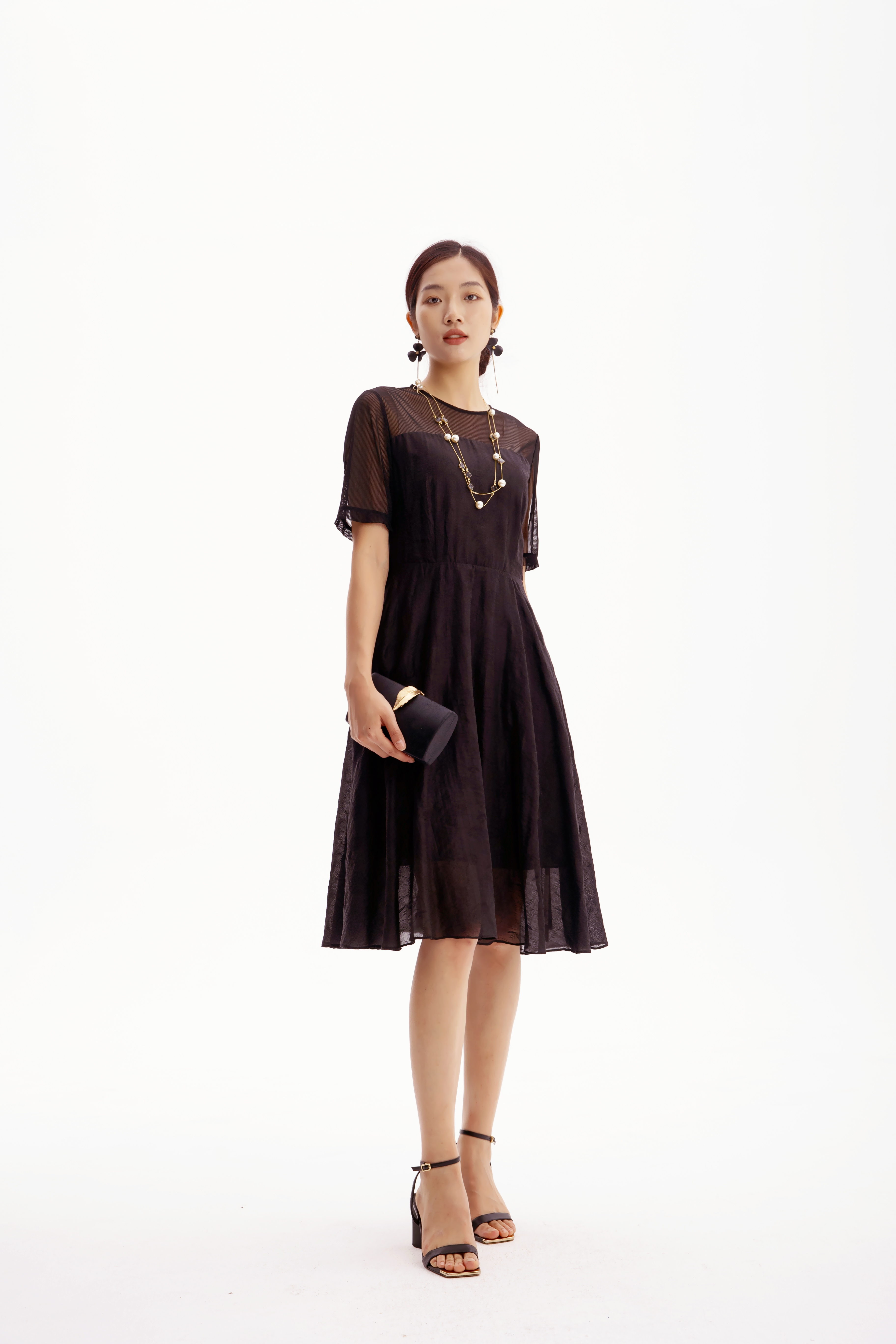 HJ2S19_漆黑色_连衣裙_春夏_复古网纱透视拼接收腰显瘦通勤气质连衣裙_高级女装_BERNIEELEN 伯妮斯茵