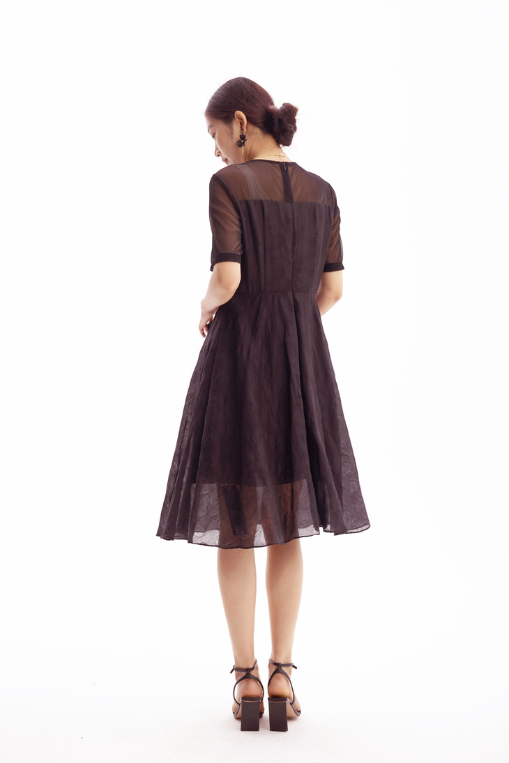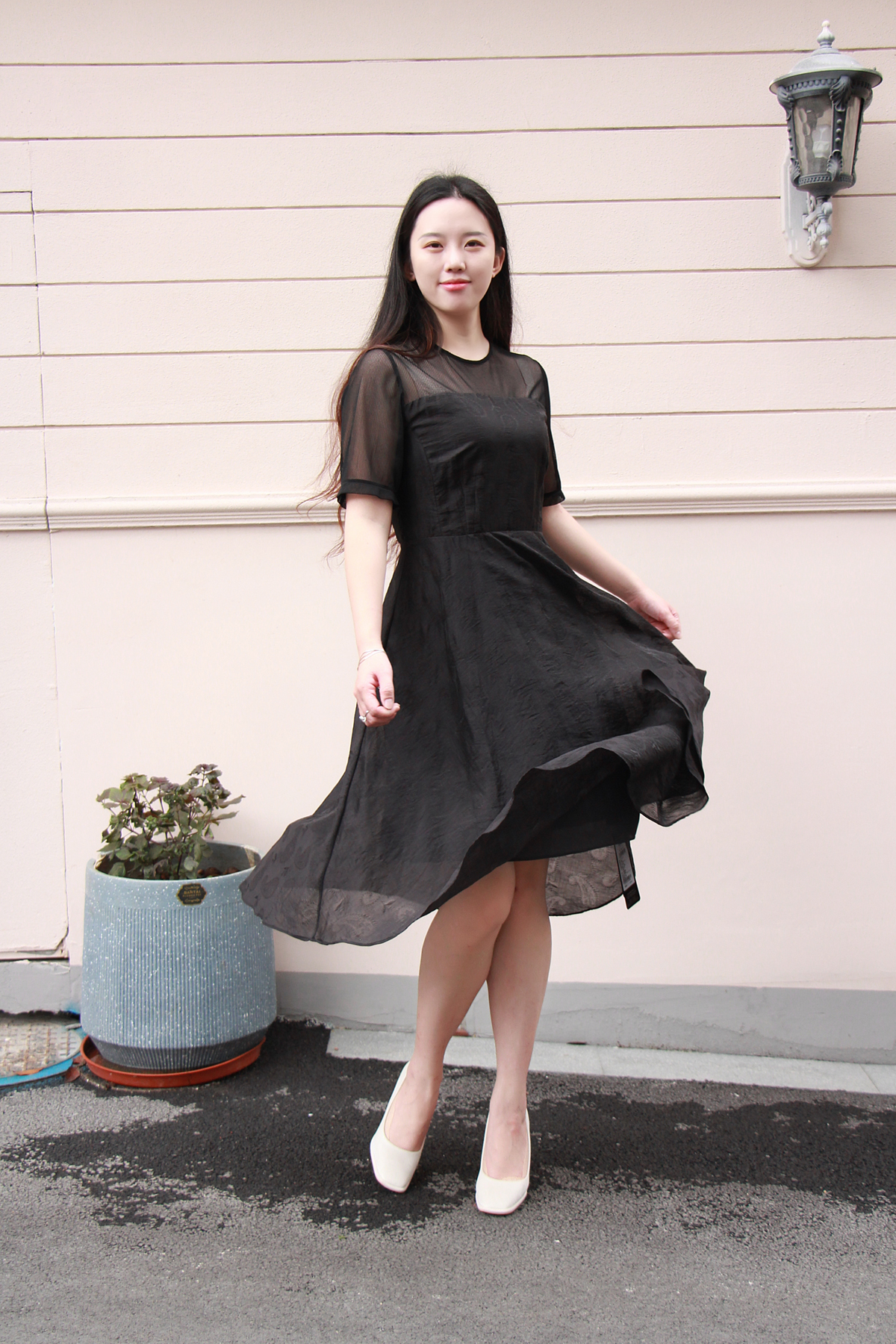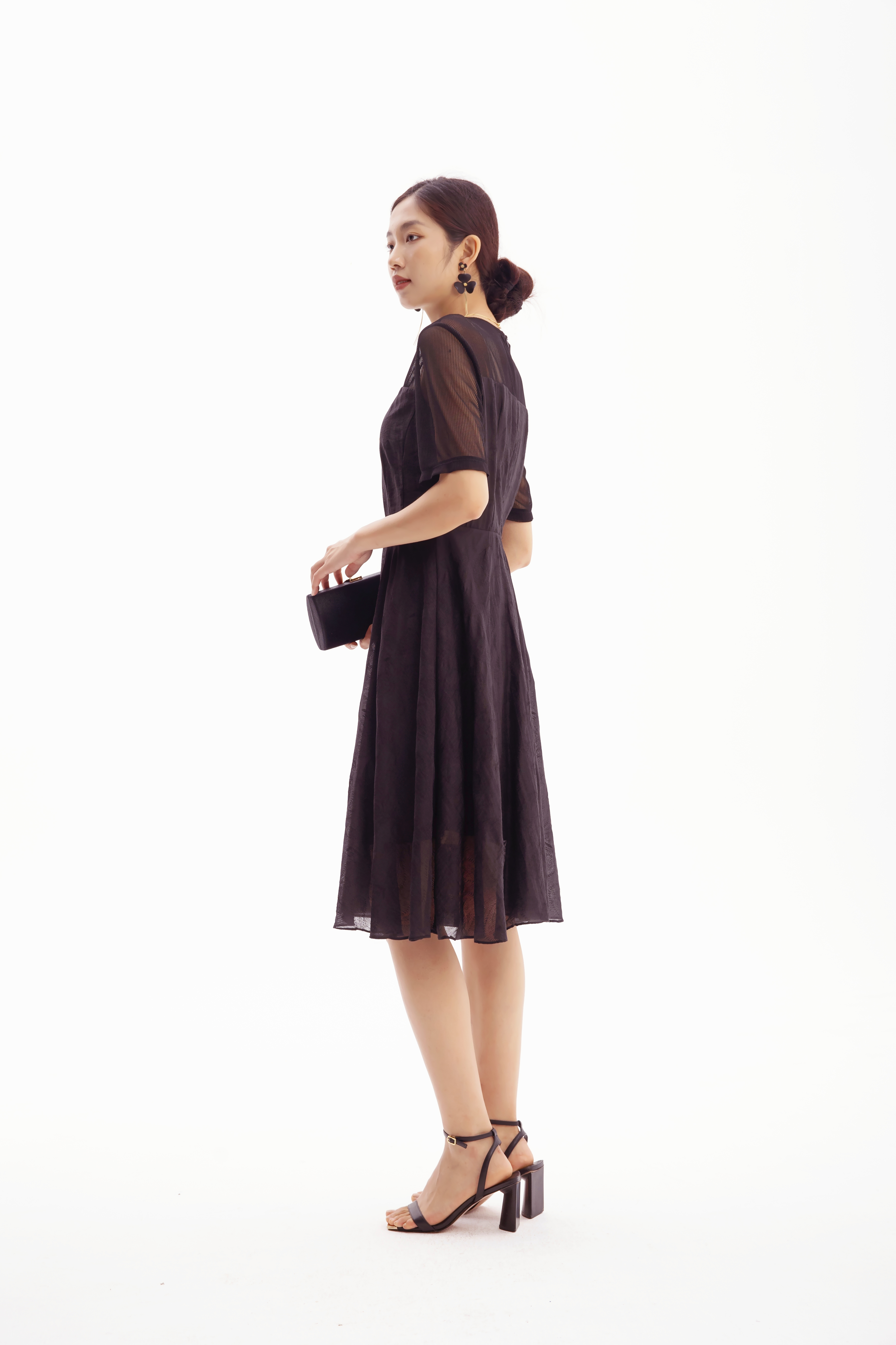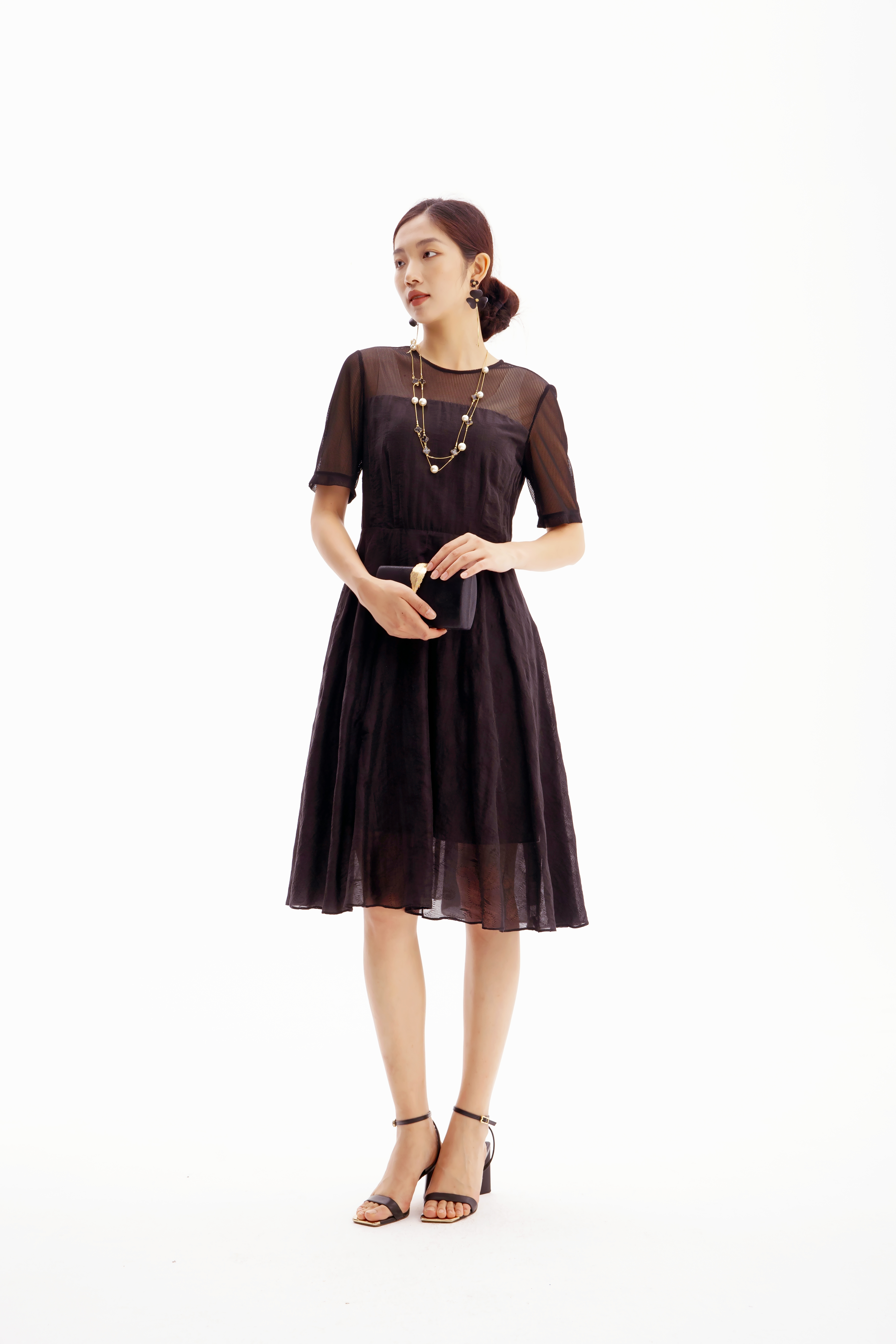 HJ2S19_漆黑色_连衣裙_春夏_复古网纱透视拼接收腰显瘦通勤气质连衣裙_高级女装_BERNIEELEN 伯妮斯茵