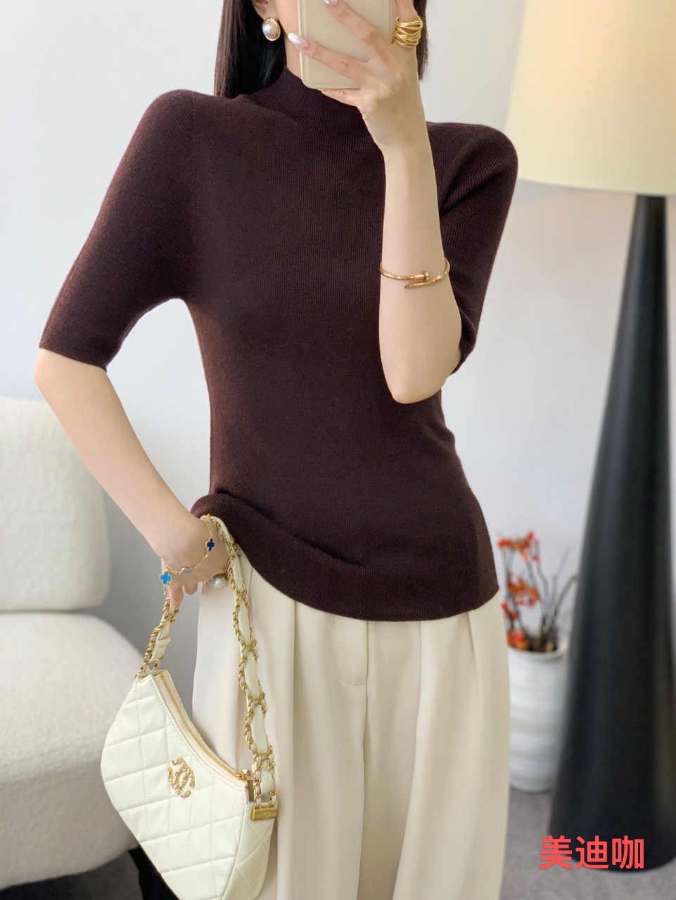 伯妮斯茵 | 高级感利落 纯色坑条羊毛打底衫 五分袖设计 百搭叠穿 日常内搭款 SZ3E17 - 美迪咖色针织衫 -【诗说先秦~与时尚对话,与年龄和解,与诗意重逢!】