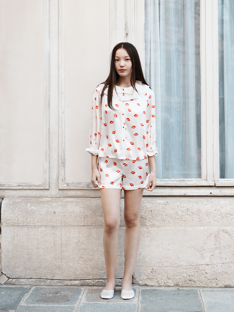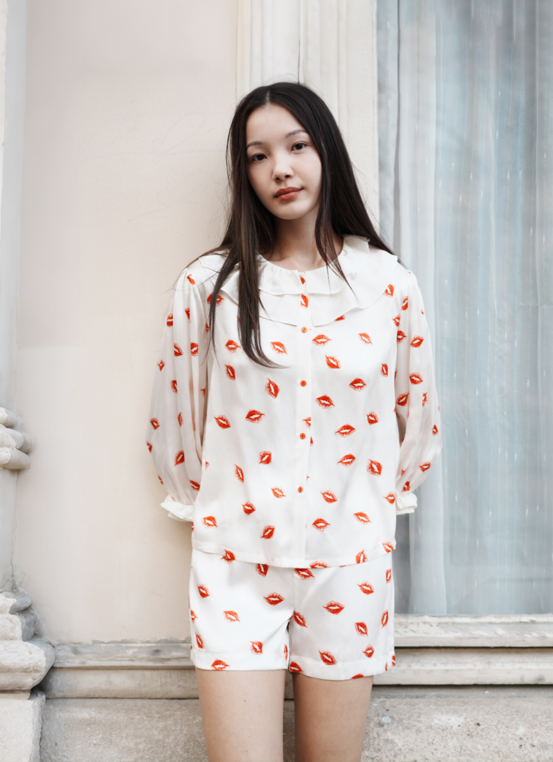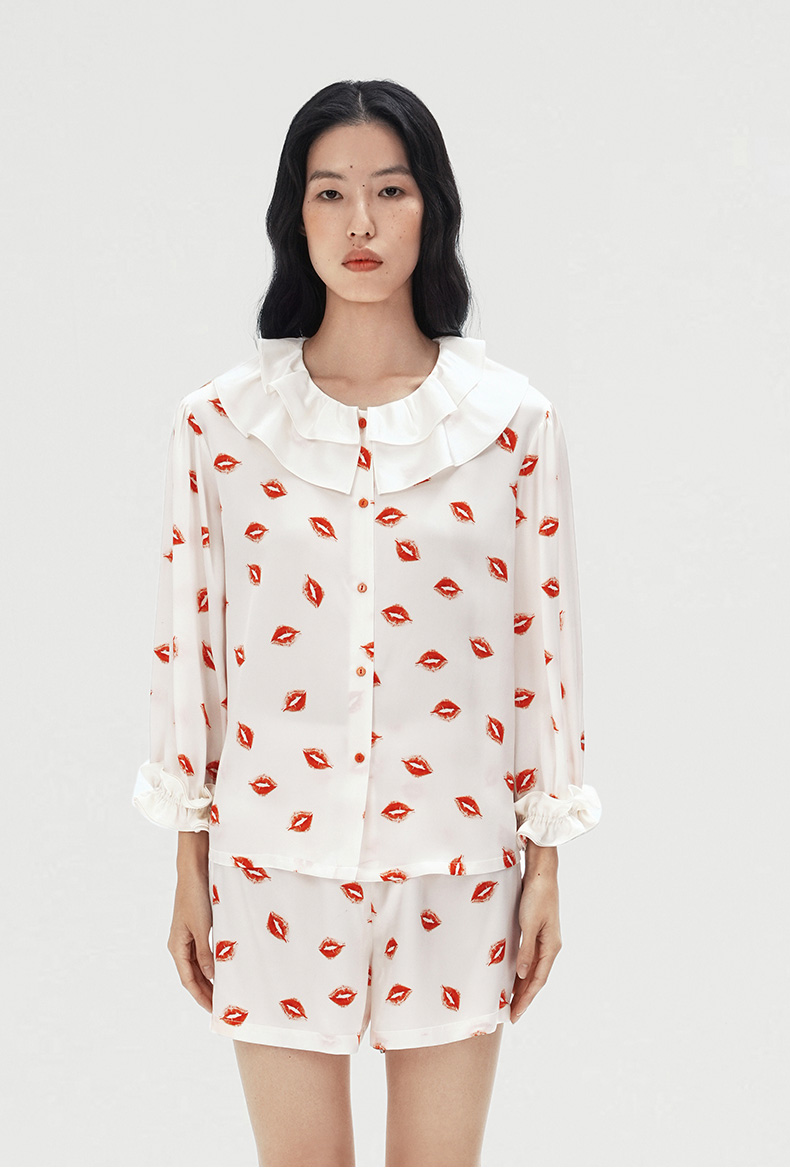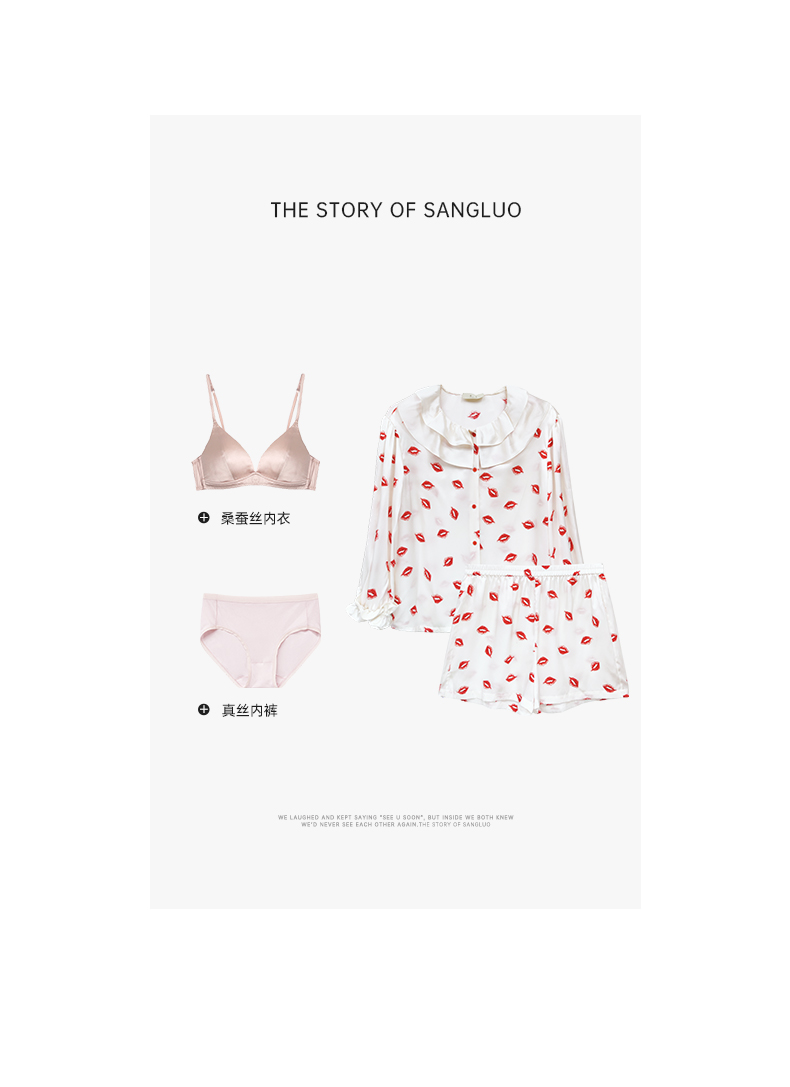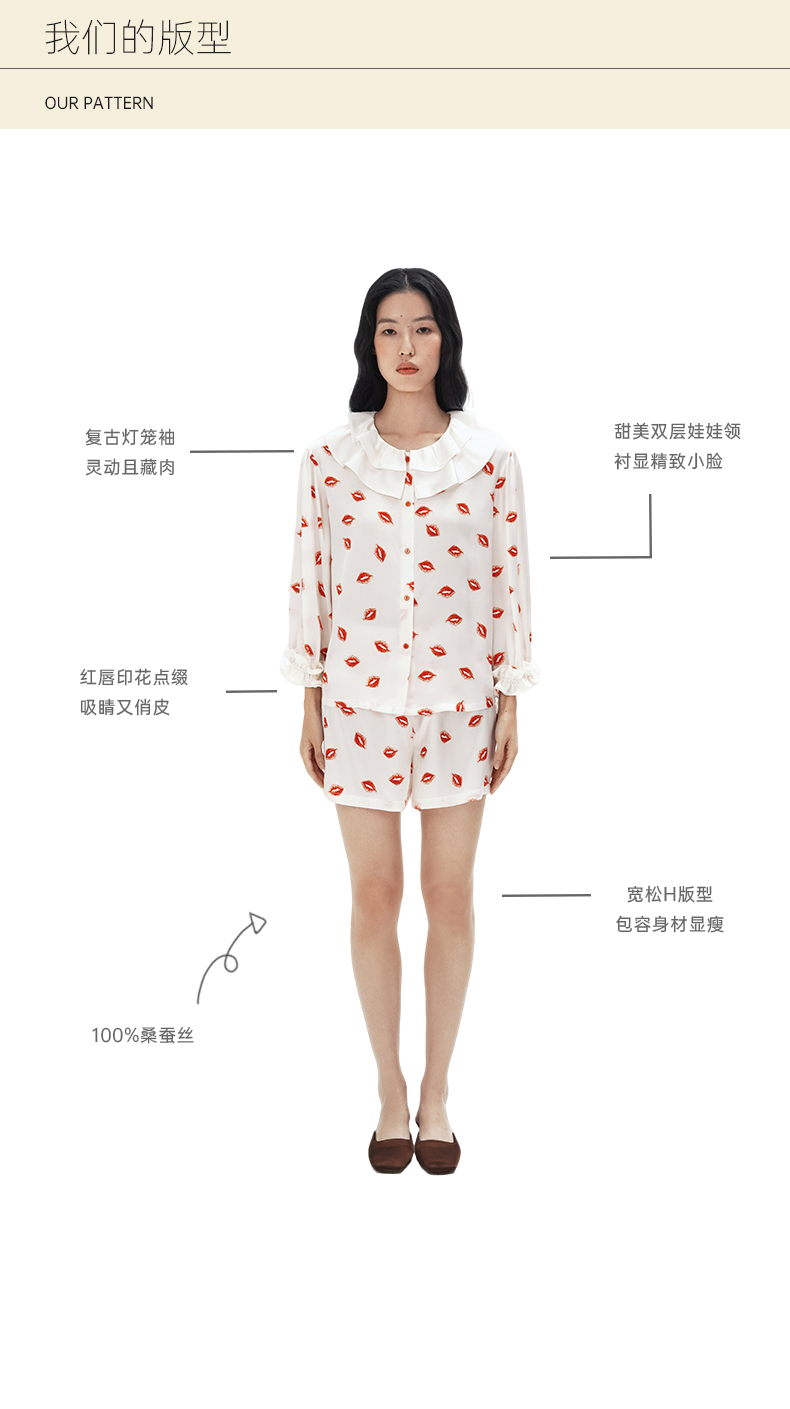 桑罗娃娃领真丝睡衣套装红唇印花100%桑蚕丝女家居服吊带裙可选