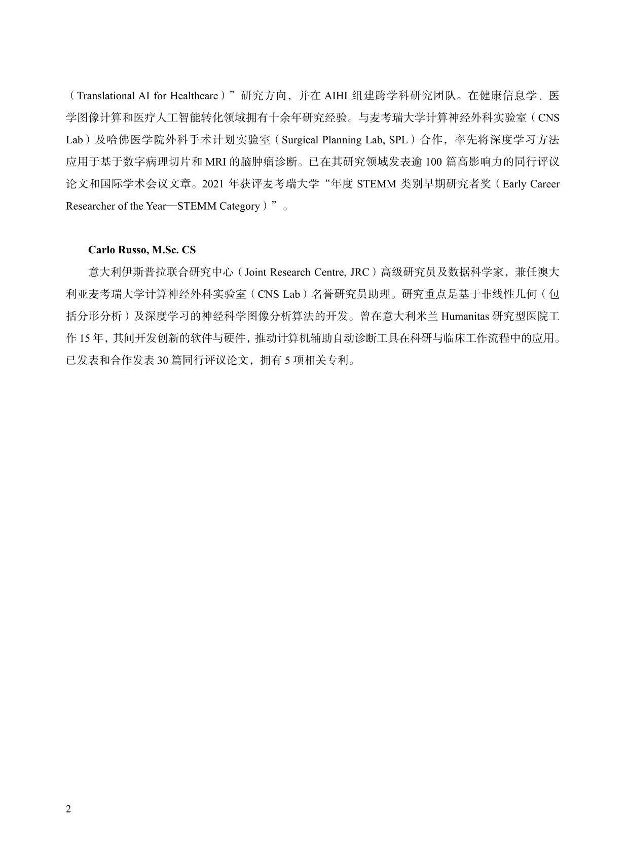 王引言 首都医科大学附属北京天坛医院神经外科主任医师,教授,博士生导师。国家级青年科技创新人才,北京市杰出青年,北京市科技新星。致力于脑胶质瘤智能外科诊疗技术研究,在术中重要功能区保护及超快速光学病理诊断方面取得了多项创新成果。以第一或通讯作者发表80 余篇同行评议论文,包括 Neuro-Oncology 在内的国际专业期刊封面论文7 篇,参与编写 5 部国家级临床诊疗指南和专家共识。获批9 项国家发明专利,其转化成果获得中国Ⅲ类医疗器械注册证。以第一发明人身份荣获日内瓦国际发明展金奖,获2024 年中国发明协会发明创业成果奖一等奖,Lucien Levy Best Research Article Award Nominees Named、中国脑胶质瘤手术比赛全国总冠军等多项荣誉。擅长将人工智能结合前沿光学诊断技术及脑网络分析技术,推动神经外科精准诊疗的临床转化与应用。多次主讲神经外科功能保护技术培训课程和研讨会,参与组织了连续3 届大脑半球功能解剖与胶质瘤手术技术高级研修班。参与筹划和执行建立了中国人脑功能图谱(China Functional Brain Atlas),为全球临床脑科学研究提供丰富的神经功能数据。