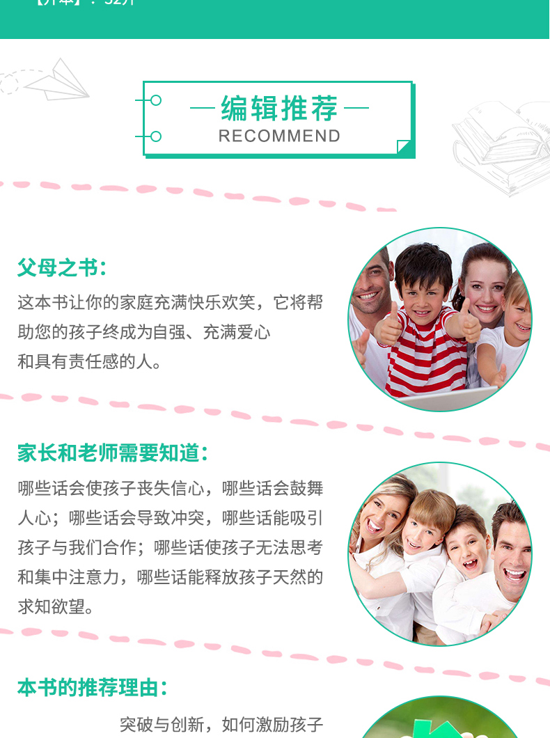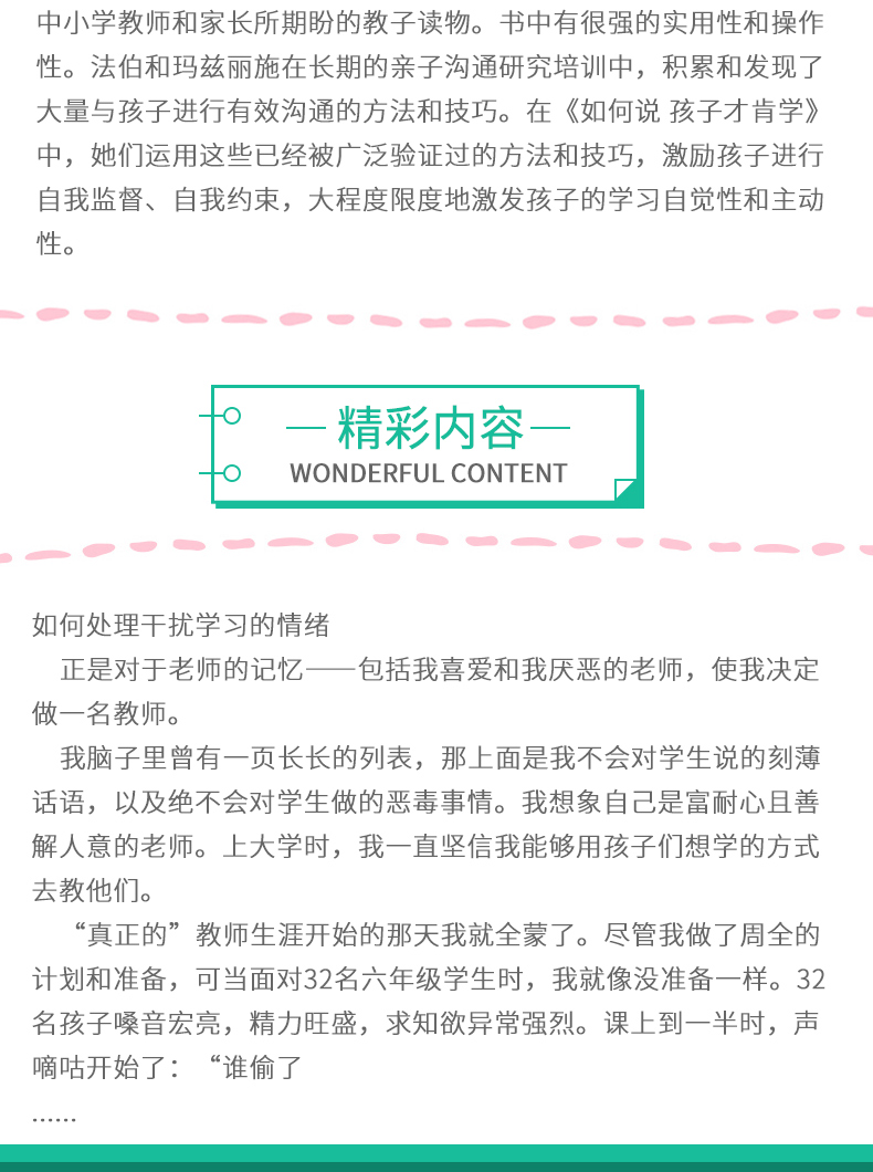 本书独创性的采用小说形式,主人公是一位经常遇到问题的年轻教师,她与同事以及父母志愿者一起,通过不断的探寻和讨论,努力寻找到一种与学生沟通的更有效的方法。的沟通技巧、实用的对话场景和令人一目了然的卡通漫画,让老师和家长很快便能领会如何帮助孩子面对每天在学习上出现的问题。比如,*章讨论了如何处理干扰学习的情绪。作者认为,我们想要让孩子行为正确,首先必须接受他们的感受。卡通漫画形象生动地展现了许多老师和家长对待孩子的错误方式,同时也给出了会让孩子有令人满意回应的新方法。那些错误的说话方式竟然是我们大多数家长与老师经常都在使用的,而的新方法往往都既实用又灵验,让家长和老师忍不住立刻仿效。
