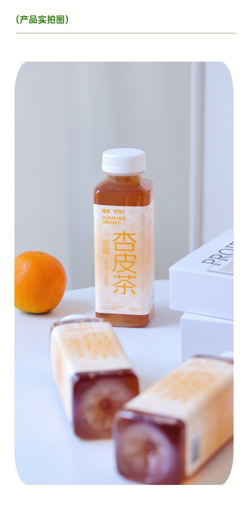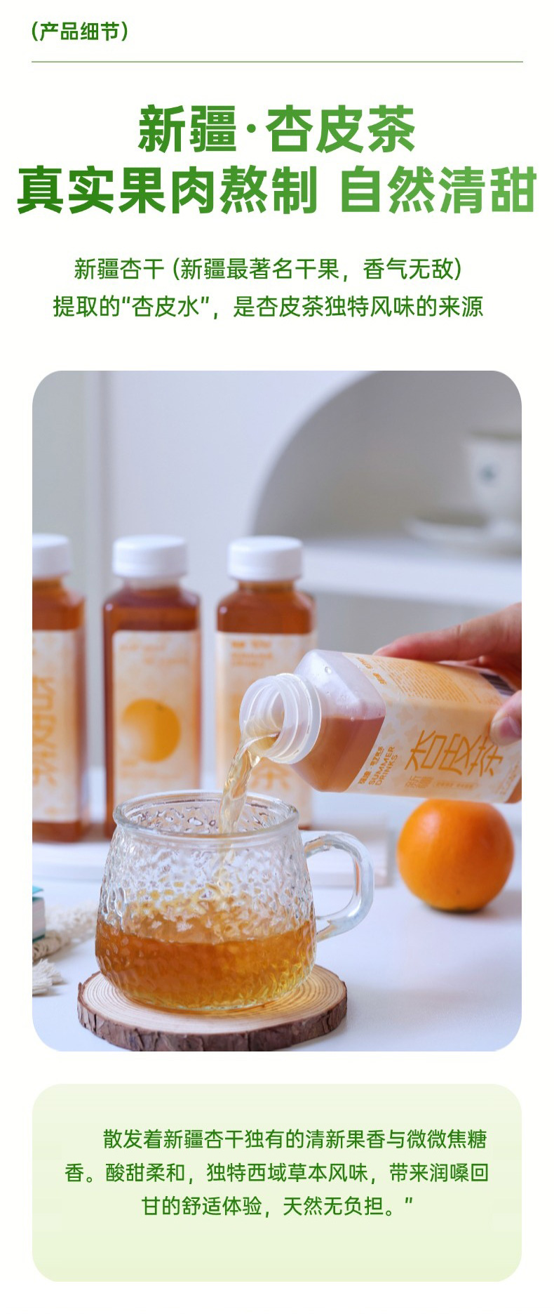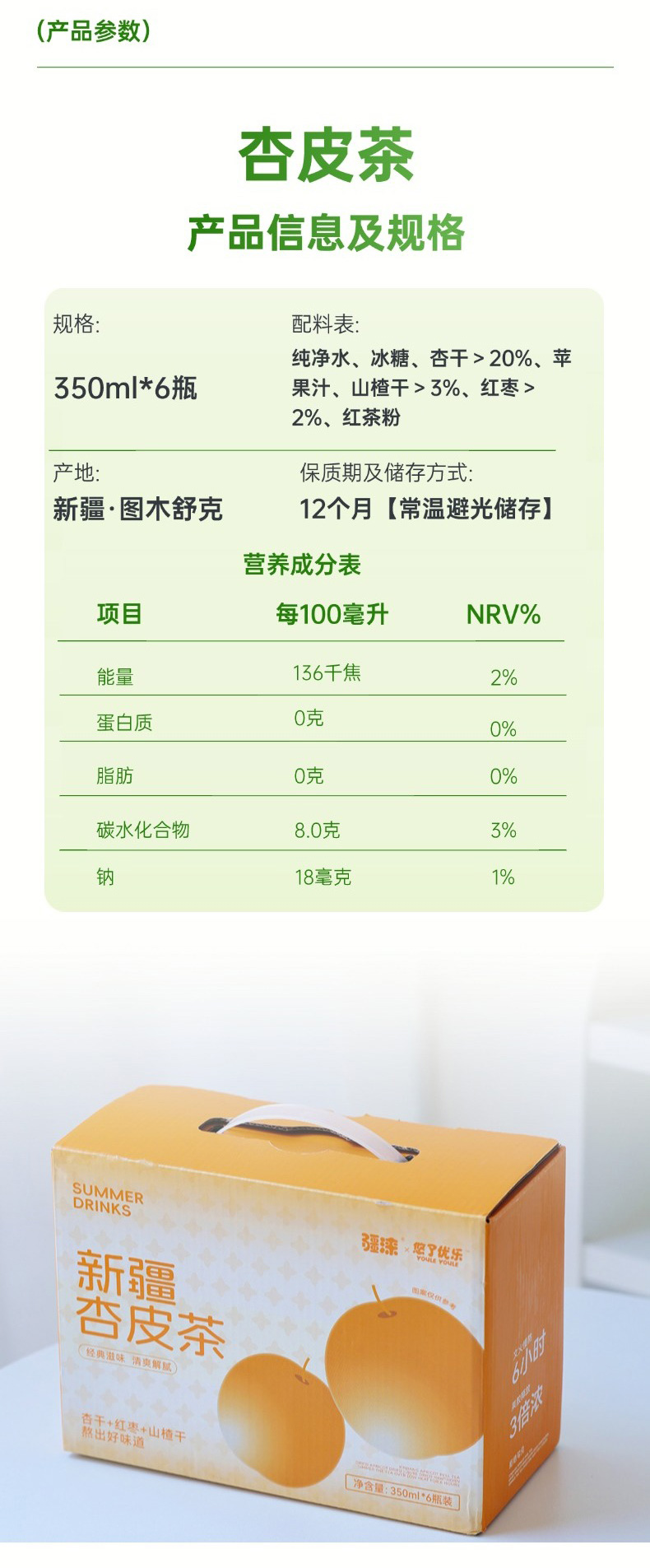 杏皮茶(加糖):纯净水、冰糖、杏干>20%,苹果汁、山楂干>3%,红枣>2%、红茶粉