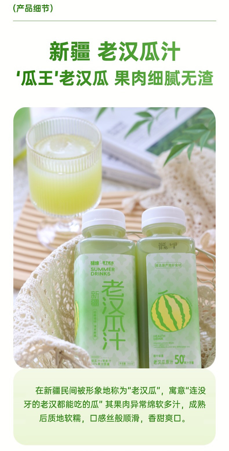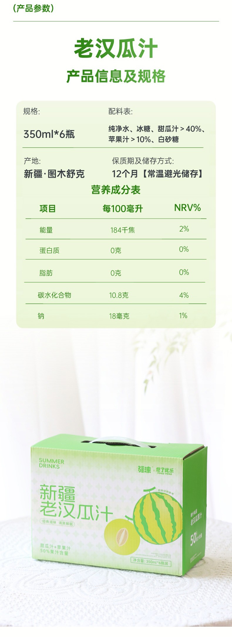 【配料】老汉瓜汁:纯净水、甜瓜汁>40%、苹果汁>10%、白砂糖