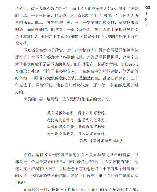 本书是以唐朝著名诗人元稹一生的创作与情感经历为线索的文学传记作品。书中讲述了元稹与白居易、刘禹锡等人的交往与诗词唱和,以及元稹与管儿、崔莺莺、薛涛、秋娘等红颜知己的情感纠葛。以优美的文字、丰富的史料、传奇的演绎,生动勾勒大唐才子、也是;千古痴情人元稹一生的精彩图景。