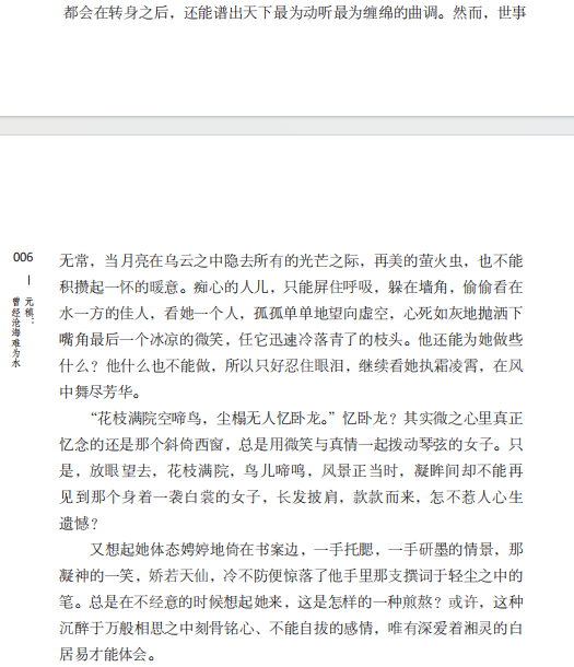 文风温婉空灵、清新淡雅,以细腻婉约、情深意切为特点,颇得花间词派余风,被读者推崇为;新花间派掌门;中国最美诗词解析第一人。