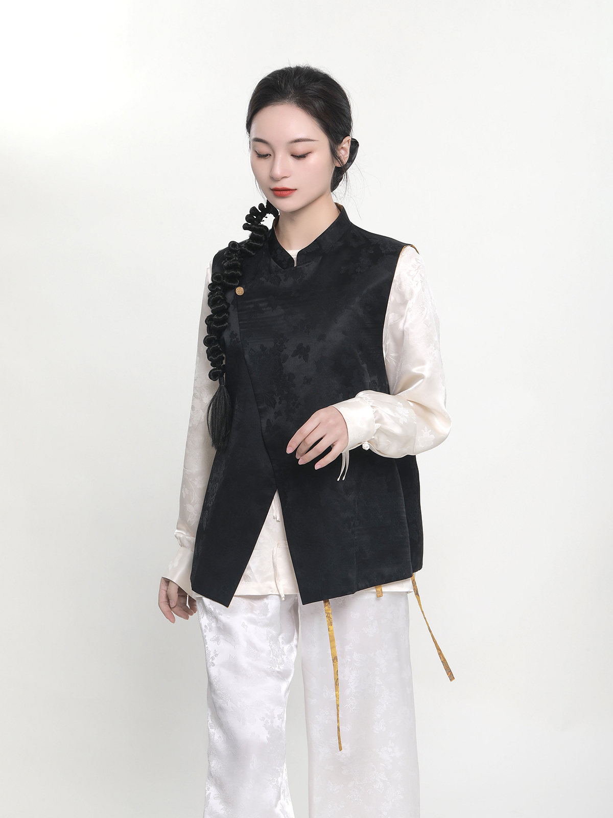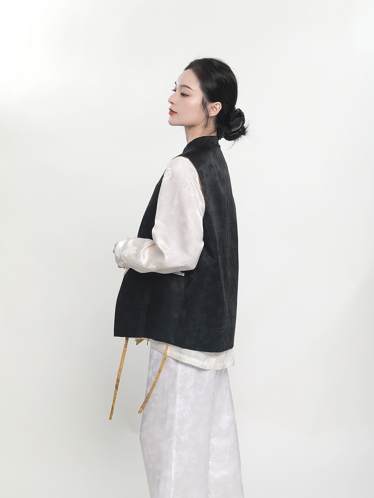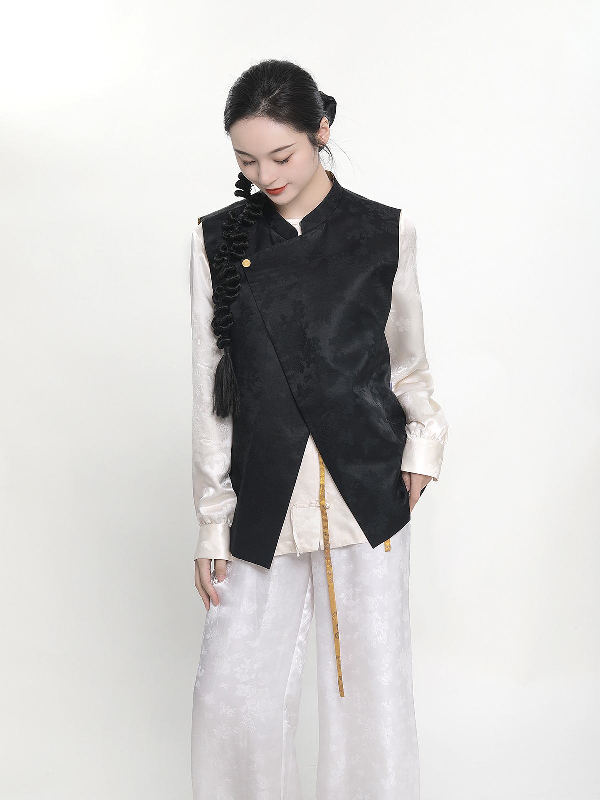 瑕疵| 盛唐牡丹 |花香引蝶真丝宋锦新中式马甲正反两穿(内衬布料随机搭配:黑色蝶恋花内衬或黑色清明上河图内衬)[特价品]](特殊商品不退不换)