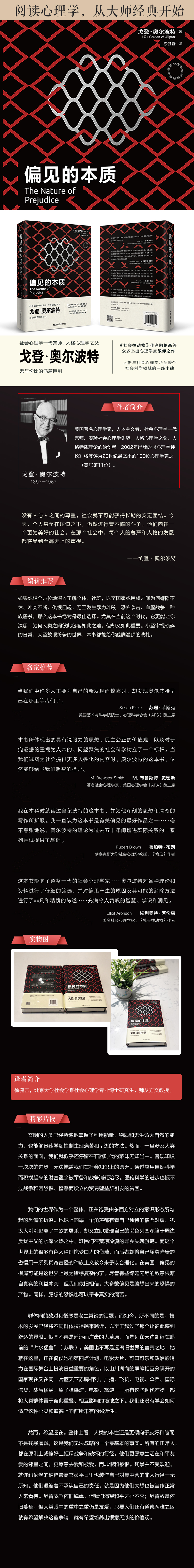 本书所体现出的具有说服力的思想、民主公正的价值观,以及对研究证据的重视为人本的、问题聚焦的社会科学树立了一个标杆。当我们试图为社会提供更多人性化的内容时,奥尔波特的这本书,依然能够给予我们明智的指导。