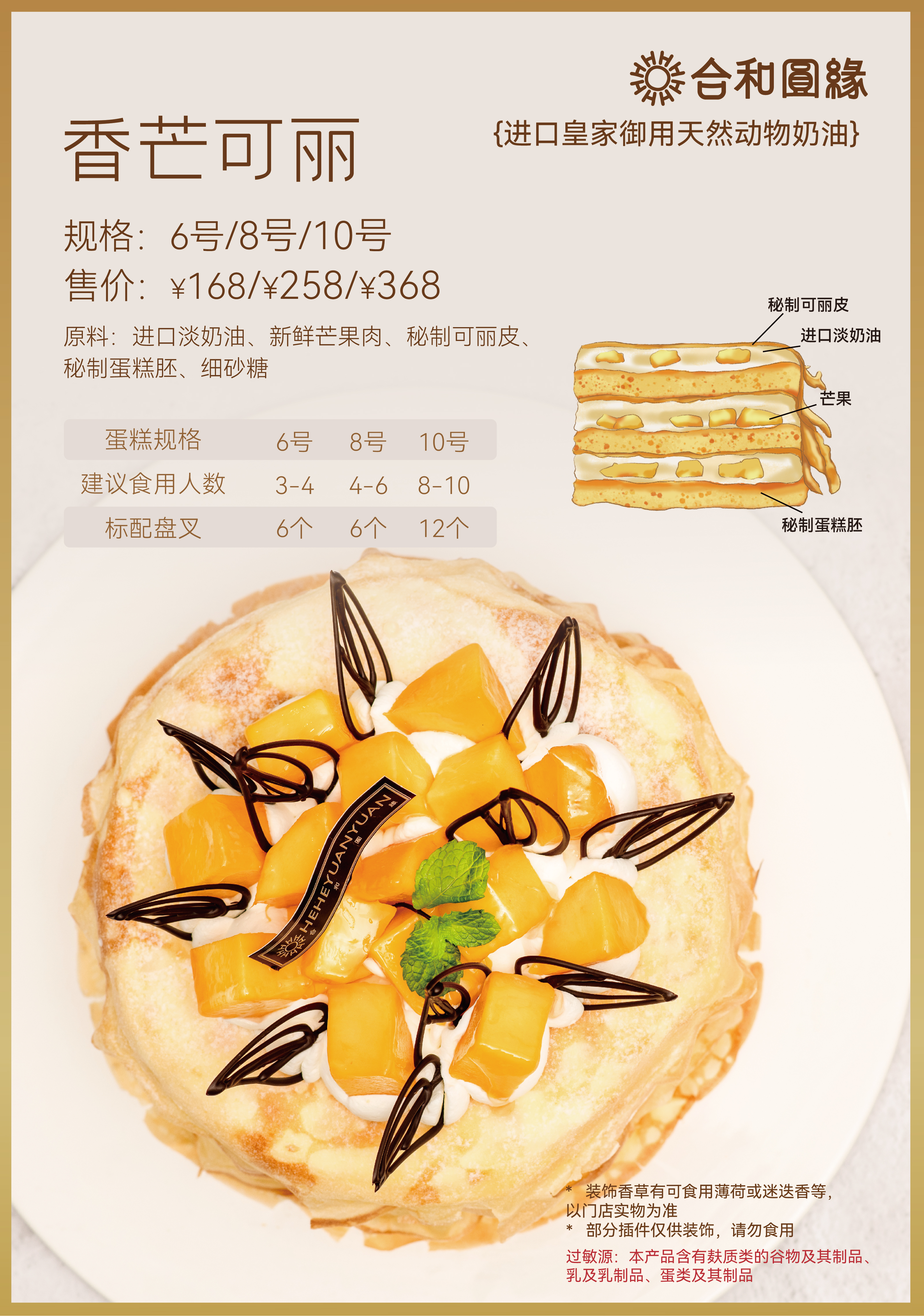 【主要配料】:新鲜芒果肉、秘制可丽饼皮、进口动物奶油、秘制蛋糕胚
