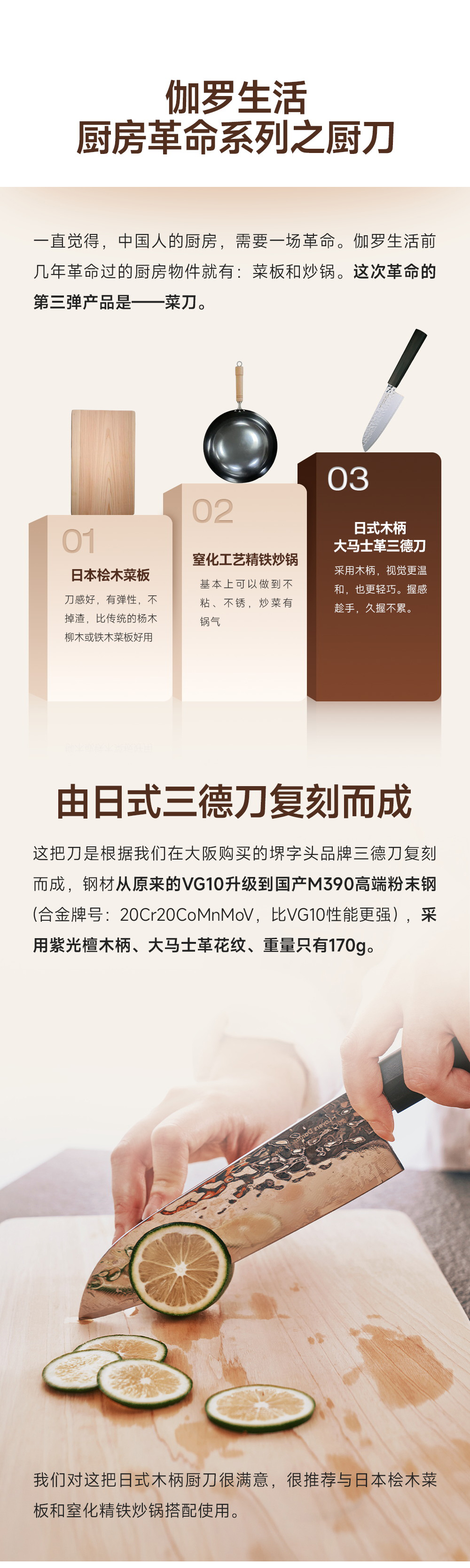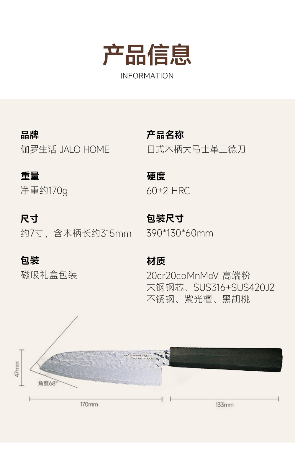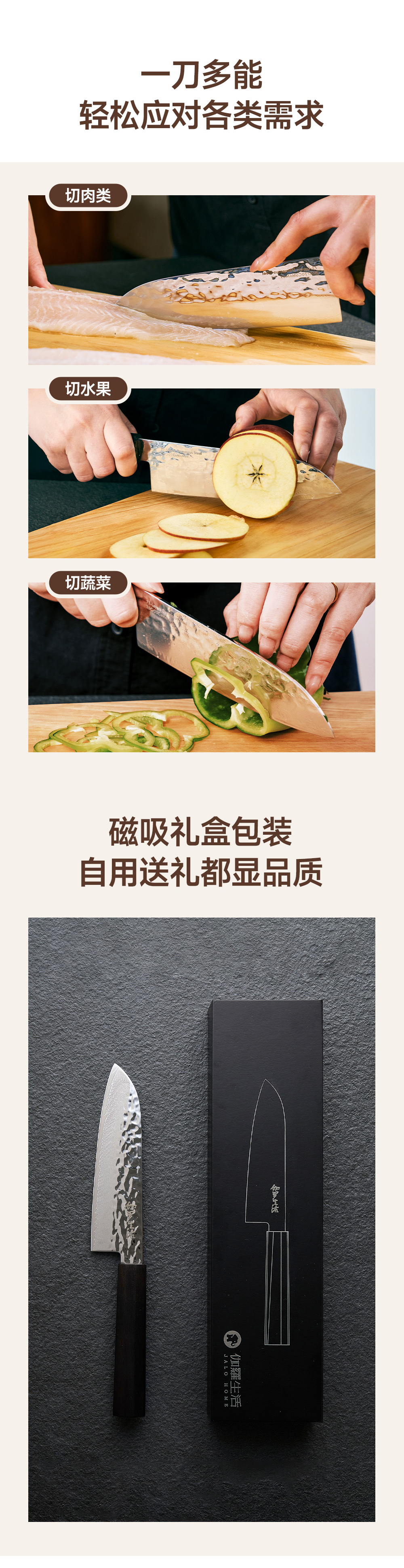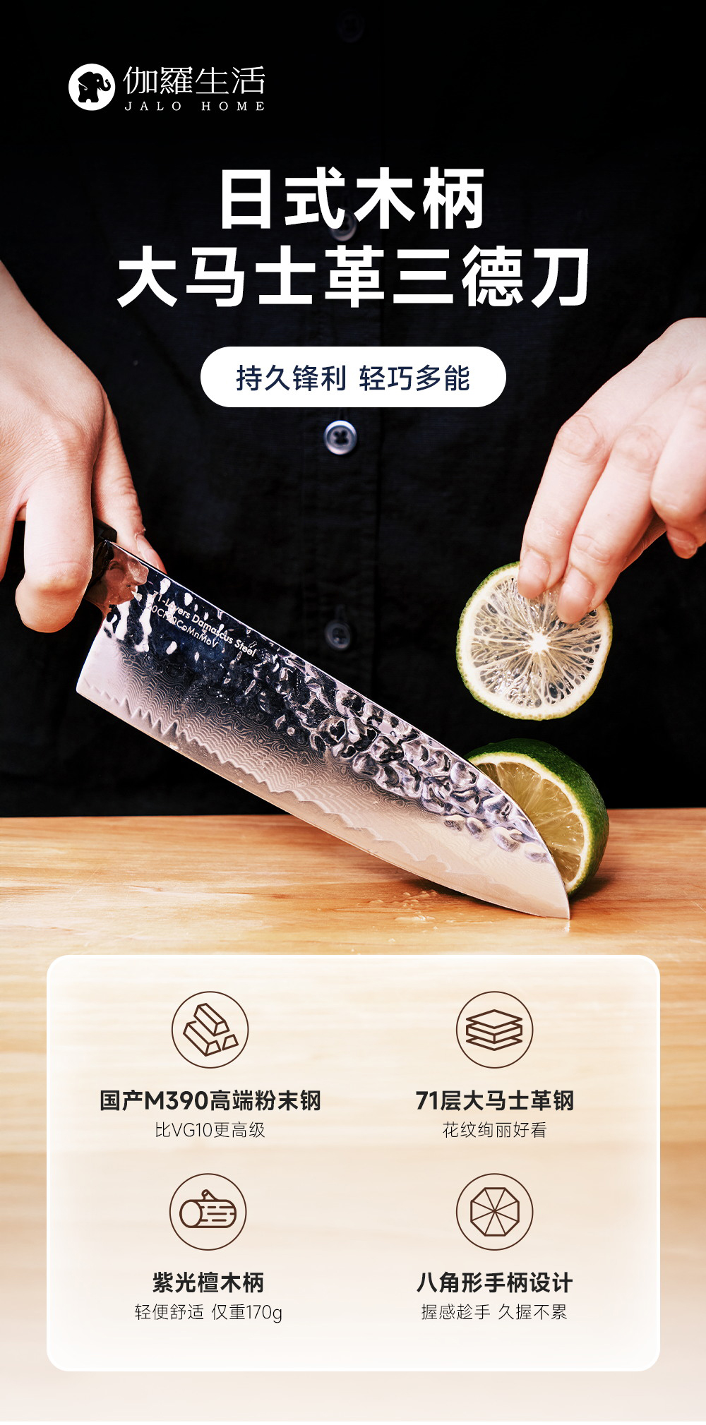 伽罗 JALO 日式木柄大马士革三德刀