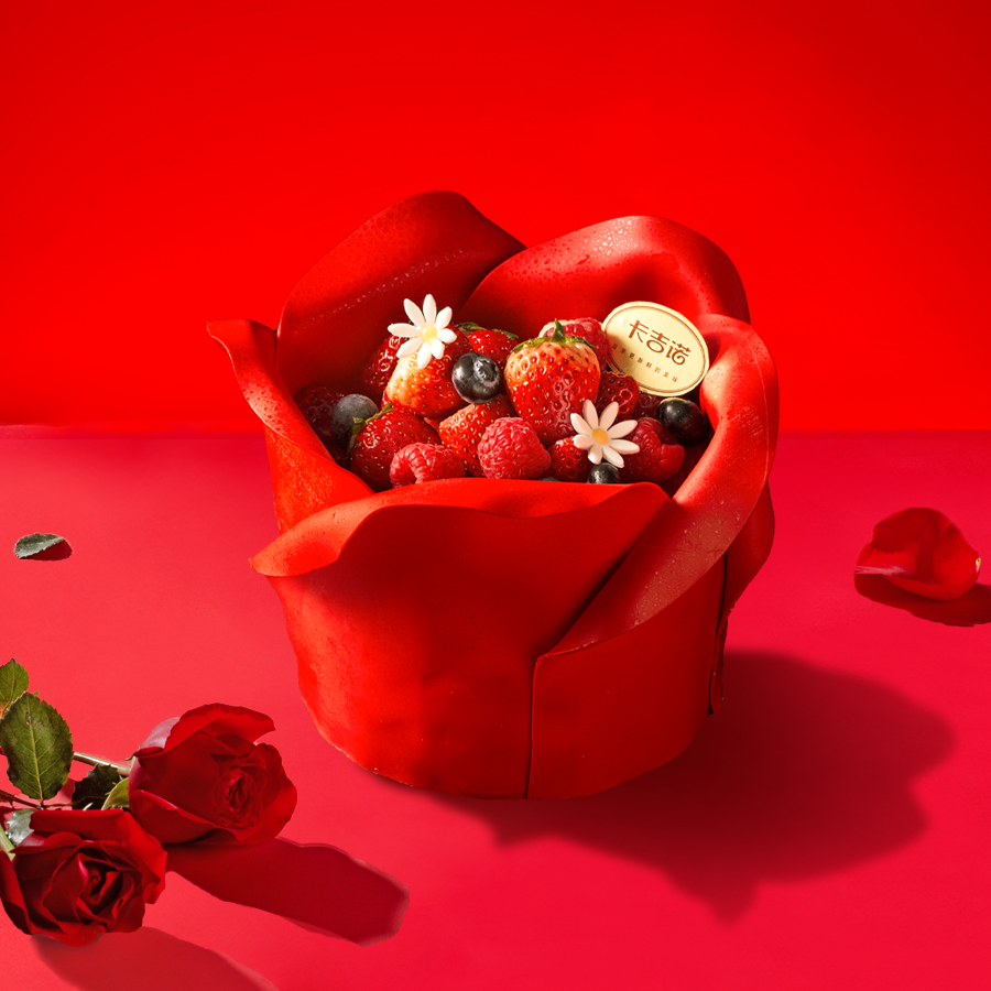 原味戚风胚+草莓果馅+玫瑰翻糖围边