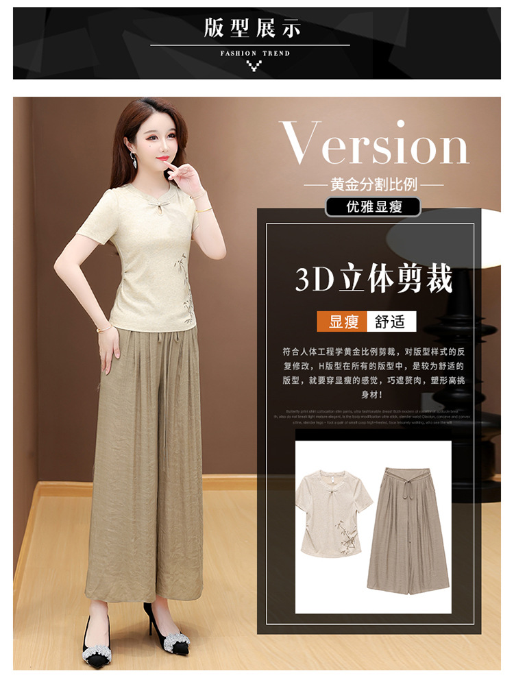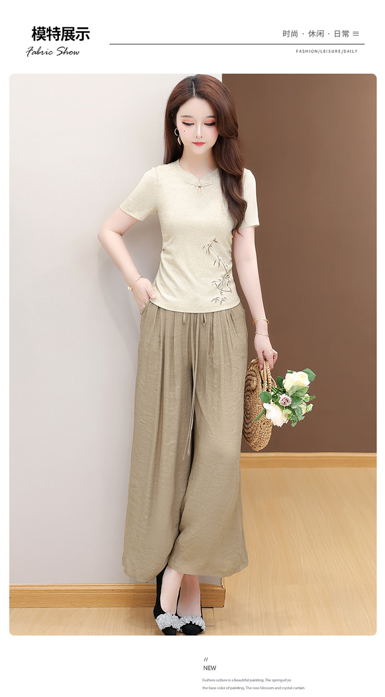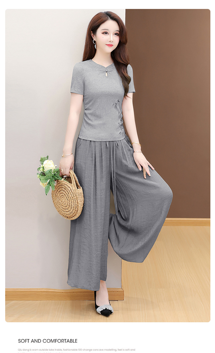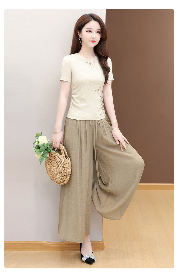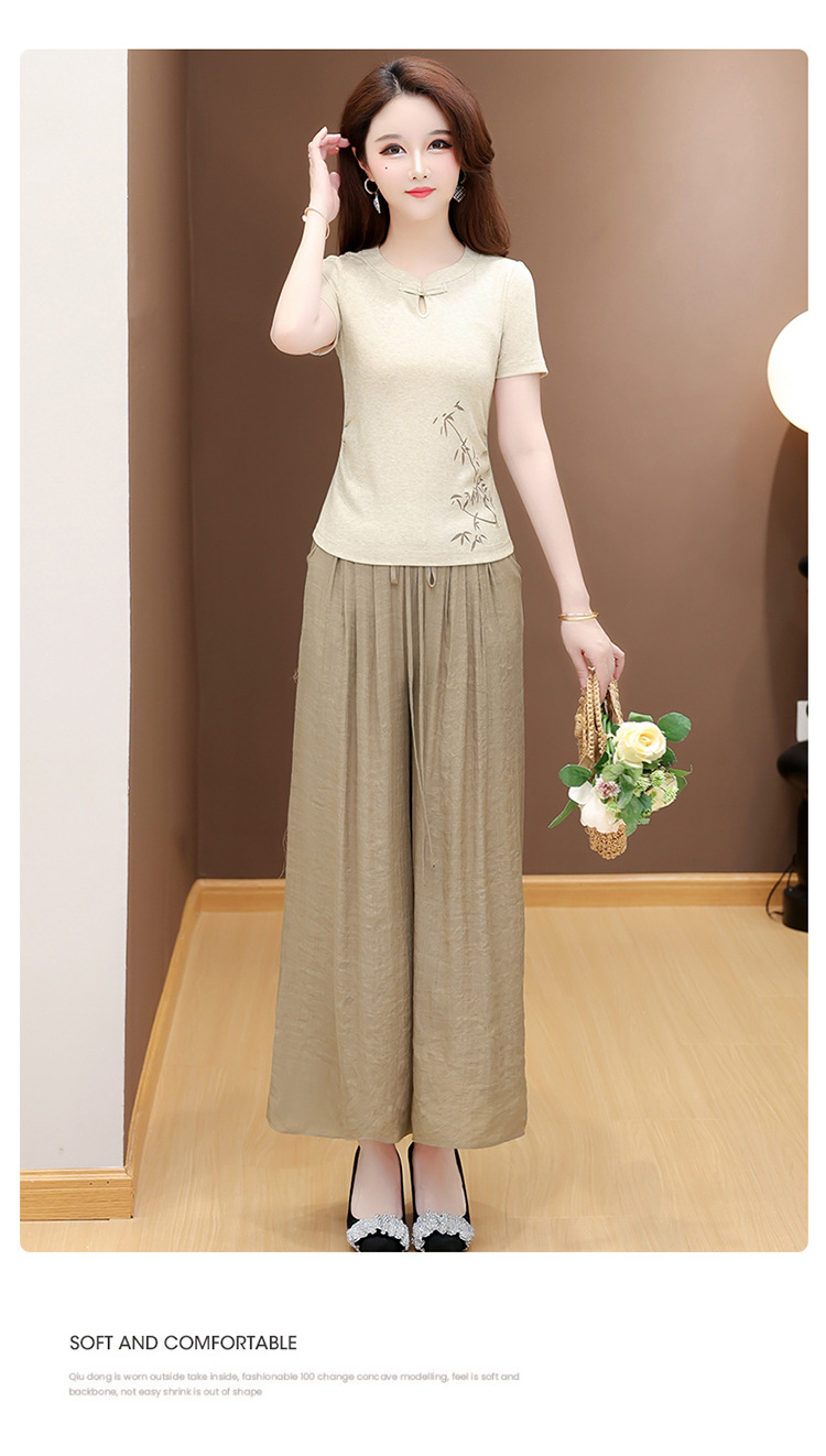 QYMYJ-25DA45-L 2025年夏款新中式复古短袖T恤衫松紧腰垂感休闲阔腿裤时尚两件套 商品图0