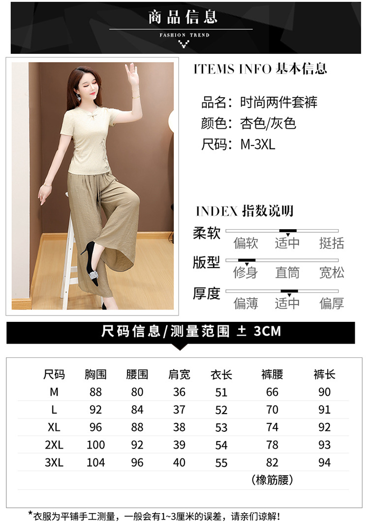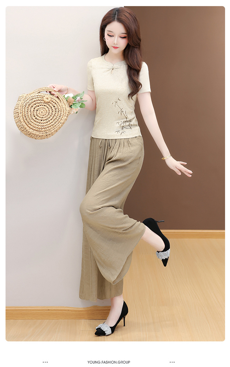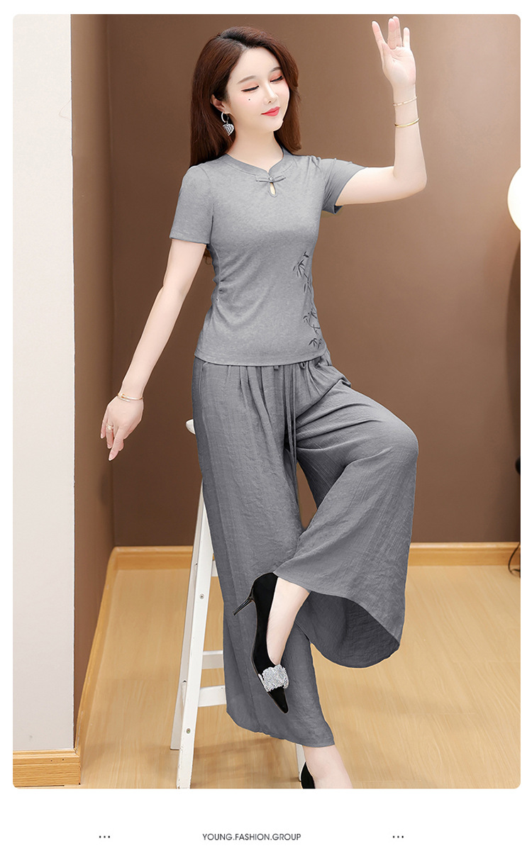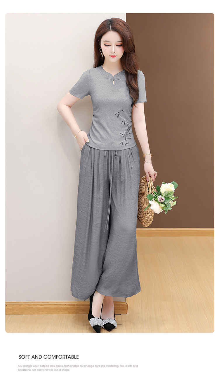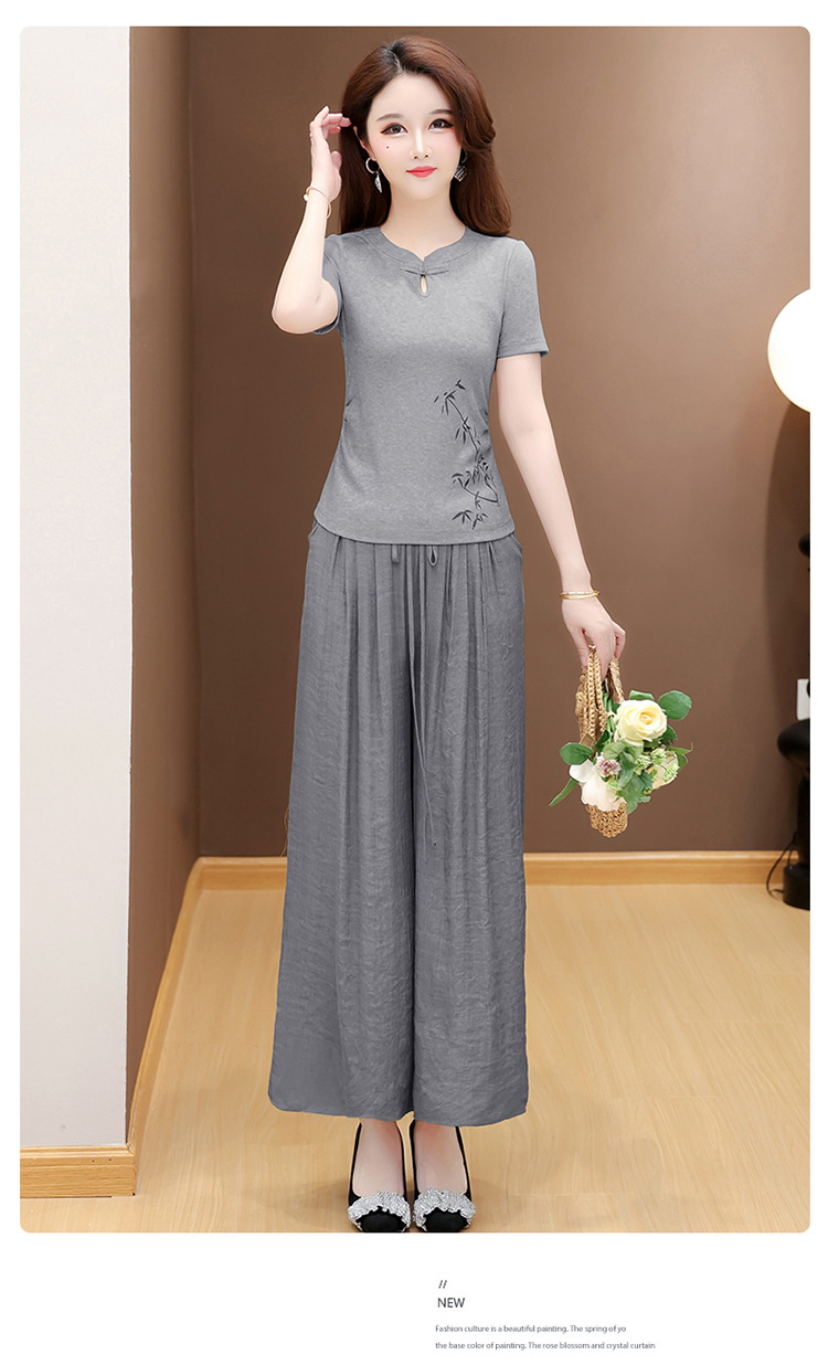 QYMYJ-25DA45-L 2025年夏款新中式复古短袖T恤衫松紧腰垂感休闲阔腿裤时尚两件套 商品图0