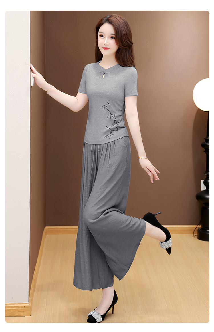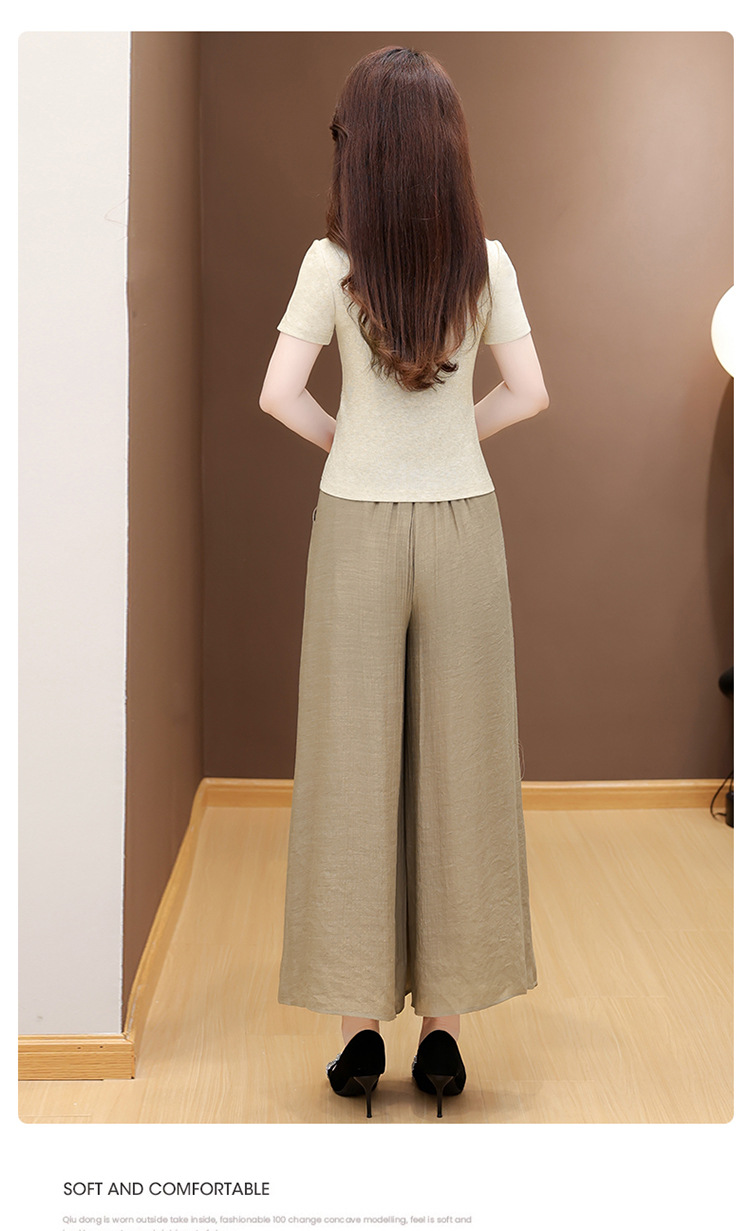 QYMYJ-25DA45-L 2025年夏款新中式复古短袖T恤衫松紧腰垂感休闲阔腿裤时尚两件套 商品图1