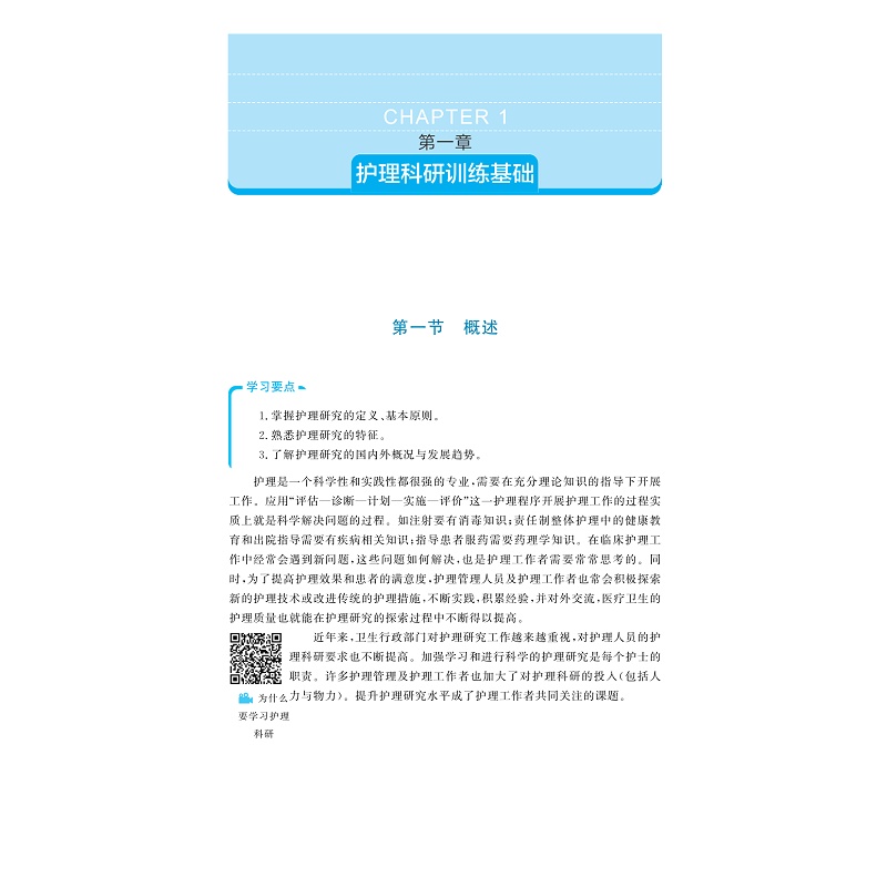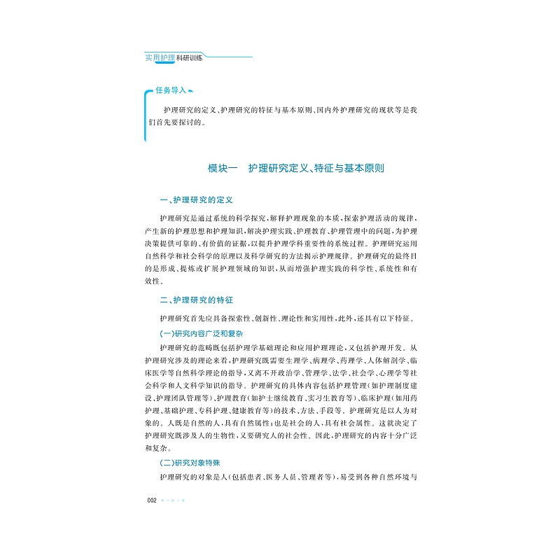 教材编写体现先进性、科学性、启发性和实用性。共分四大部分,diyi部分为护理科研训练基础篇,是教材的重点,主要对护理科研选题、文献检索、护理研究设计、护理研究样本、资料收集与整理、护理研究资料统计及科研诚信进行介绍。第二部分为护理科研训练实战篇,也是本教材重点,以论文撰写为主题,介绍如何在科研资料收集的基础上进行论文撰写,包括护理研究统计表与统计图、参考文献选择与使用、论文种类与基本格式、论著类论文撰写,同时对主要护理类杂志进行介绍,指导如何投稿。第三部分对护理科研项目常见申请书及申请书撰写作简要介绍。第四部分为知识链接重点对SPSS统计软件应用进行介绍。