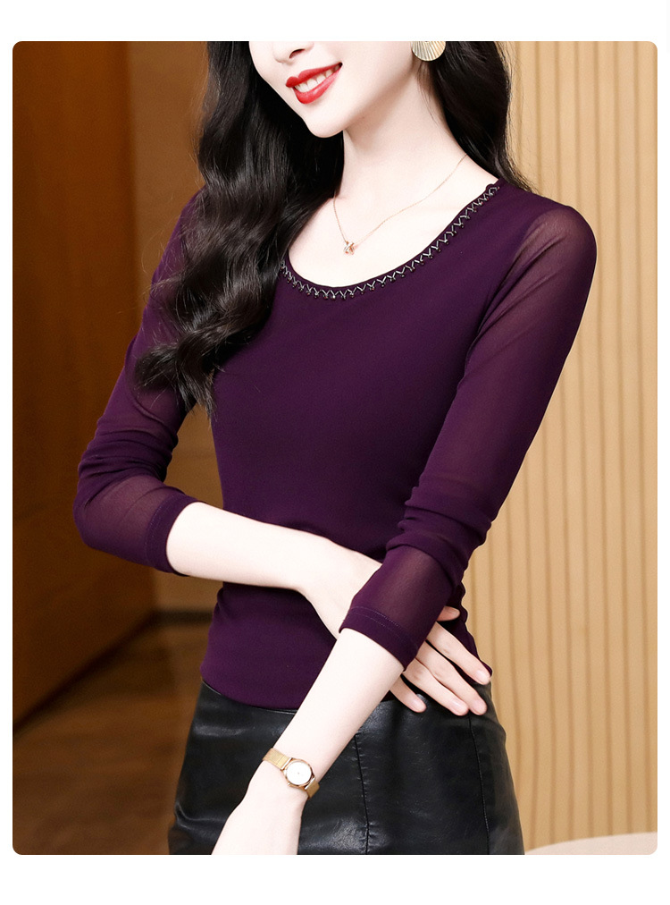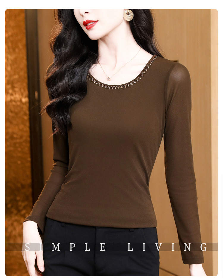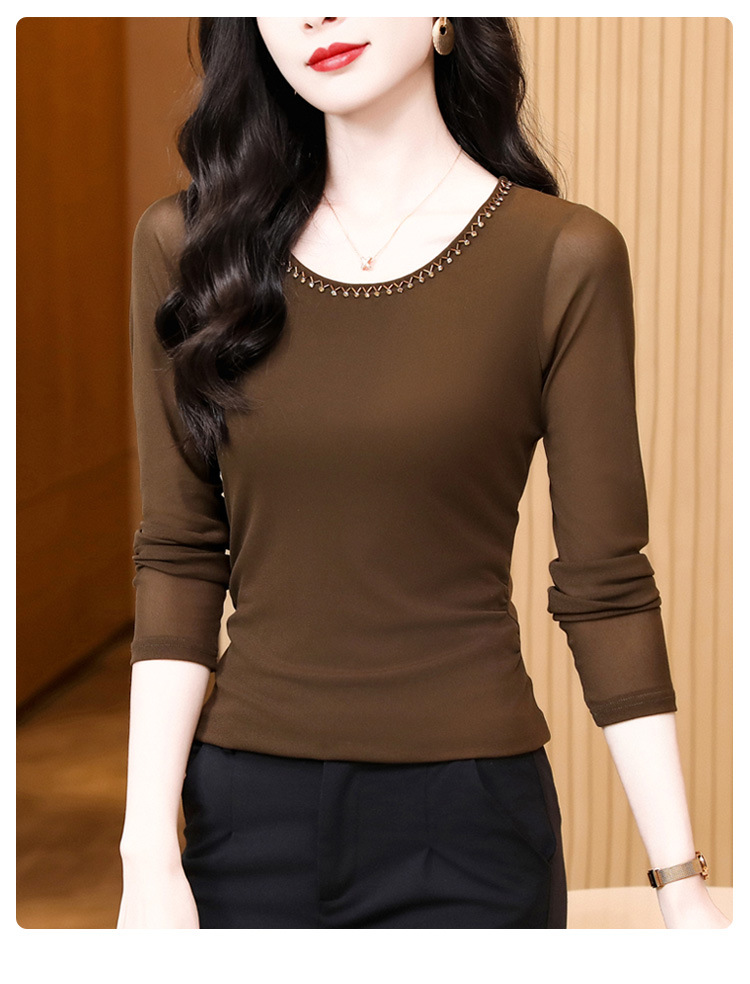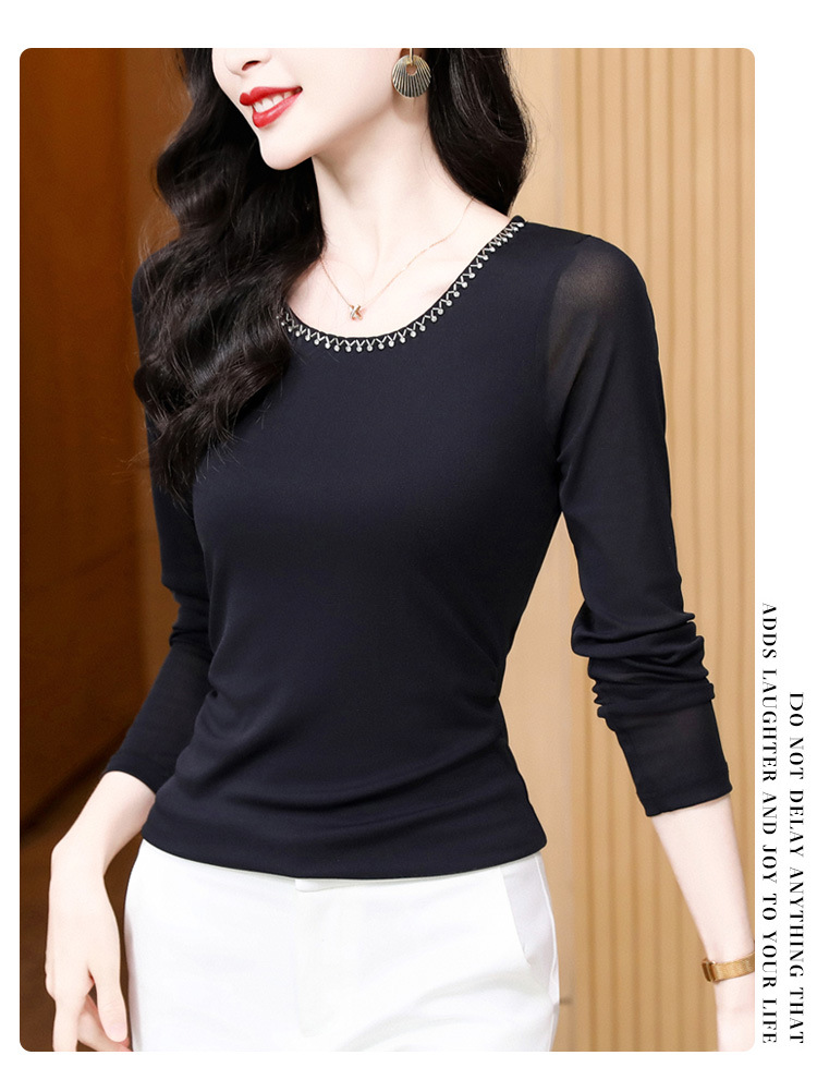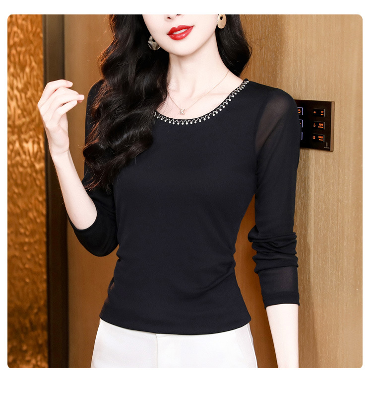 KQL E37M2835洋气百搭钉珠纯色网纱打底衫修身显瘦T恤