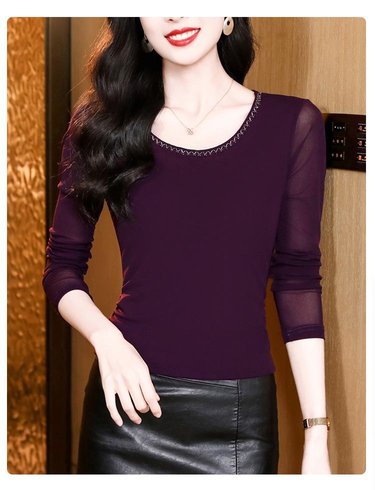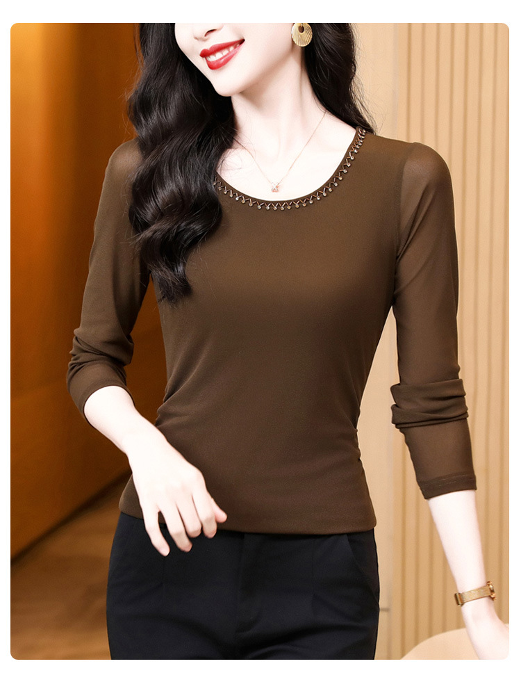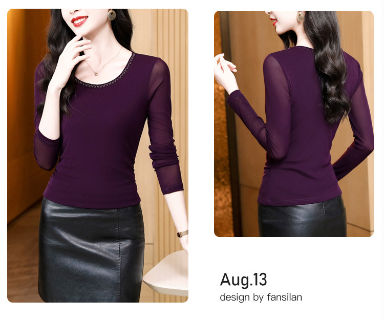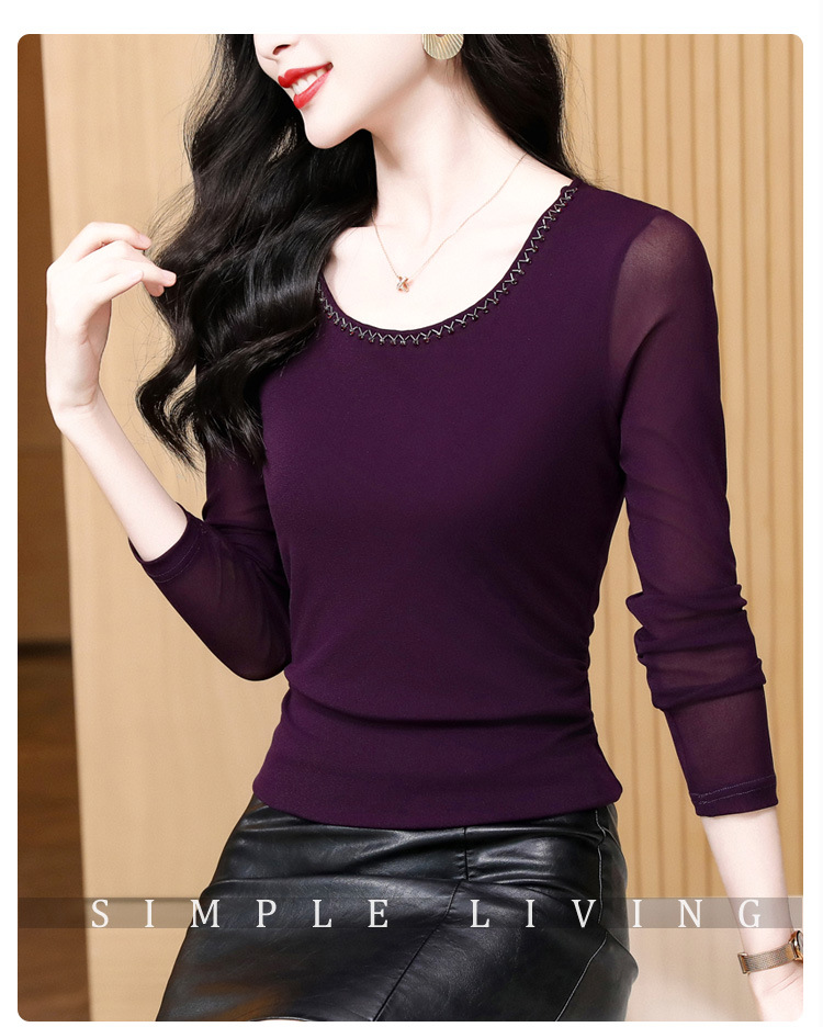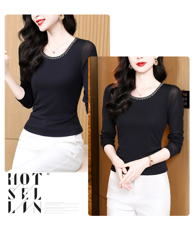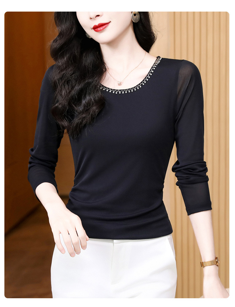 KQL E37M2835洋气百搭钉珠纯色网纱打底衫修身显瘦T恤