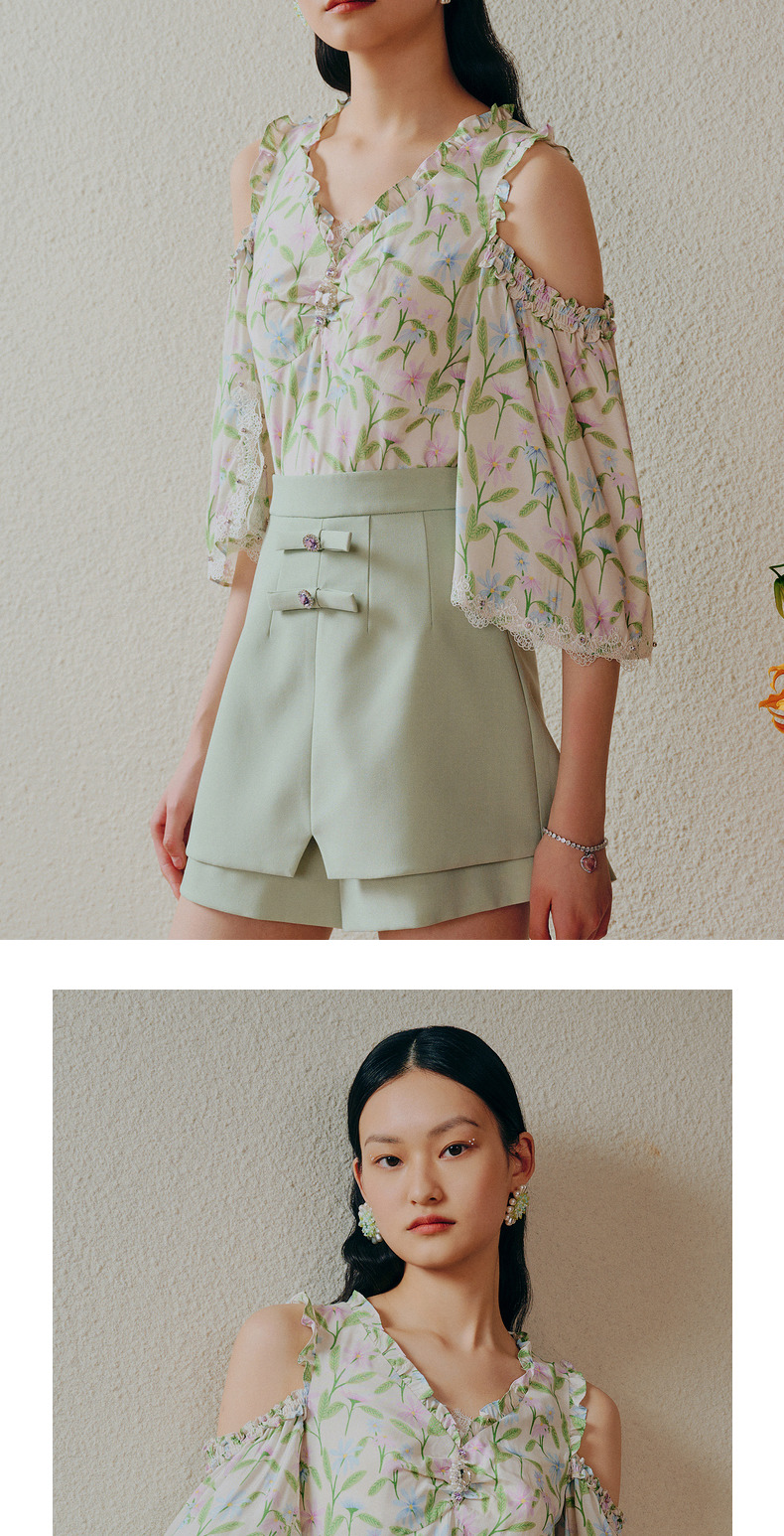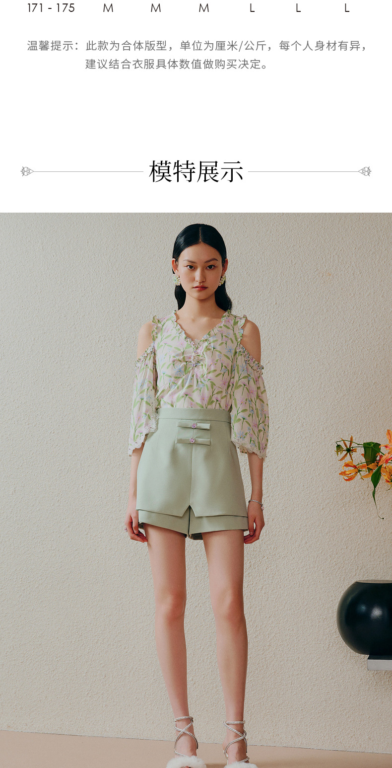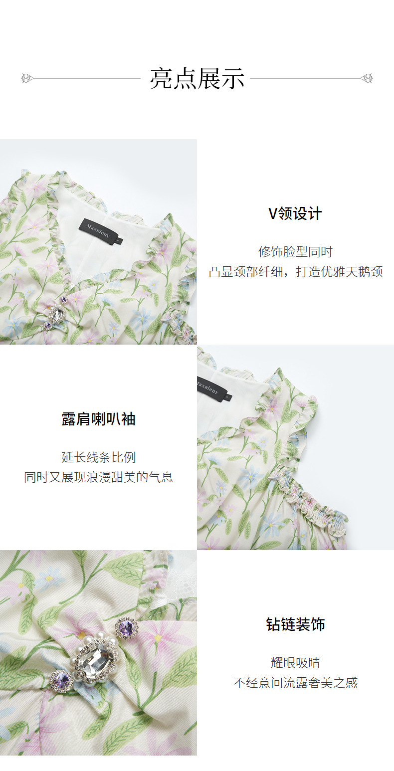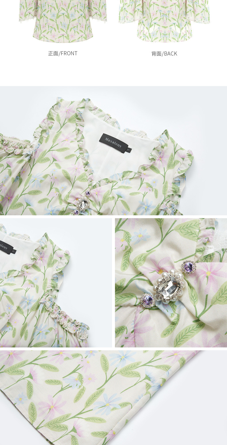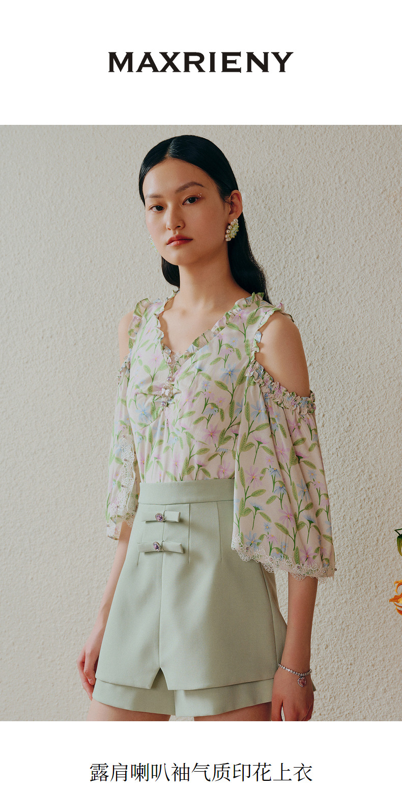 MAXRIENY薄荷曼波风喇叭袖雪纺衫田园风印花上衣(货号:MC88TP351)