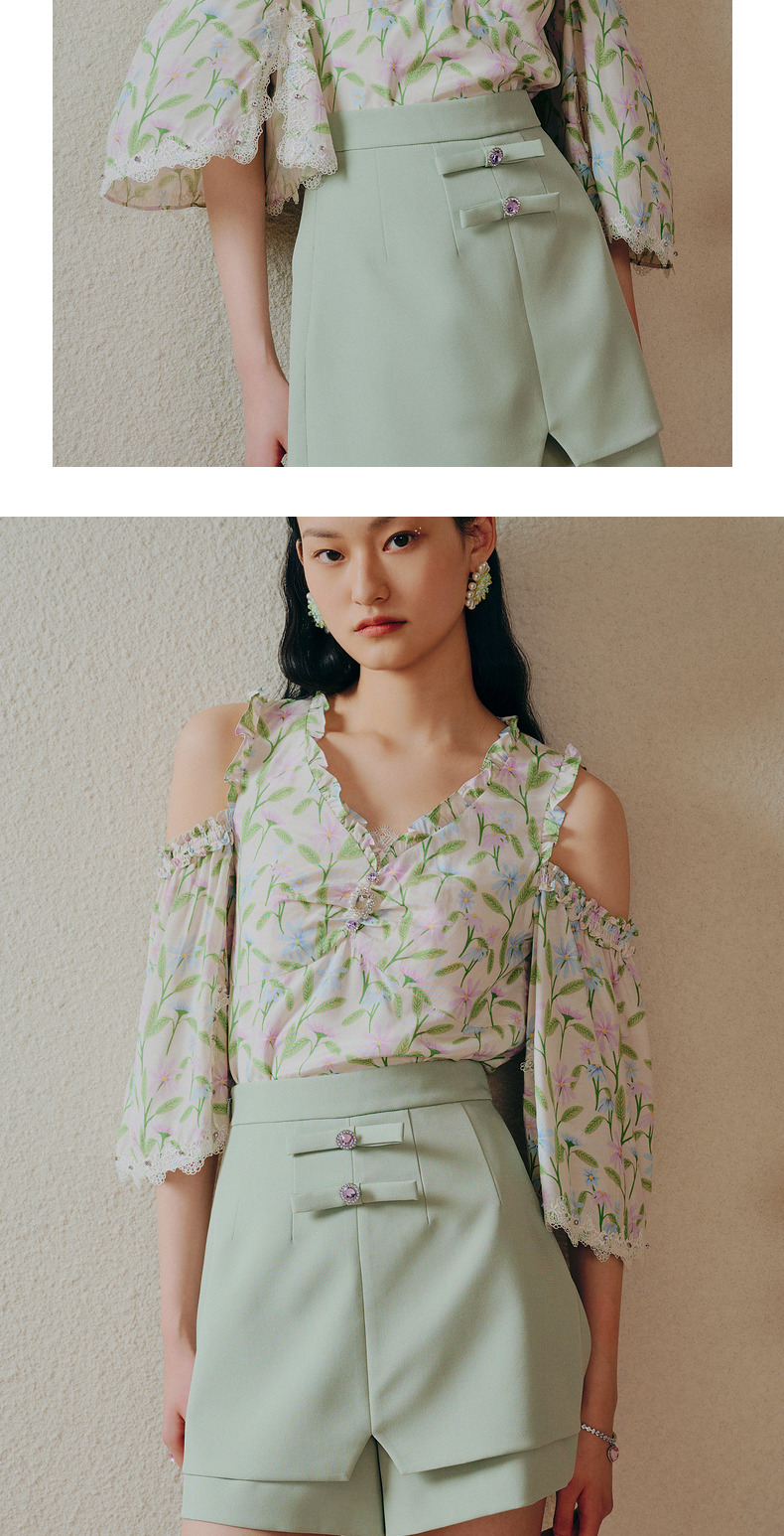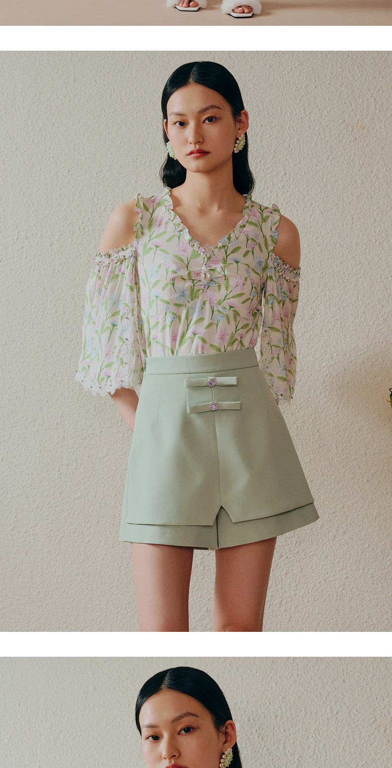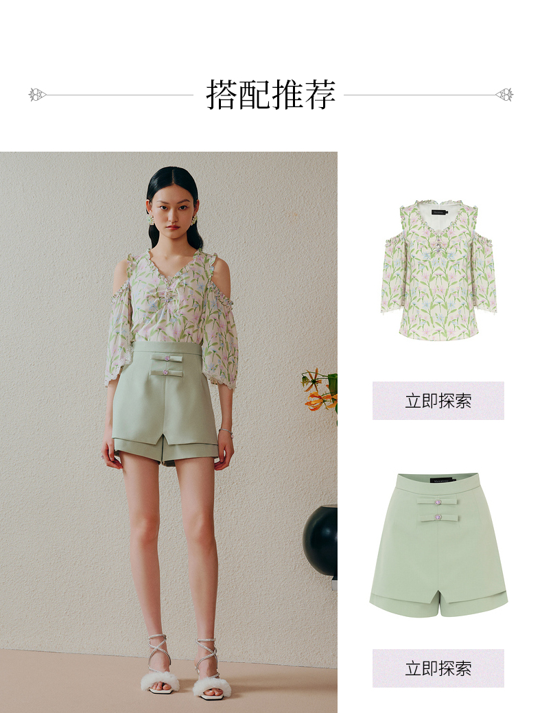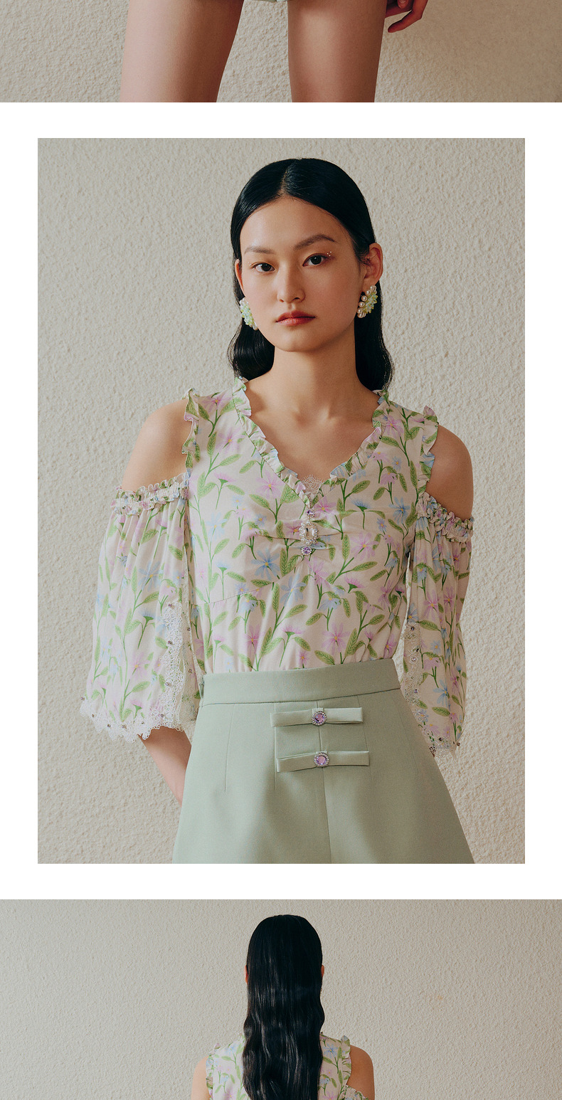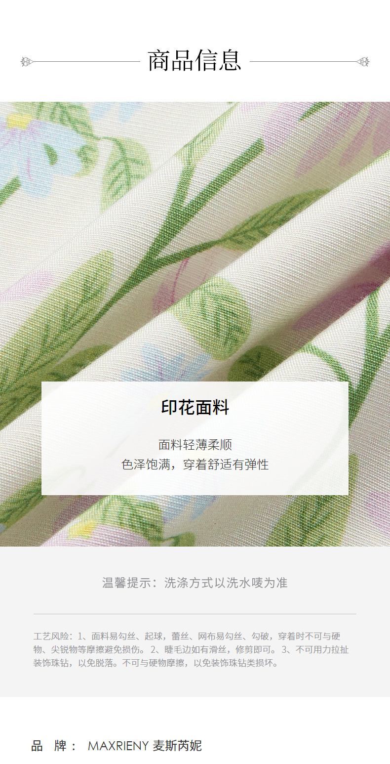 MAXRIENY薄荷曼波风喇叭袖雪纺衫田园风印花上衣(货号:MC88TP351)